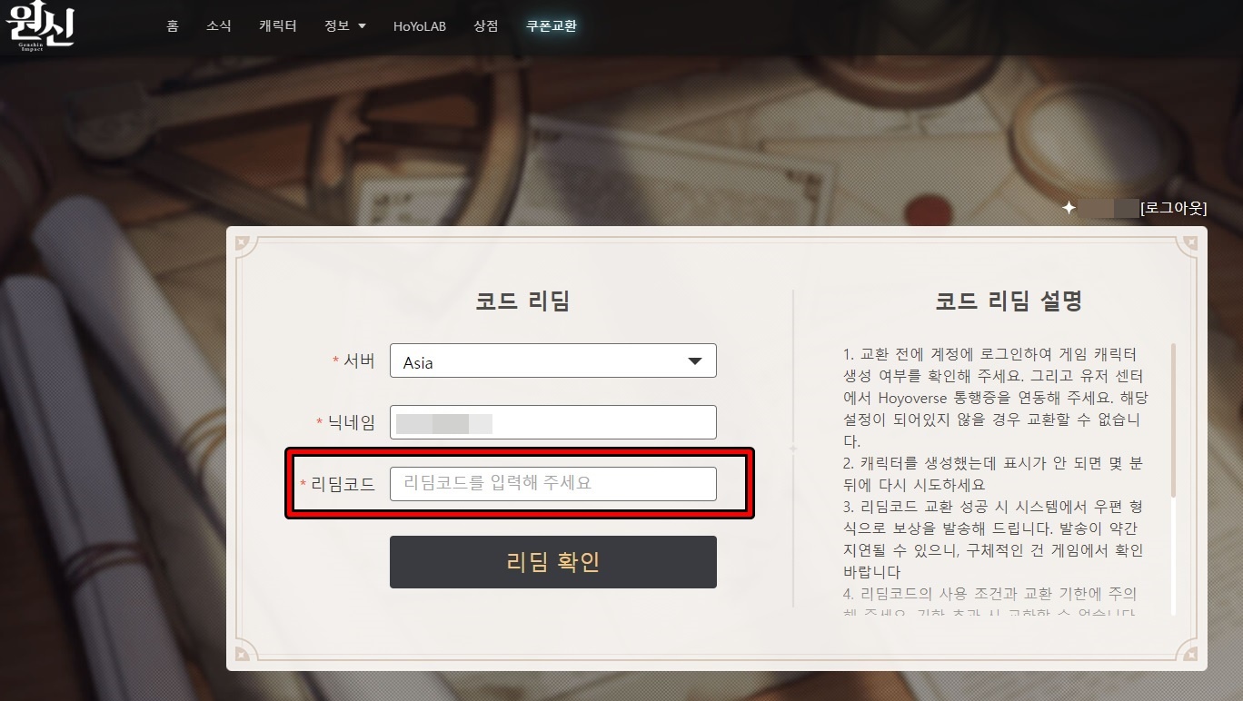 그 다음 코드 리딤에서 서버, 닉네임을 확인 한 후 리딤코드 입력칸에 해당 리딤코드를 입력하고 리딤 확인 버튼을 클릭하세요.