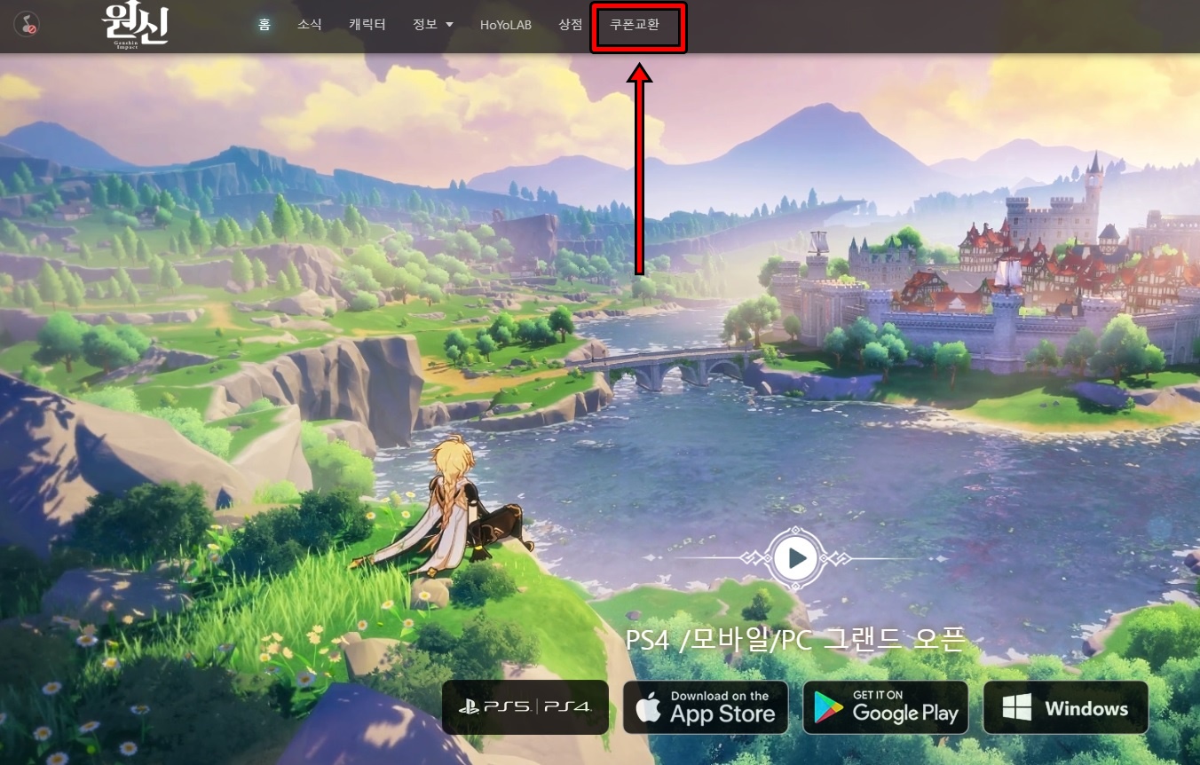 우선 원신 홈페이지로 이동하여 로그인을 한 후, 위쪽 메뉴에서 제일 오른쪽에 있는 <쿠폰교환>을 클릭하세요.