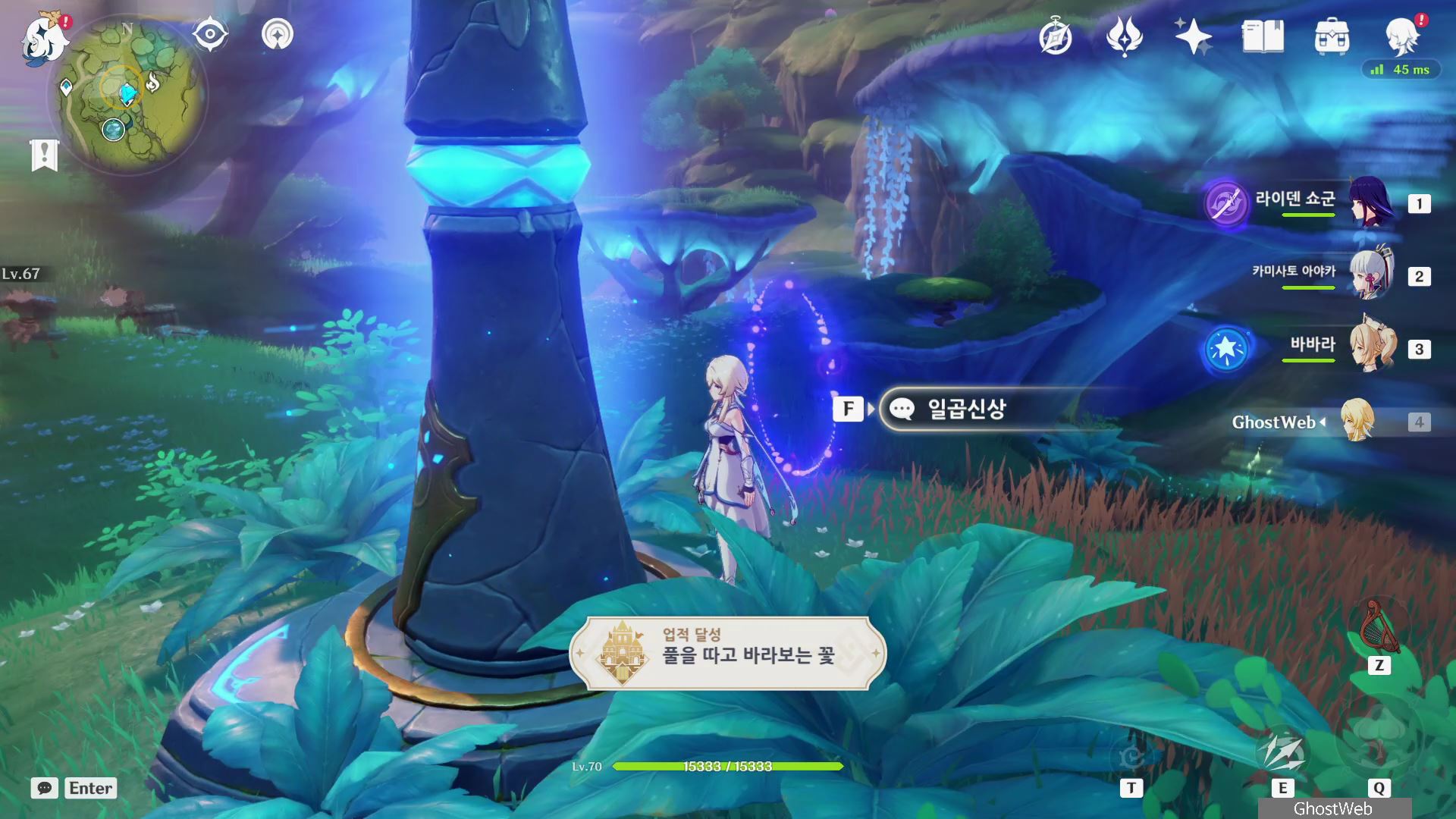 여행자의 원소 타입을 풀 원소로 변경하기 위해서는 여행자 캐릭터로 수메르 지역에 있는 일곱 신상(풀의 신상)과 상호 작용을 하면 나오는 선택지에서 <풀 원소와 공명>을 선택하면 여행자의 원소 타입이 풀 원소로 변경되며, <풀을 따고 바라보는 꽃> 업적을 달성할 수 있어요.