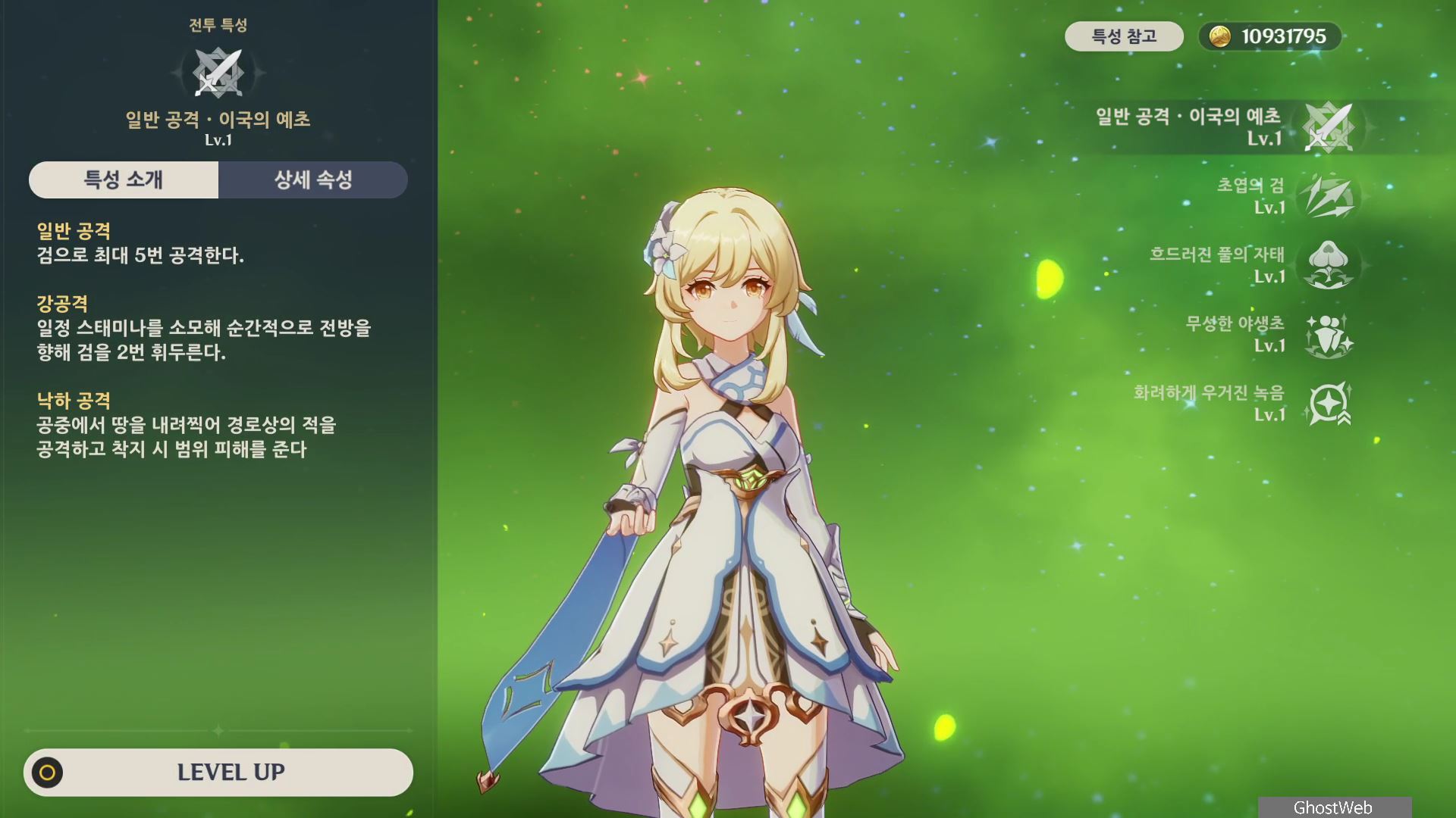 - 여행자 자신의 원소 마스터리 1pt당 초엽의 검으로 가하는 피해가 0.15% 증가하고 흐드러진 풀의 자태로 가하는 피해가 0.1% 증가한다.