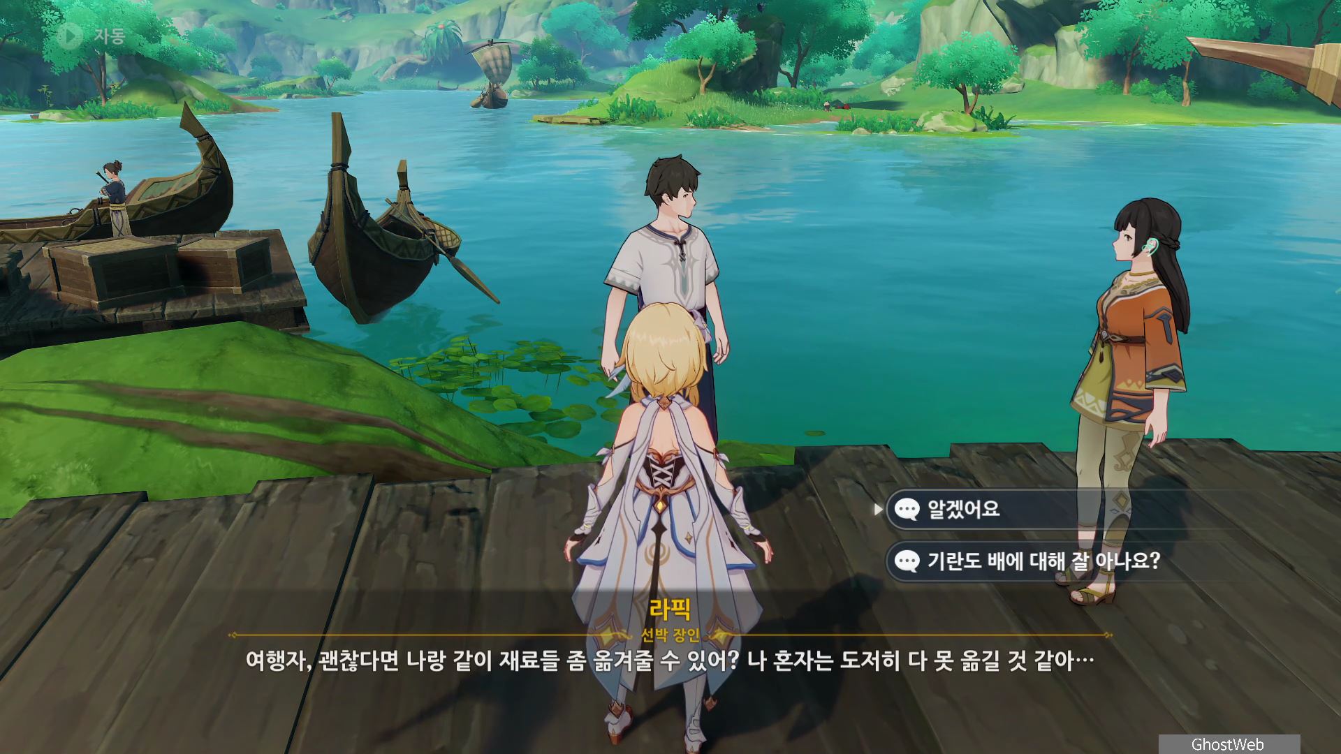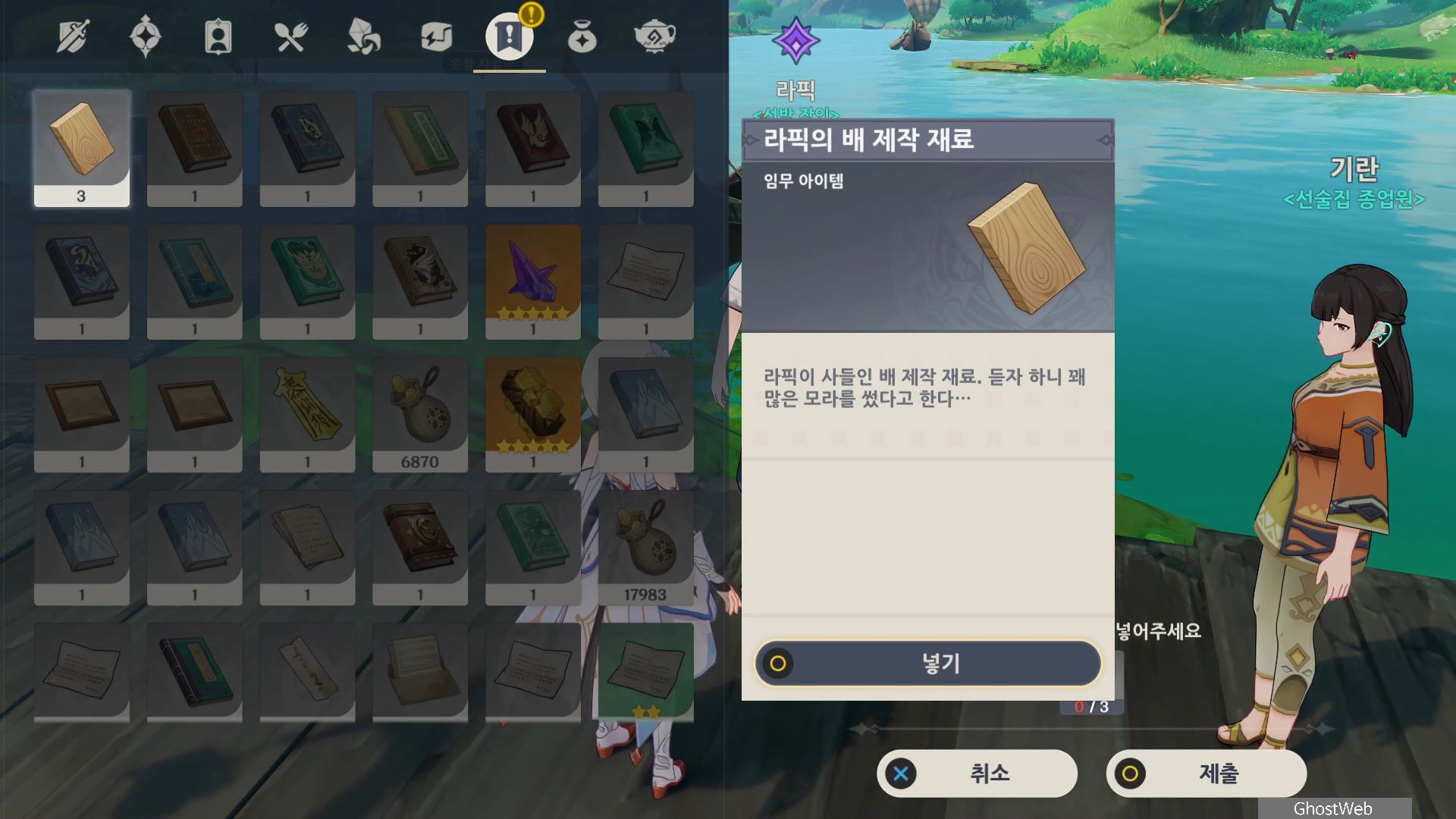 - 수메르 성 남쪽 부두에 있는 리픽/기란과 대화를 하고 주변에 있는 선박 수리에 필요한 물자를 주워서 건네주기