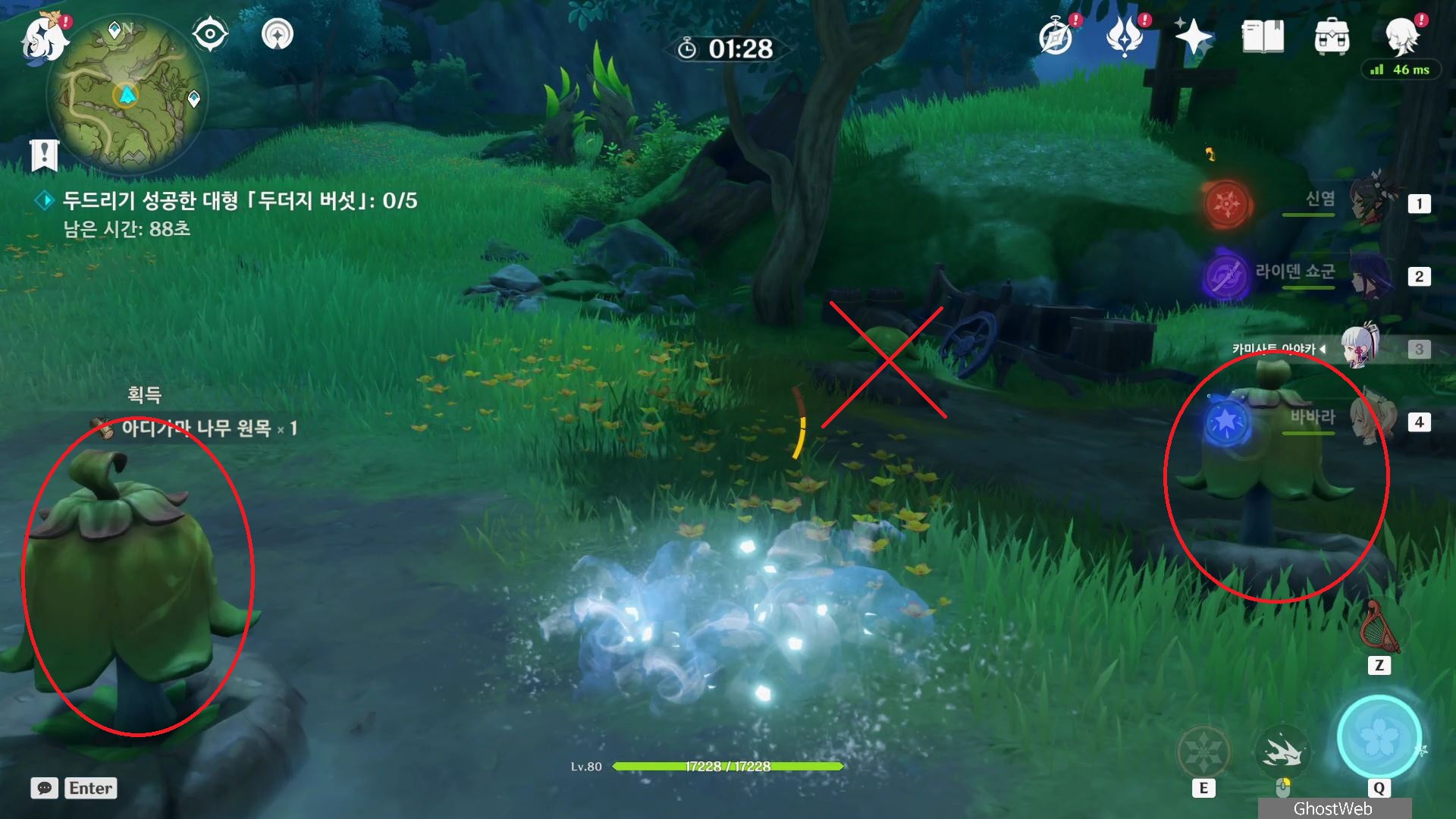 - 땅 속에서 튀어 나오는 버섯 중 두더지 버섯(긴 모양의 버섯)을 공격하여 두드리면 완료 (총 5번)