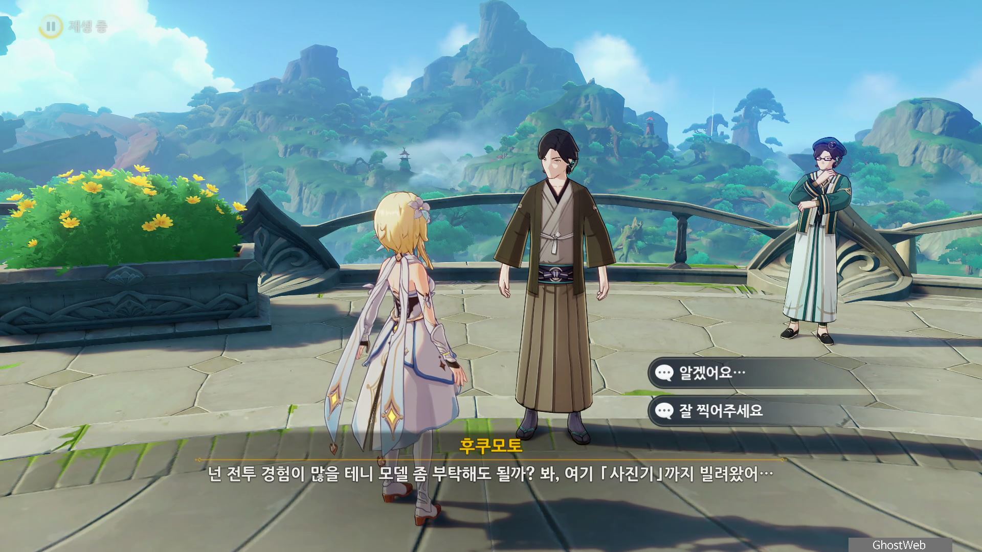 - 후쿠모토의 부탁으로 일러스트 참고 자료로 쓸 전투 포즈로 사진 찍기 (수메르 성 남쪽)
