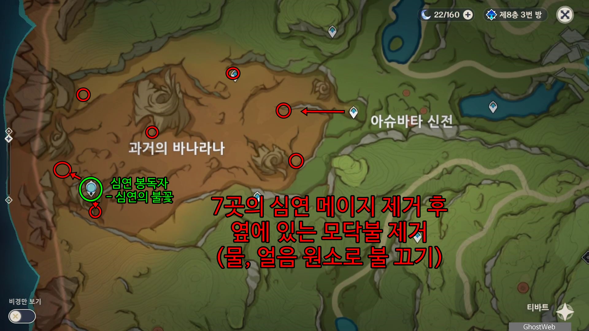 과거의 바나라나 지상에 있는 총 7곳의 심연 메이지가 있는 곳으로 가서 적들을 처치하고 옆에 있는 모닥불을 물 또는 얼음 원소 공격을 통해 불을 끄고 과거의 바나라나에 있는 풀의 신의 석상에 있는 심연의 불꽃을 처치하면 화려한 보물상자와 <어둠과 여명의 노래> 업적을 달성할 수 있어요.