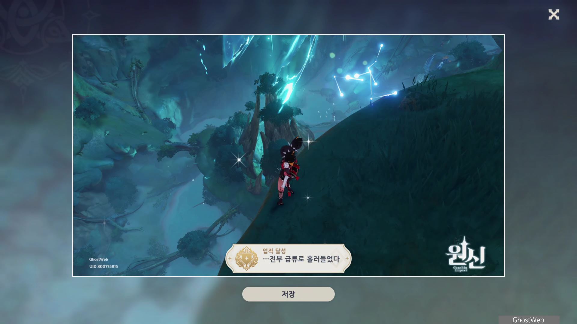 수메르 성 기준 남쪽에 있는 수천삼림에서 4시 방향에 있는 워프 포인트로 이동한 후, 시간을 12시 또는 24시 전으로 설정한 다음 정각이 되어 물 기둥이 생긴 것을 메뉴에 있는 카메라로 찍으면 <전부 급류로 흘러들었다> 업적을 달성할 수 있어요.