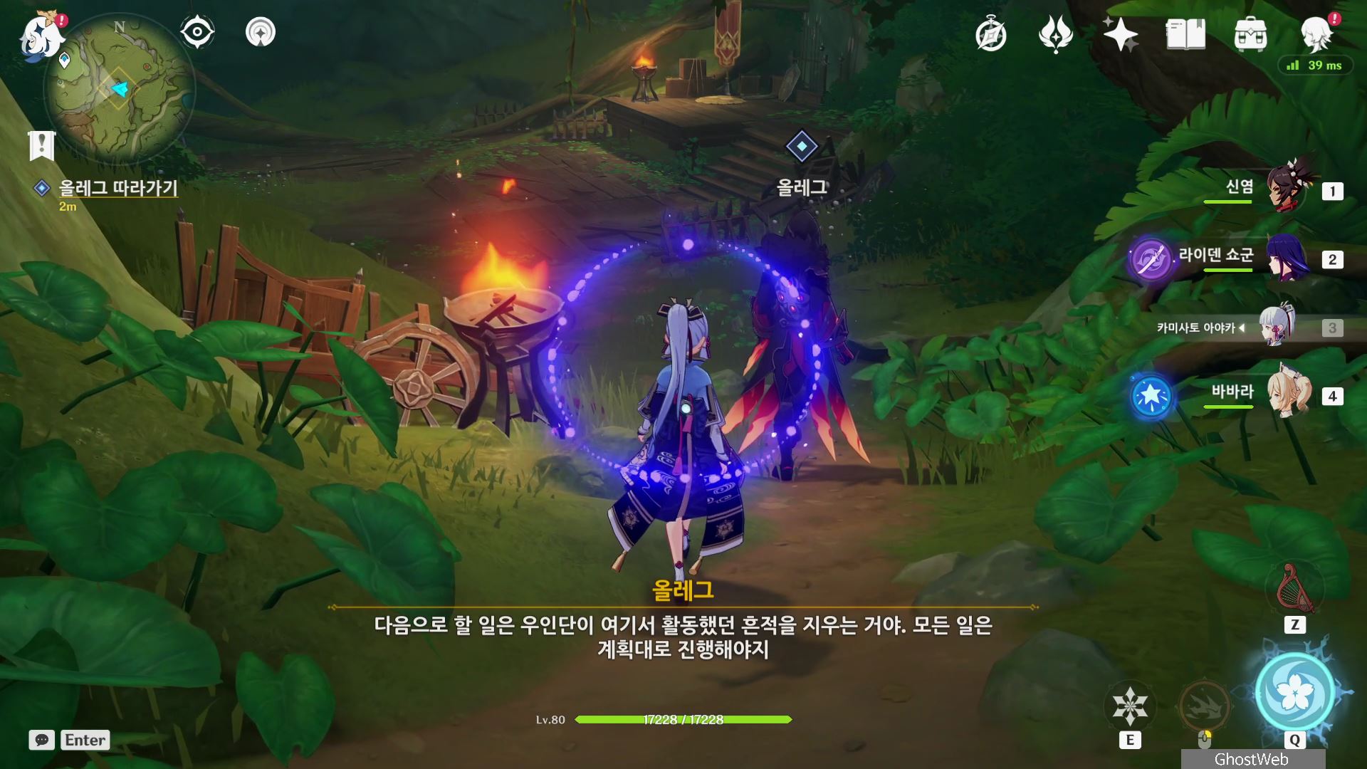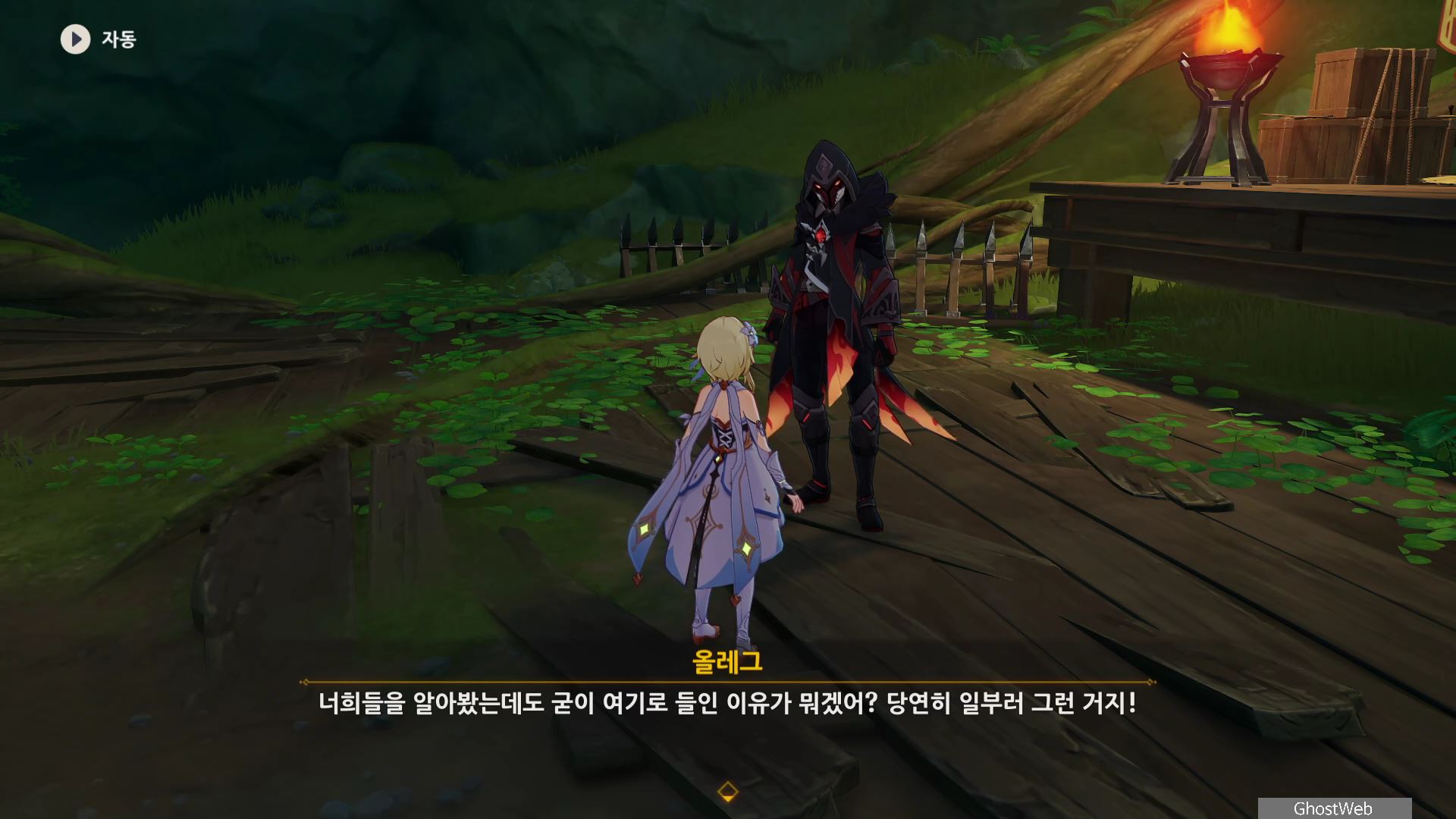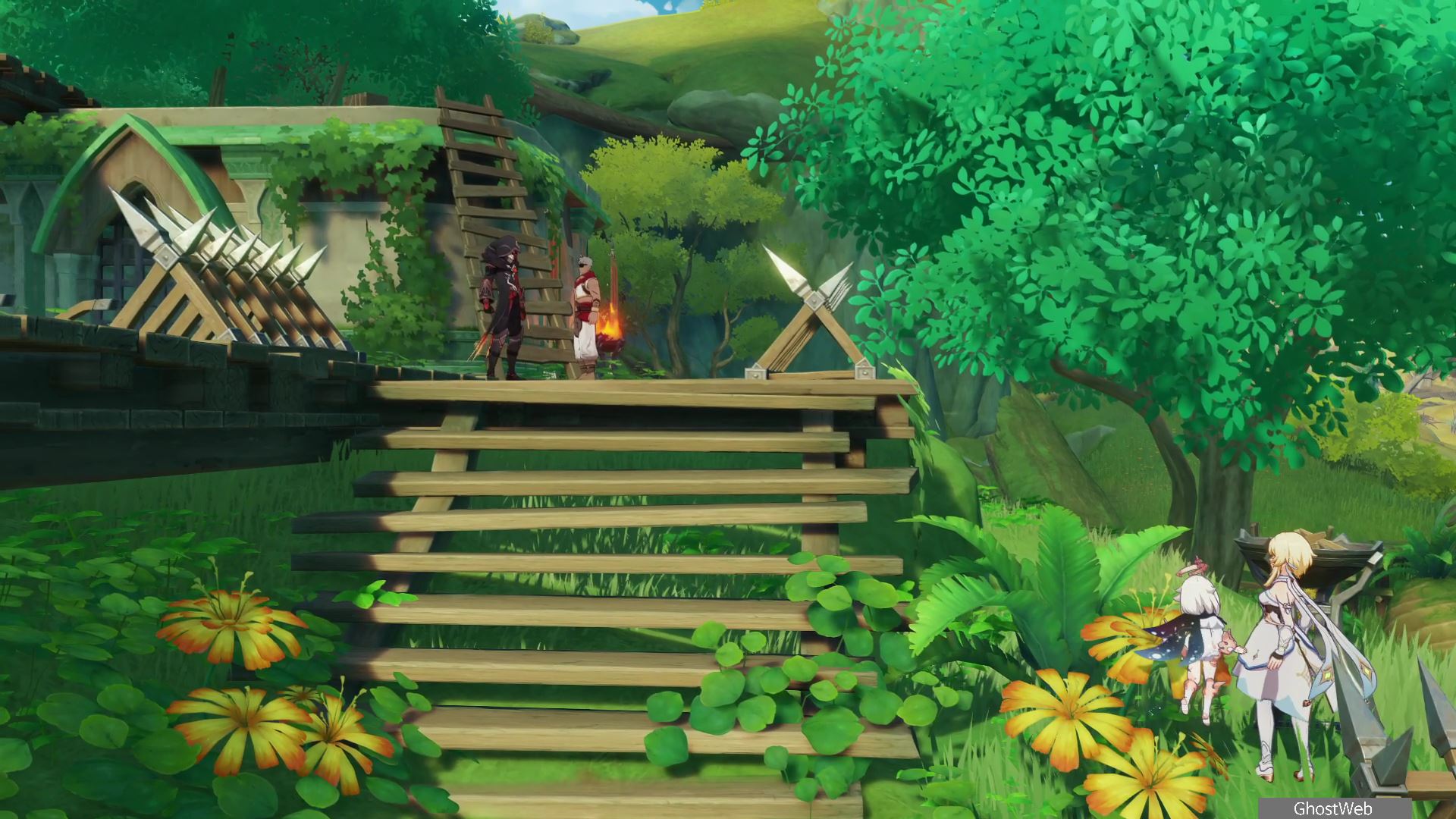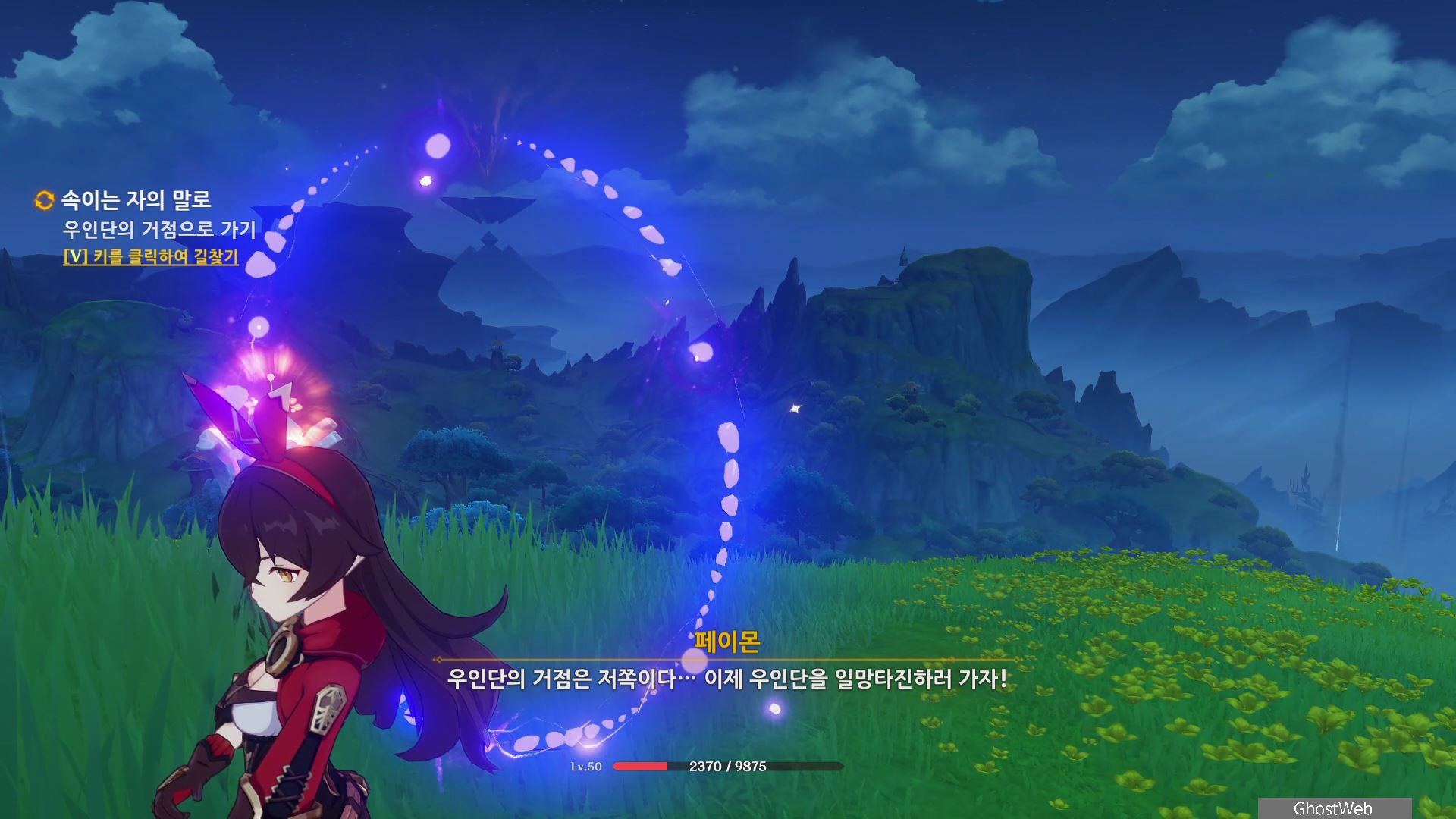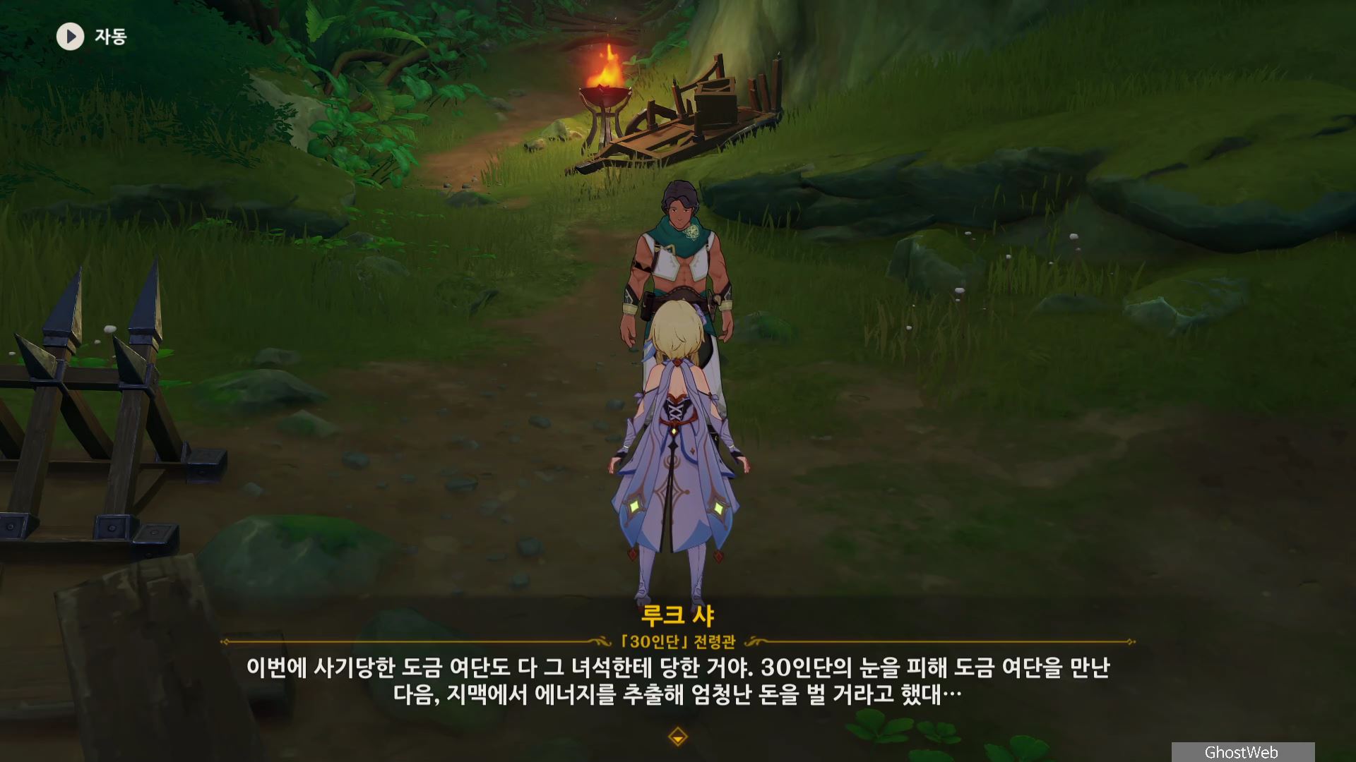 우인단 비밀 연락 지침서에서 말한 수선산림으로 향해 시간을 20시~6시로 변경한 후 텐트 주변에 있는 횃불을 불 원소 캐릭터(엠버)의 원소 공격을 통해 불을 붙이면 반대편 산에서 불이 반짝이는데, 그 곳으로 향하세요.