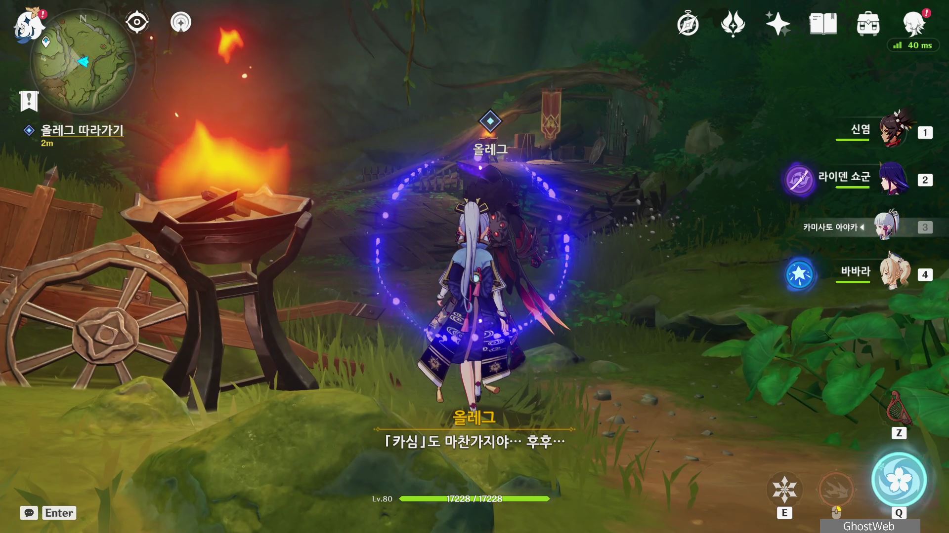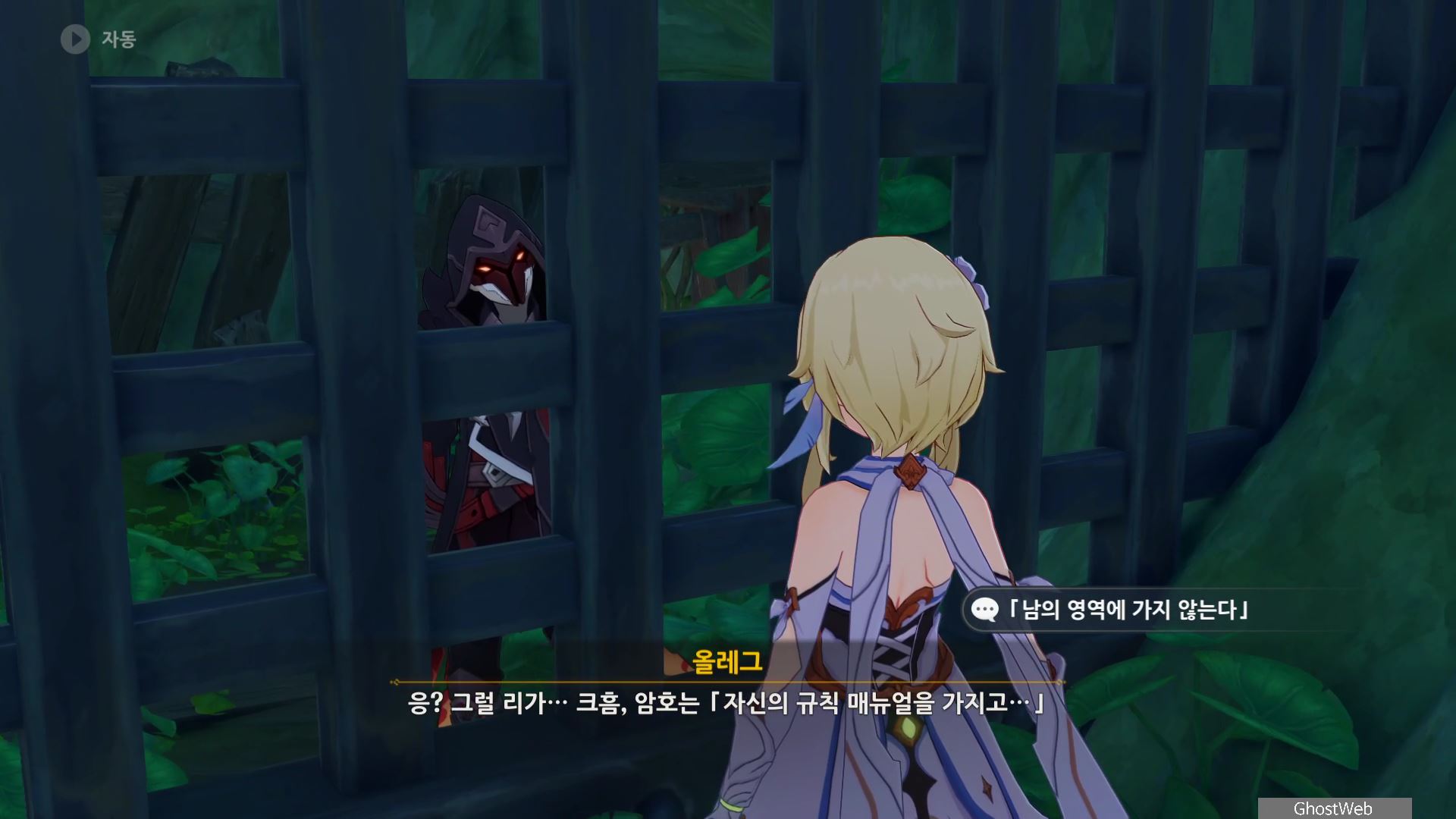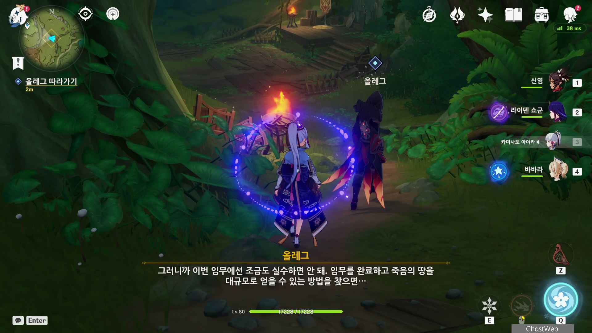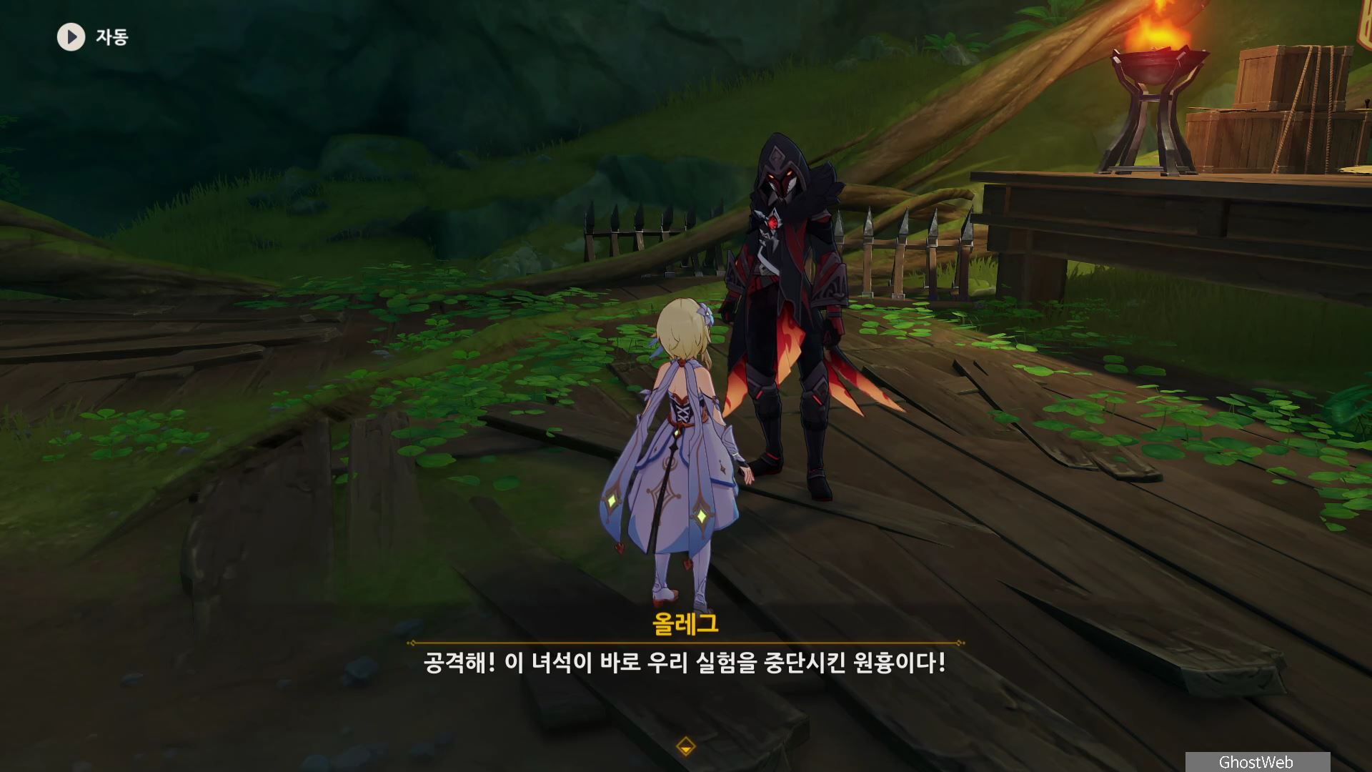 우인단 비밀 연락 지침서에서 말한 수선산림으로 향해 시간을 20시~6시로 변경한 후 텐트 주변에 있는 횃불을 불 원소 캐릭터(엠버)의 원소 공격을 통해 불을 붙이면 반대편 산에서 불이 반짝이는데, 그 곳으로 향하세요.