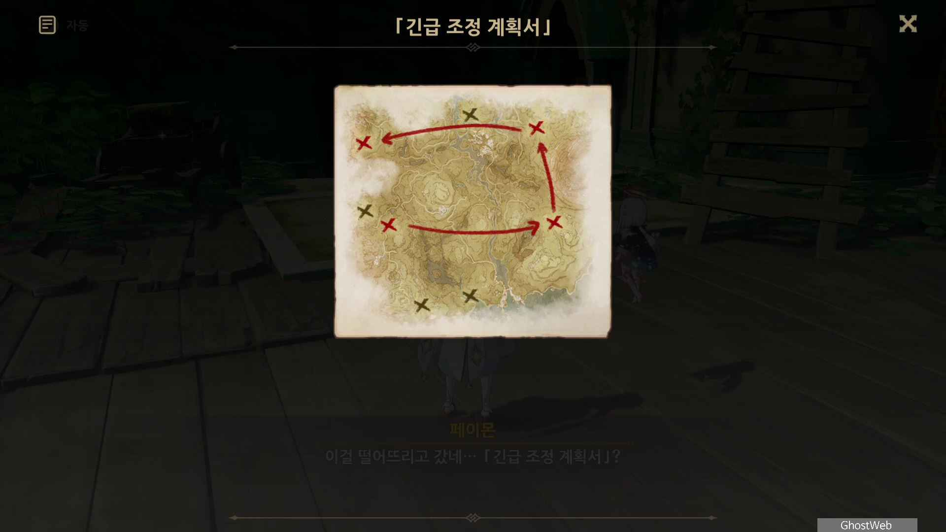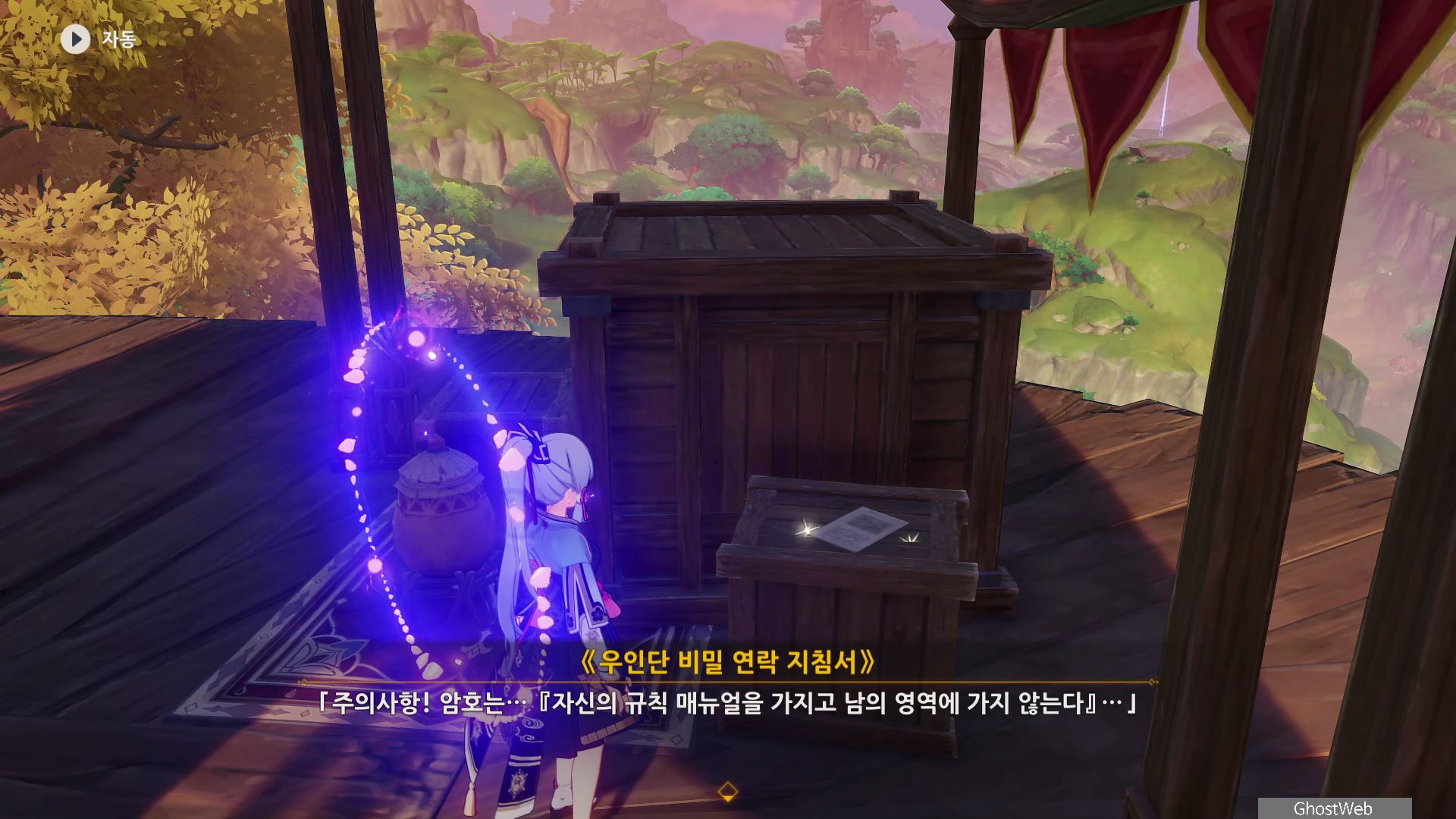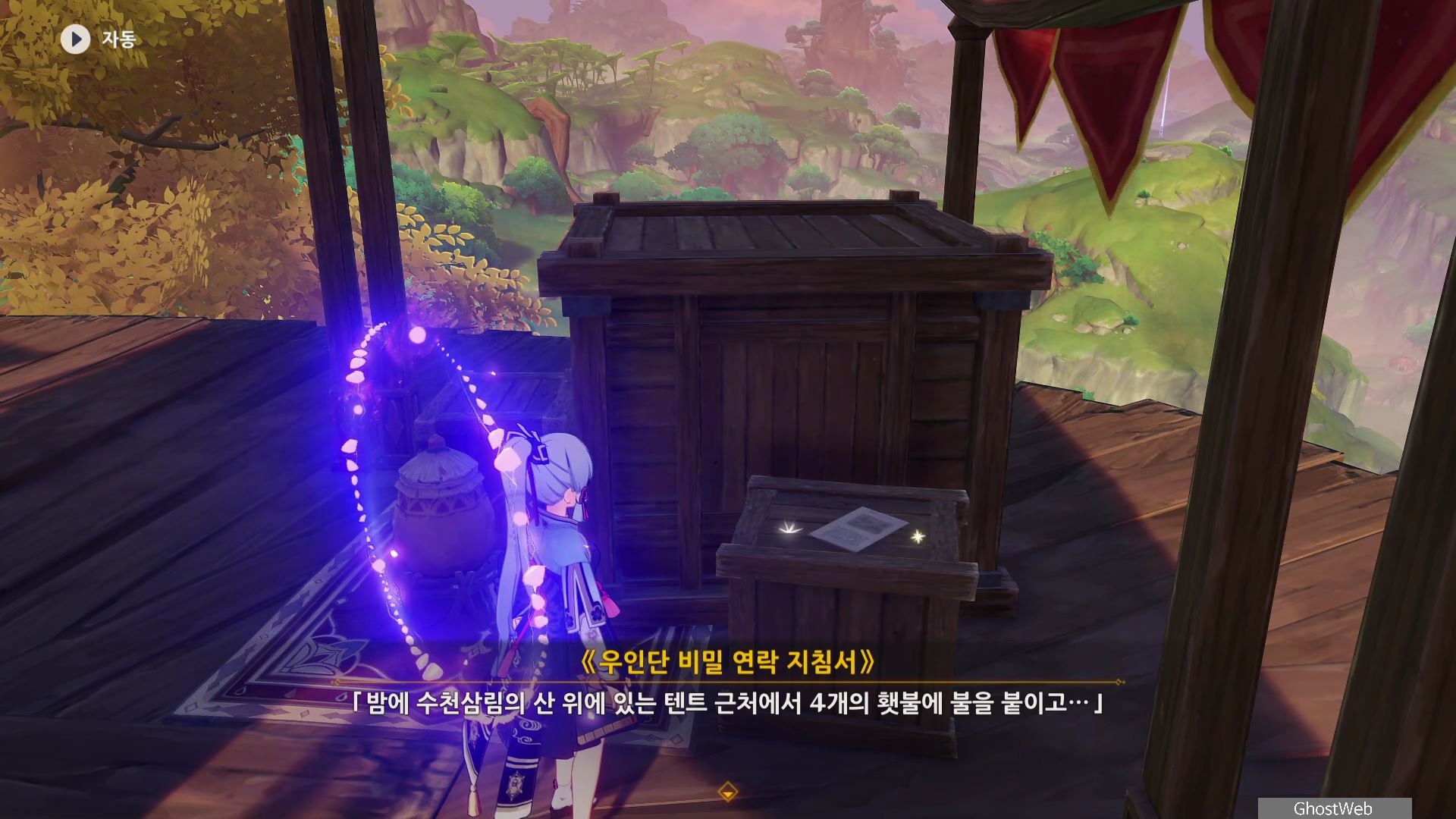 카심과 전투 후, 카심 도망간 후 근처에 있는 상자 위의 문서를 조사하면 우인단 비밀 연락 지침서를 통해 우인단의 행동 거점과 암호를 얻을 수 있어요.