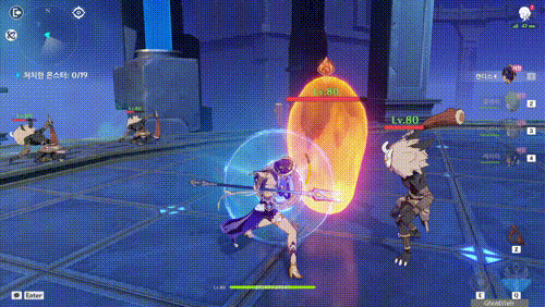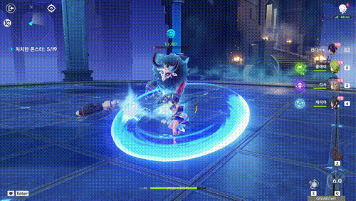 · 일정 시간 동안 홀드하면 차지가 완료되며, 스킬 버튼에서 손을 떼거나 지속 시간이 종료 혹은 보호막이 파괴되면 점프 공격을 가해 전방에 적에게 물 원소 피해를 준다.