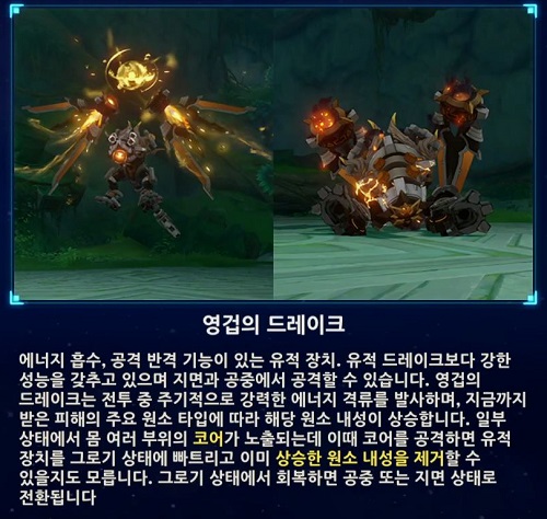 근접, 원거리 등 다양한 공격 패턴과 땅/공중을 왔다 갔다하고 특정 원소를 흡수하여 해당 원소의 내성이 증가하고 범위 원소 공격을 해요.