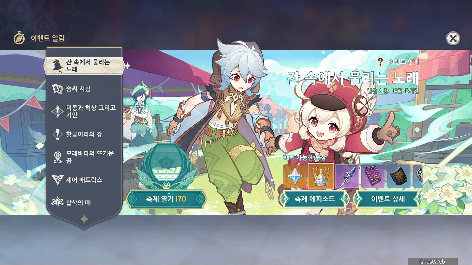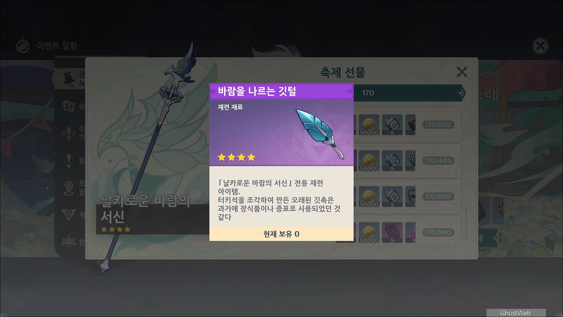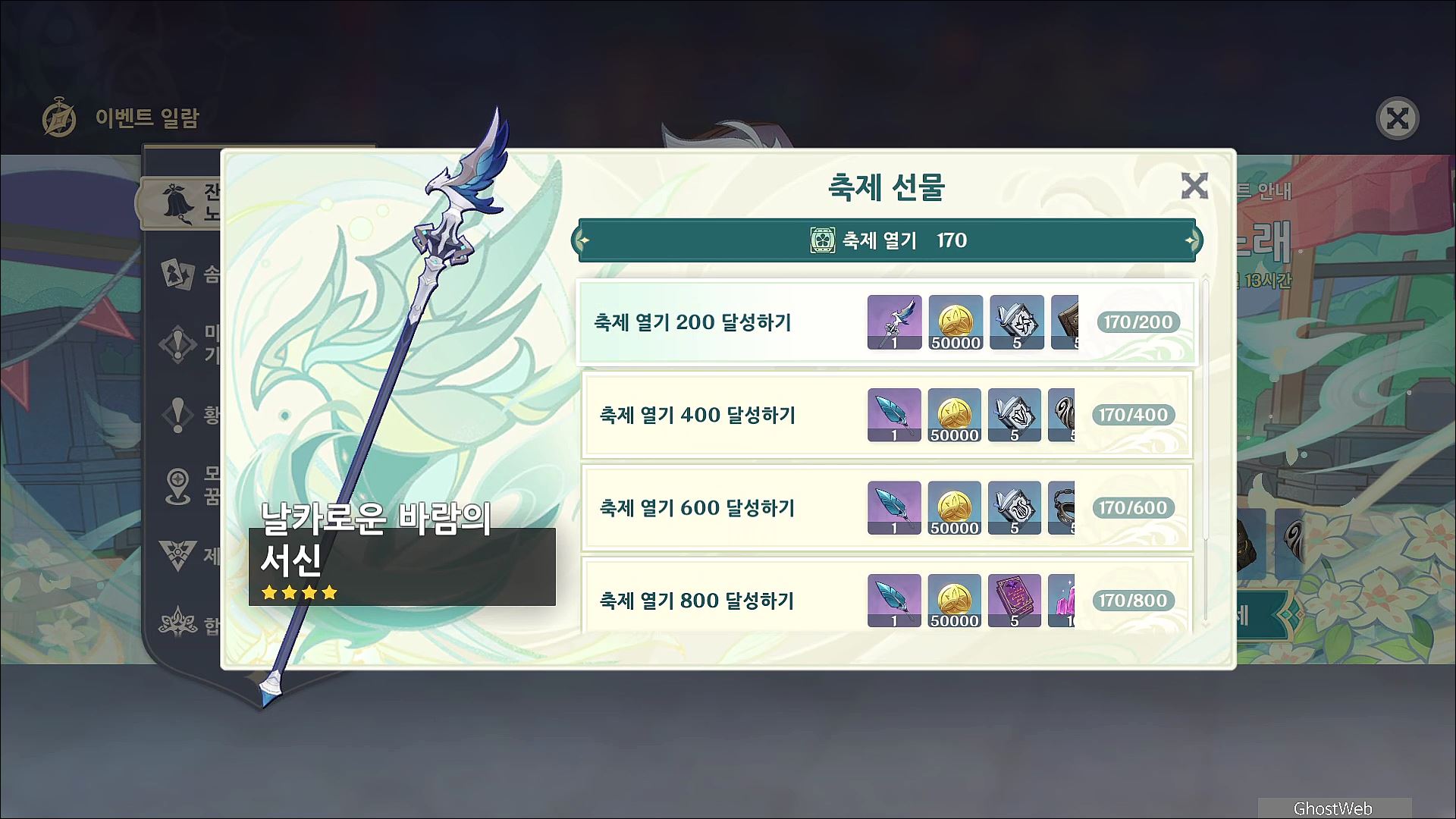 축제의 메인 컨텐츠 참여를 통해 포인트르 모아 원석, 지식의 왕관, 날카로운 바람의 서신 등을 획득할 수 있어요.