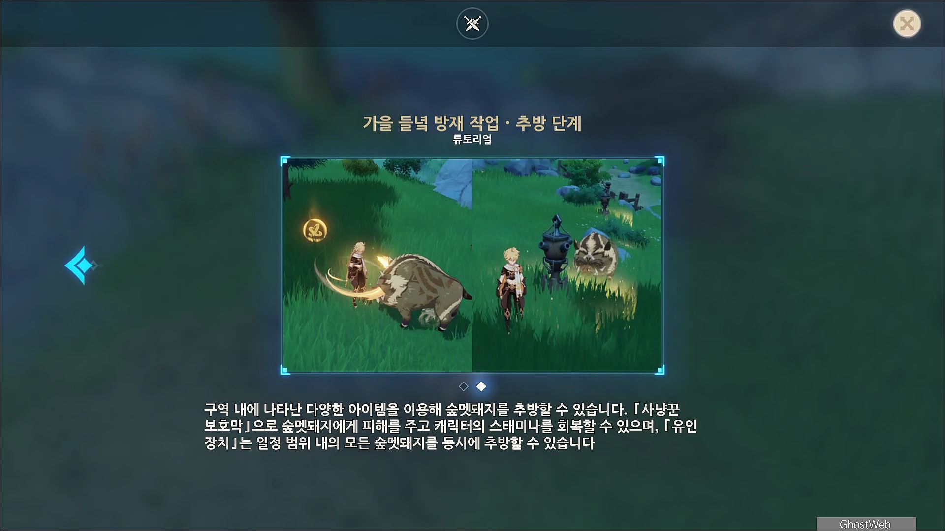 - 시간내에 구역 내에 있는 숲멧돼지를 추방하여 일정 점수 이상 획득하여 보상 획득하기
