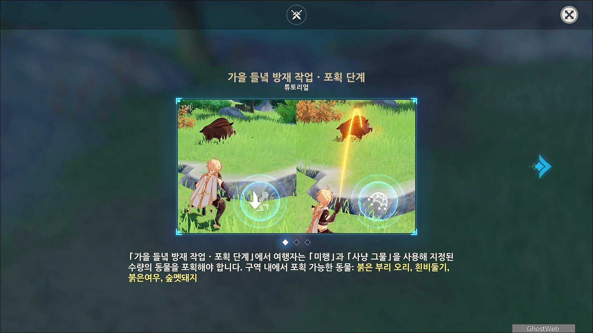 - 시간내에 구역 내에 있는 오리, 비둘기, 여우, 멧돼지 등을 포획하기