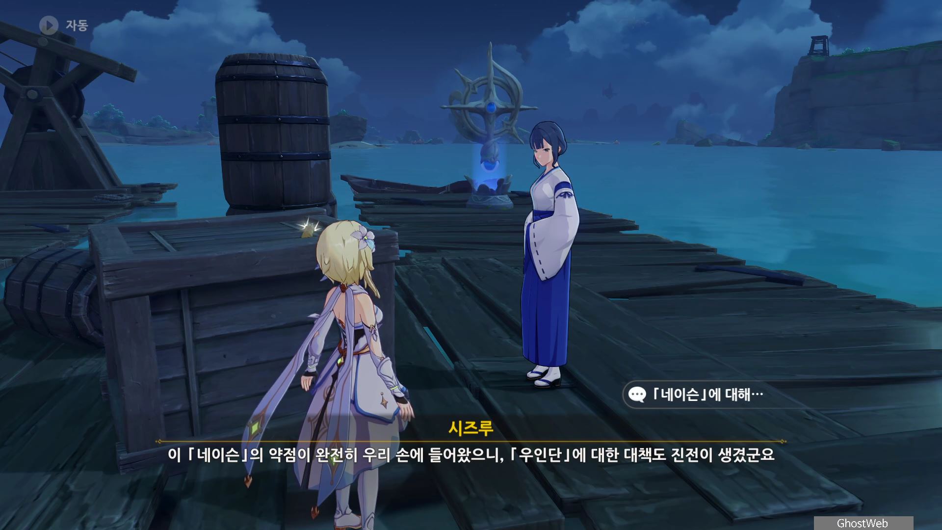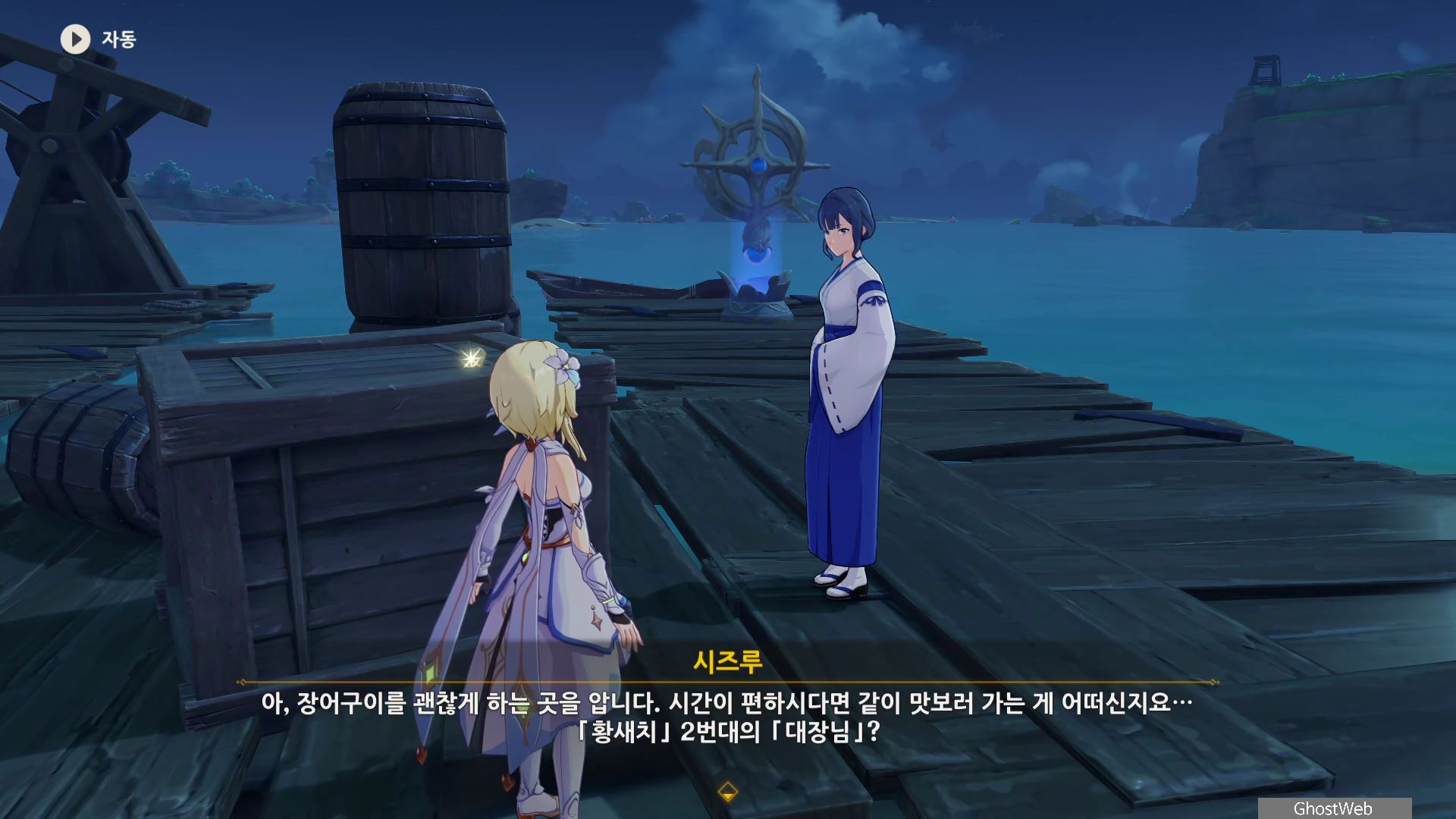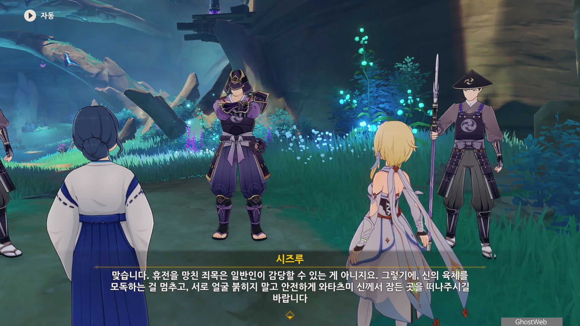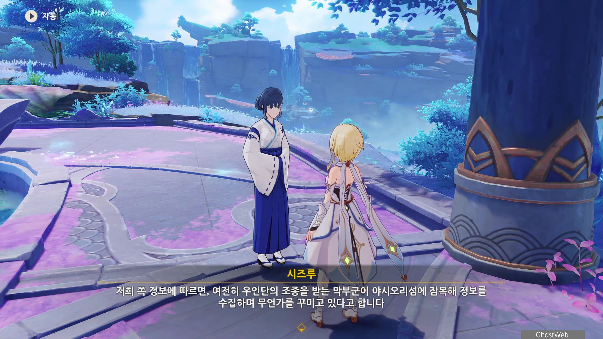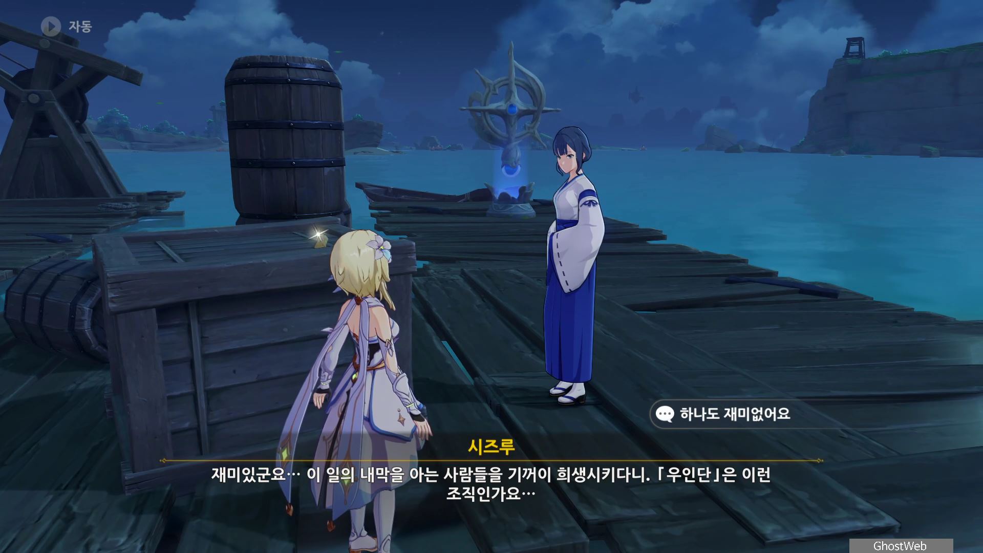 시즈루와 대화를 통해 이나즈마에 남아 있는 우인단 소탕을 위해 야시오리섬에 잠복해 정보를 수집하는 막부 부사 들과 교섭하러 뱀 뼈 광갱으로 향해요.