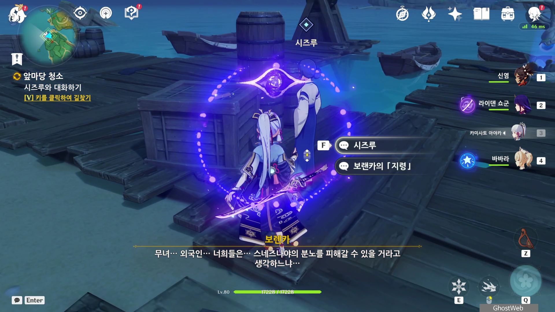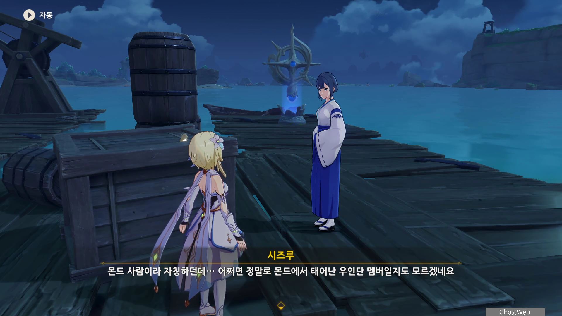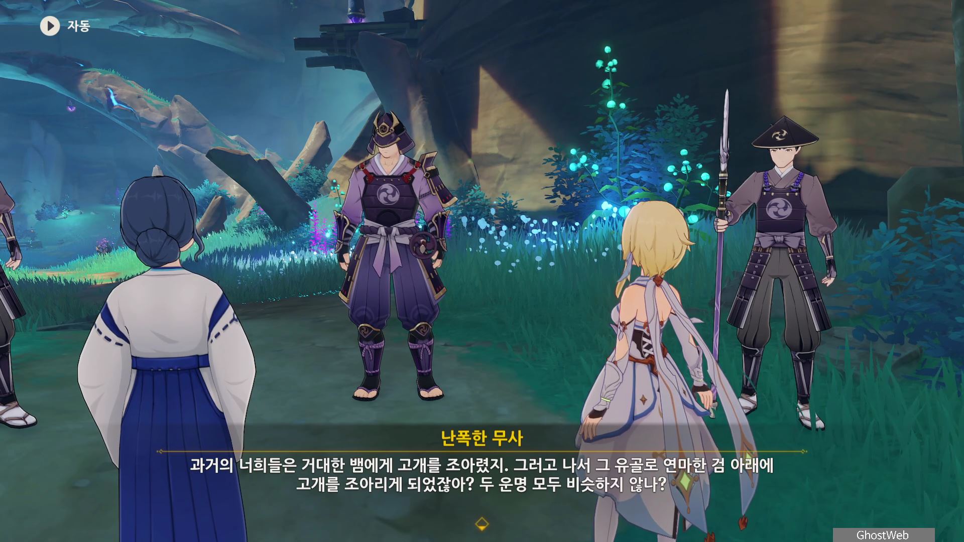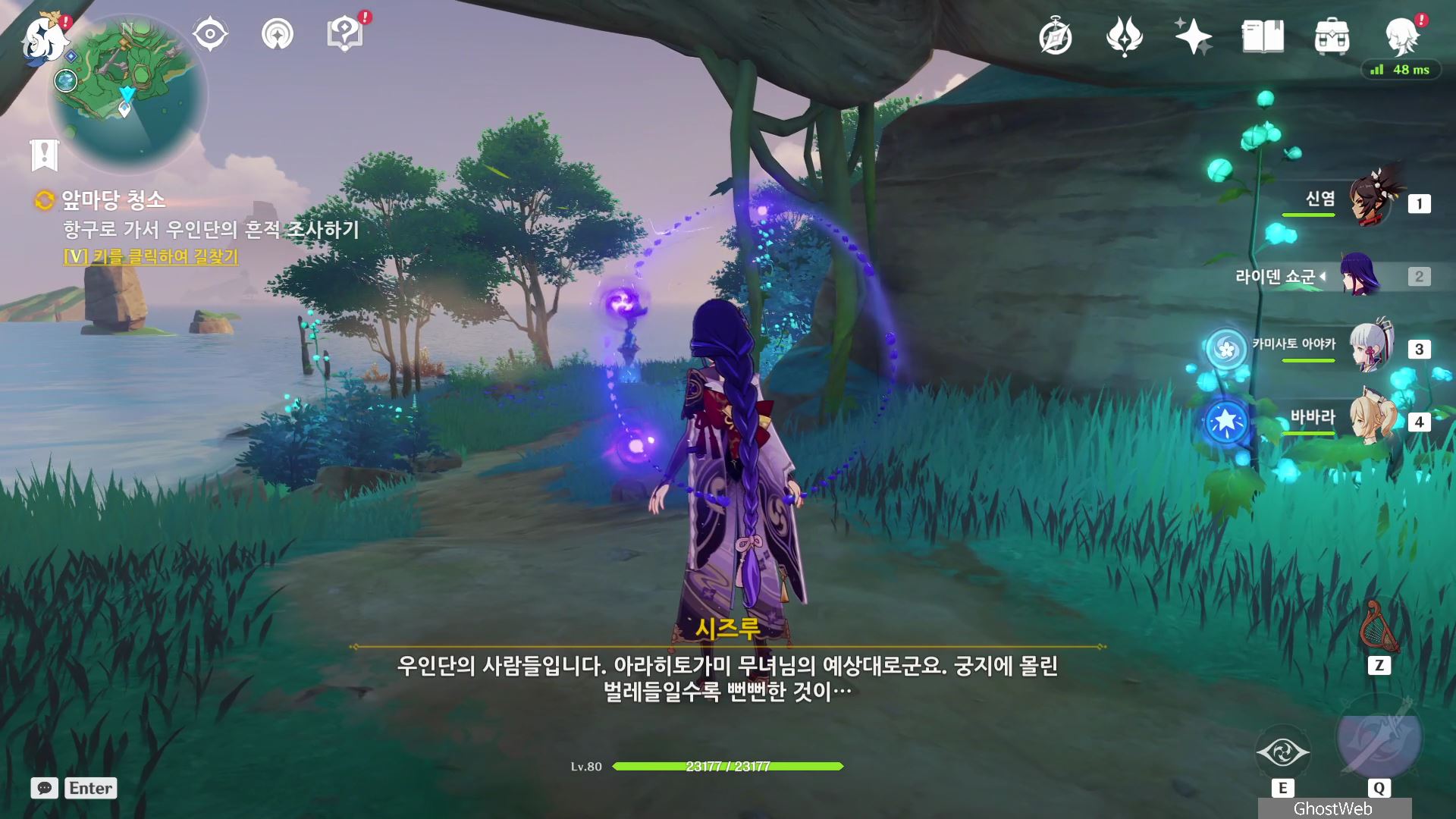 시즈루와 대화를 통해 이나즈마에 남아 있는 우인단 소탕을 위해 야시오리섬에 잠복해 정보를 수집하는 막부 부사 들과 교섭하러 뱀 뼈 광갱으로 향해요.