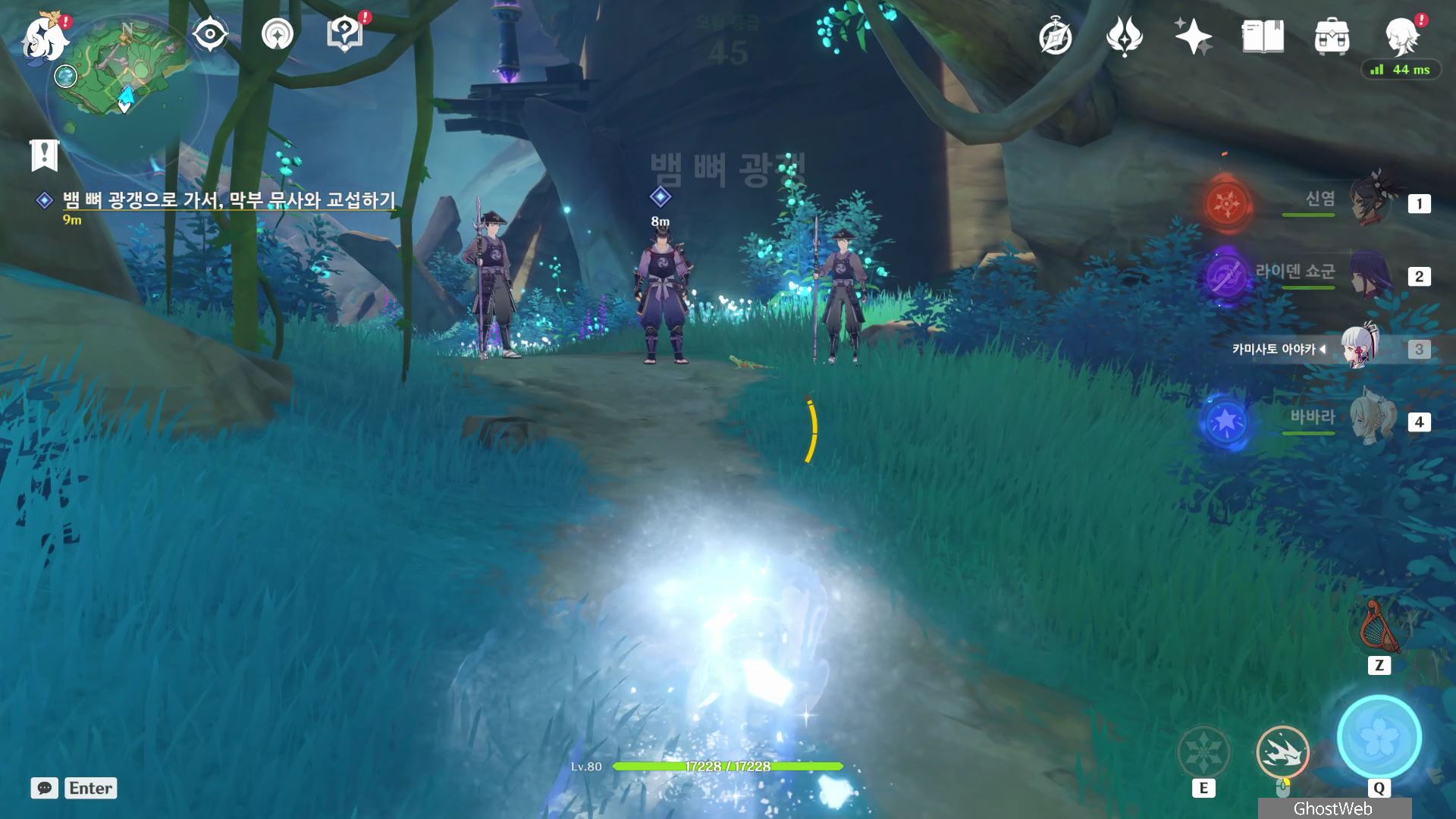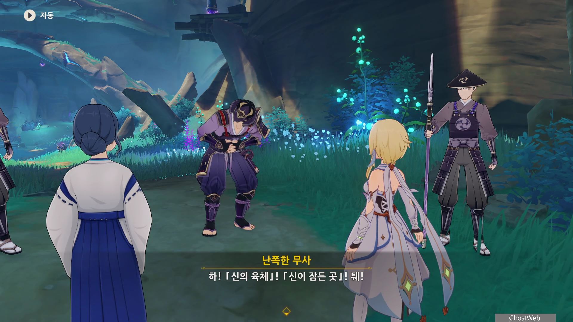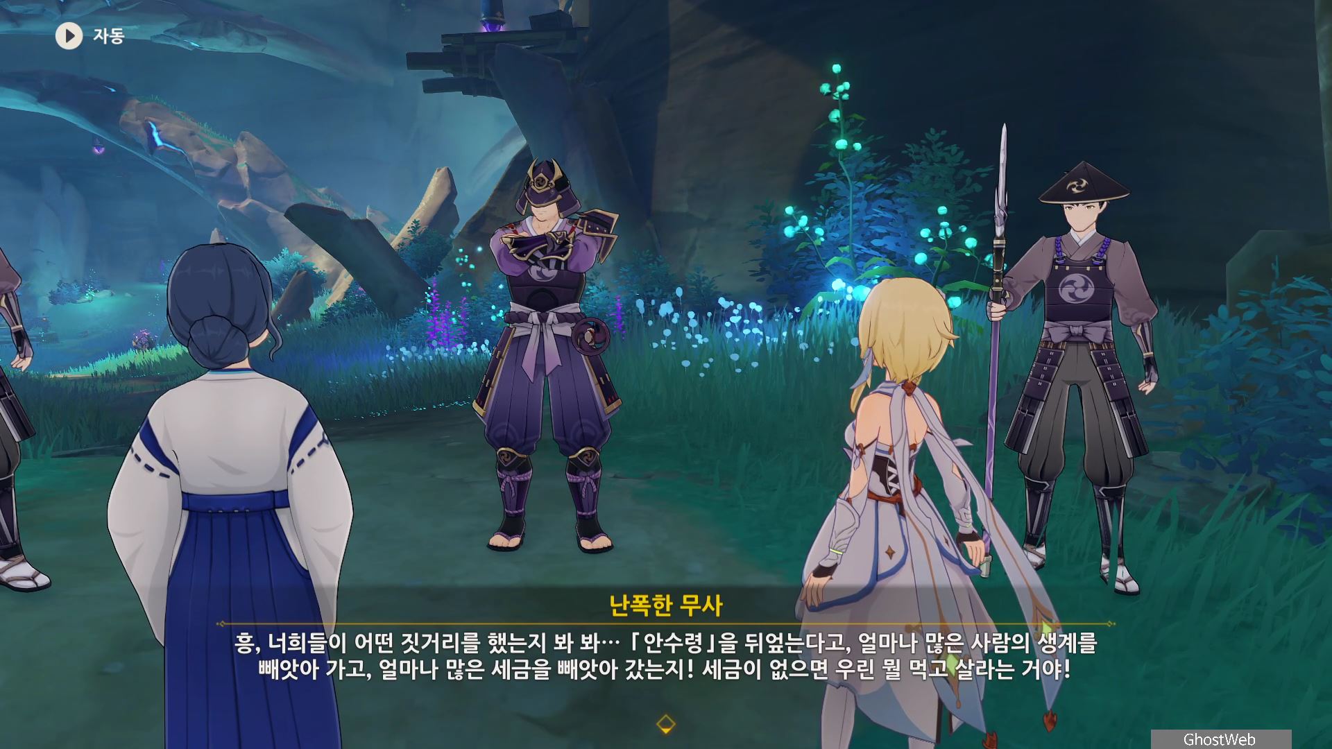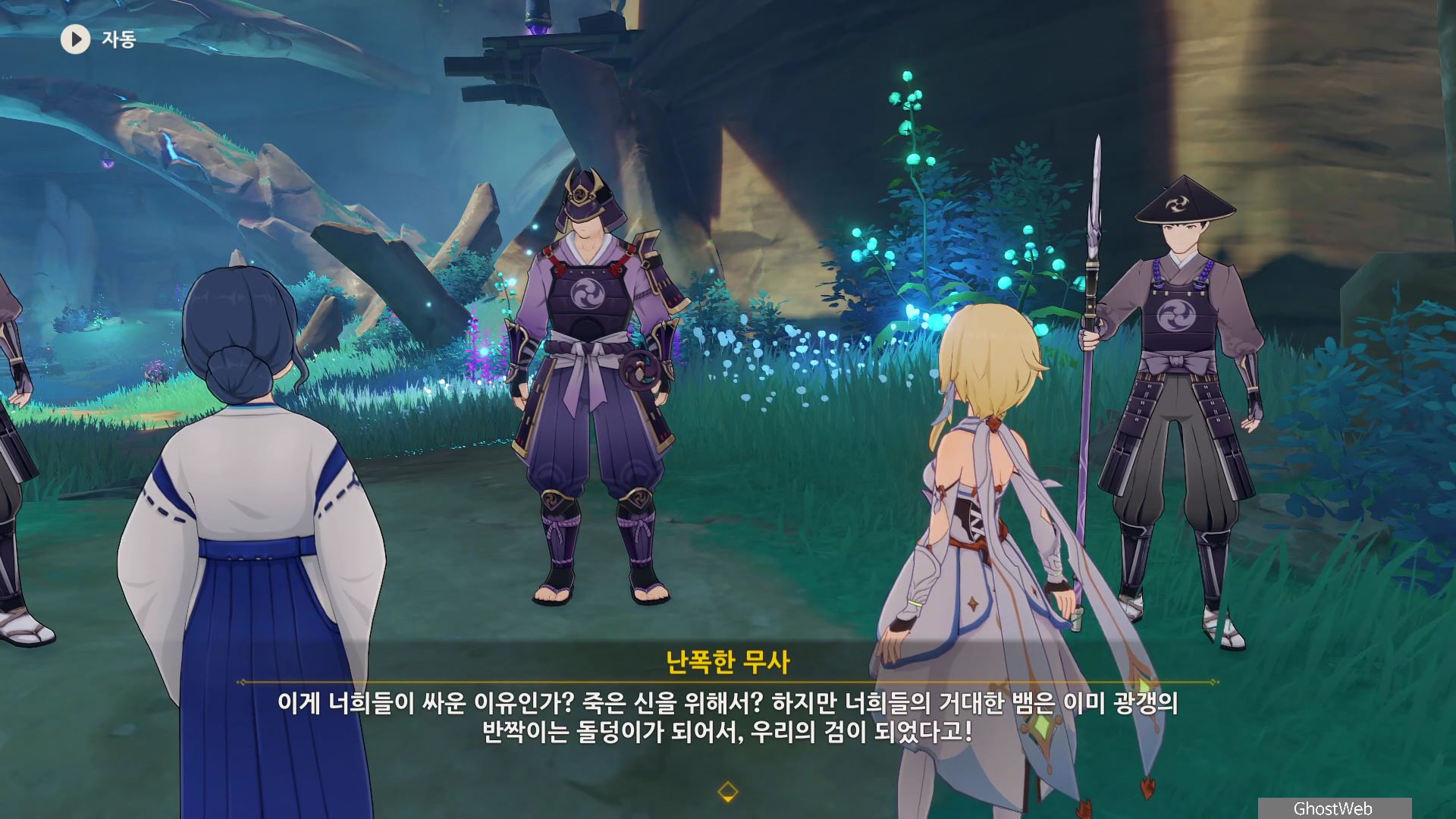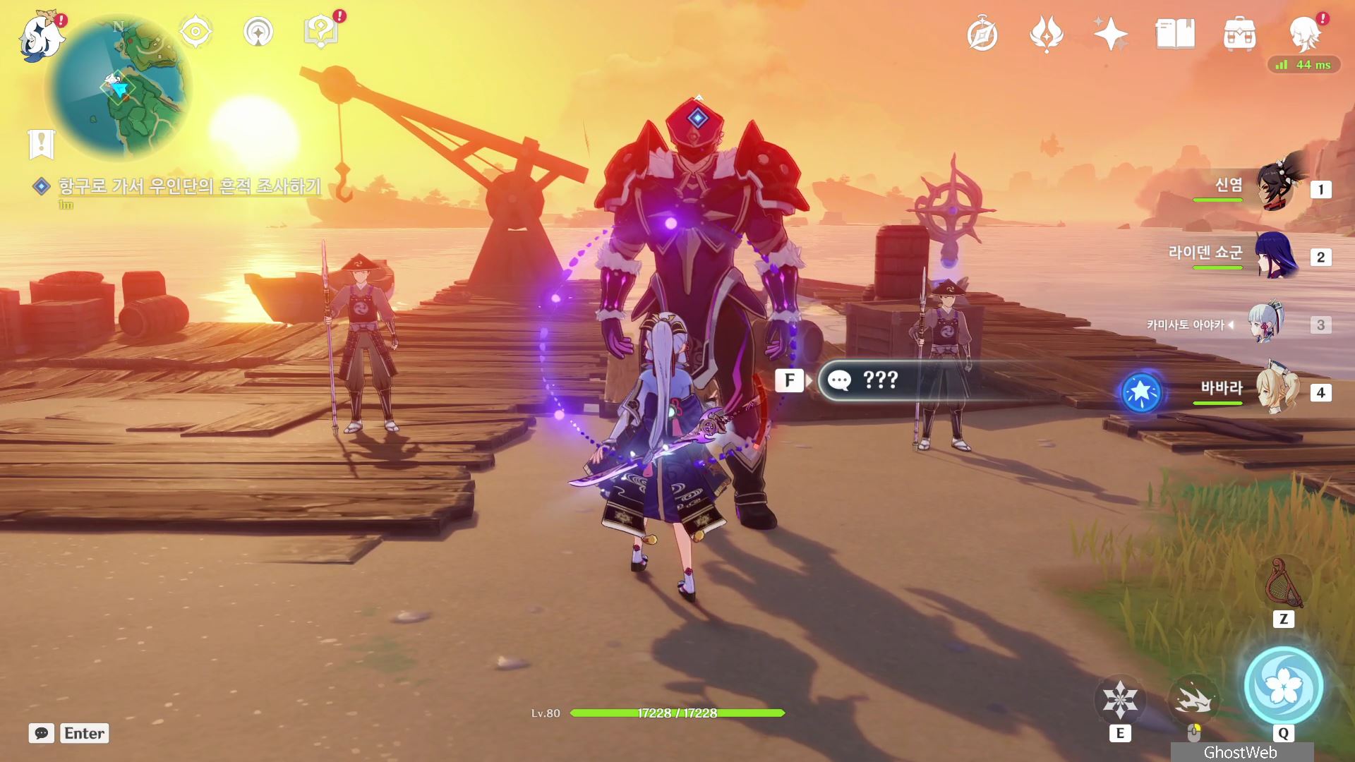 시즈루와 대화를 통해 이나즈마에 남아 있는 우인단 소탕을 위해 야시오리섬에 잠복해 정보를 수집하는 막부 부사 들과 교섭하러 뱀 뼈 광갱으로 향해요.