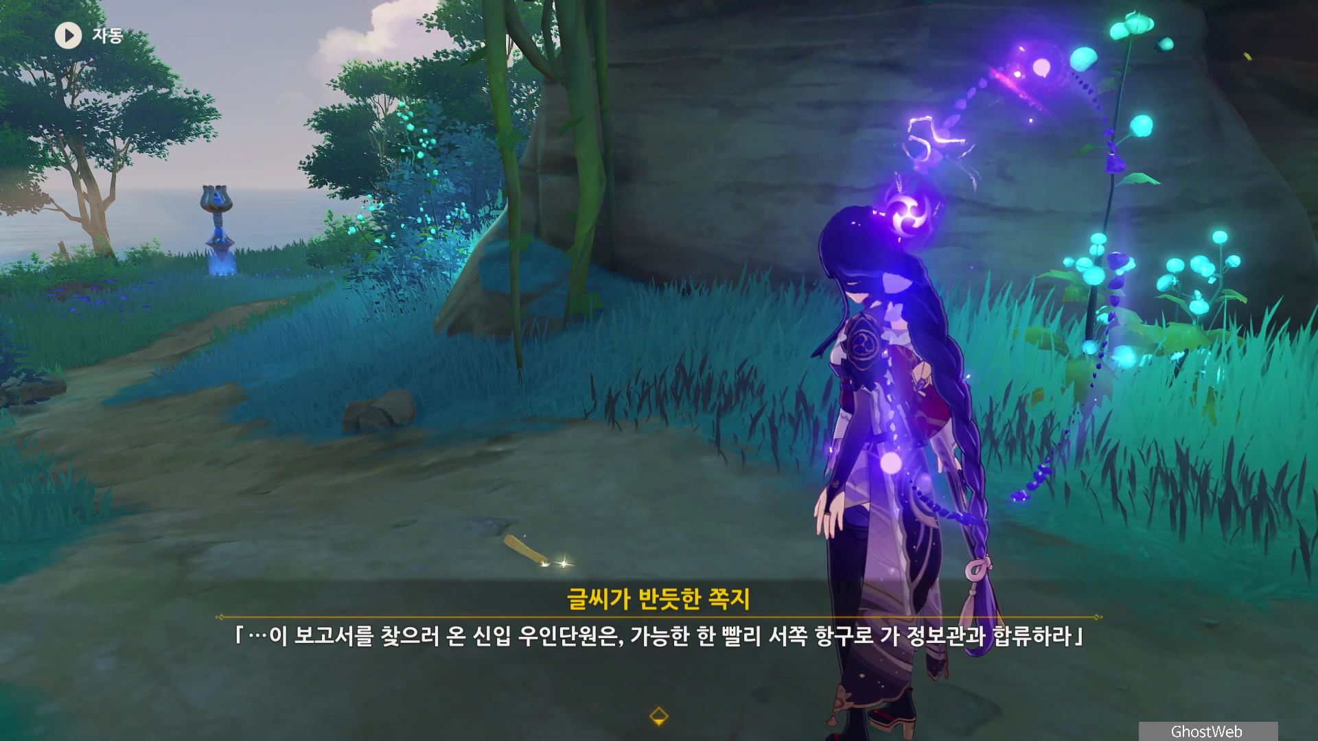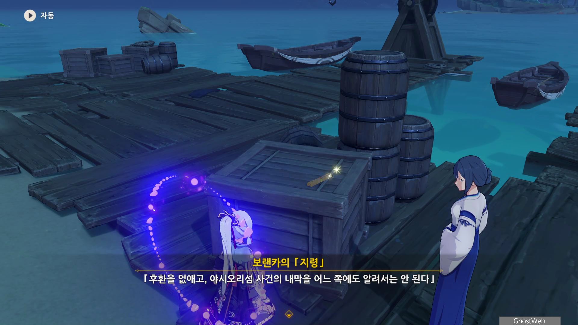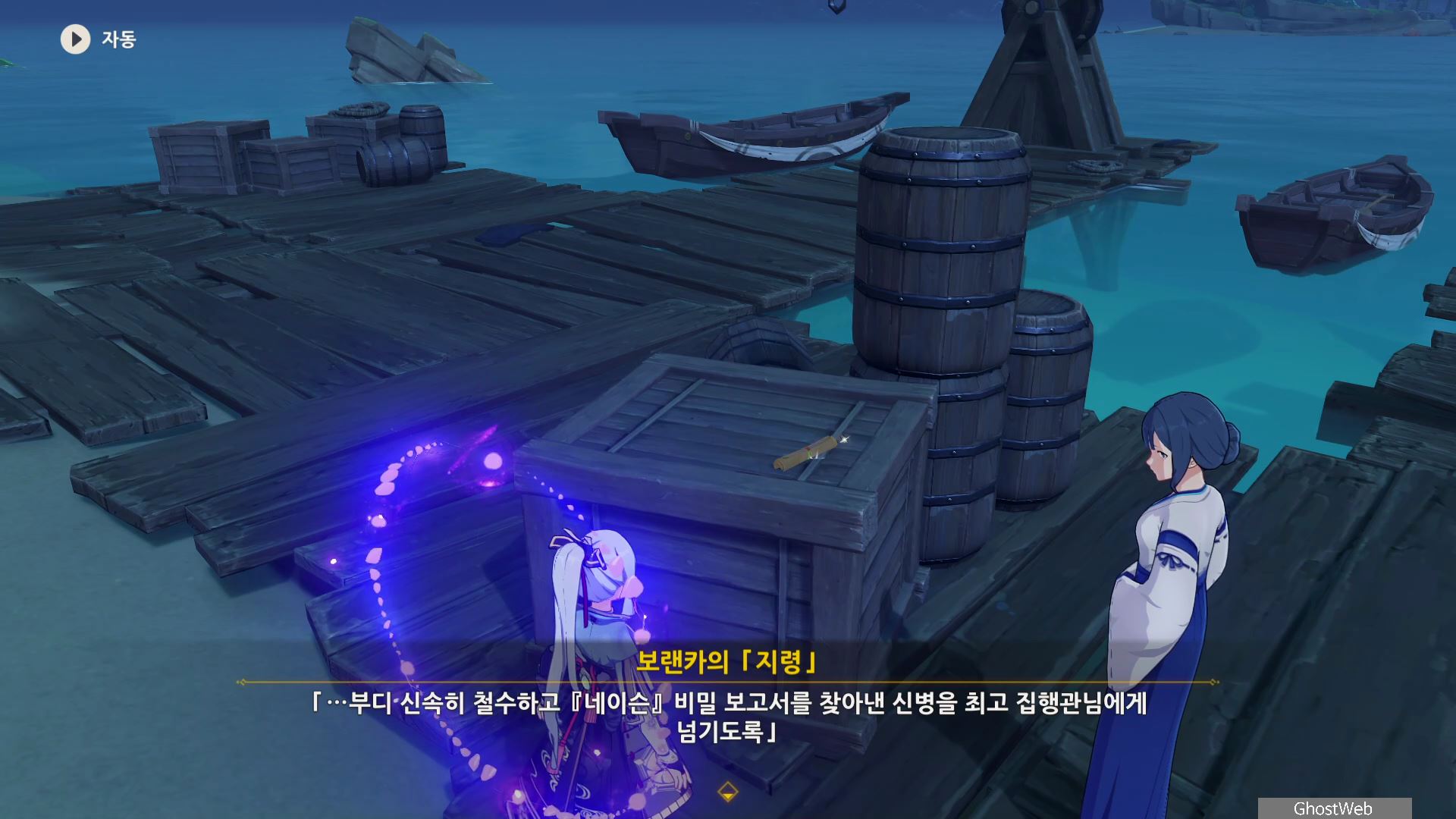 <글씨가 반듯한 쪽지>를 다읽으면 야시오리섬 서쪽 항구에 정보관이 있으며, 접선 암호는 '웃겨 죽겠네'라는 사실을 알고 그 곳에 있는 우인단 보렌카(우인단 정보관 해사 준위)와 무사들을 처치하고 보랜카의 지령을 읽어보면 신병 모집에 자세한 내막을 알 수 있어요.