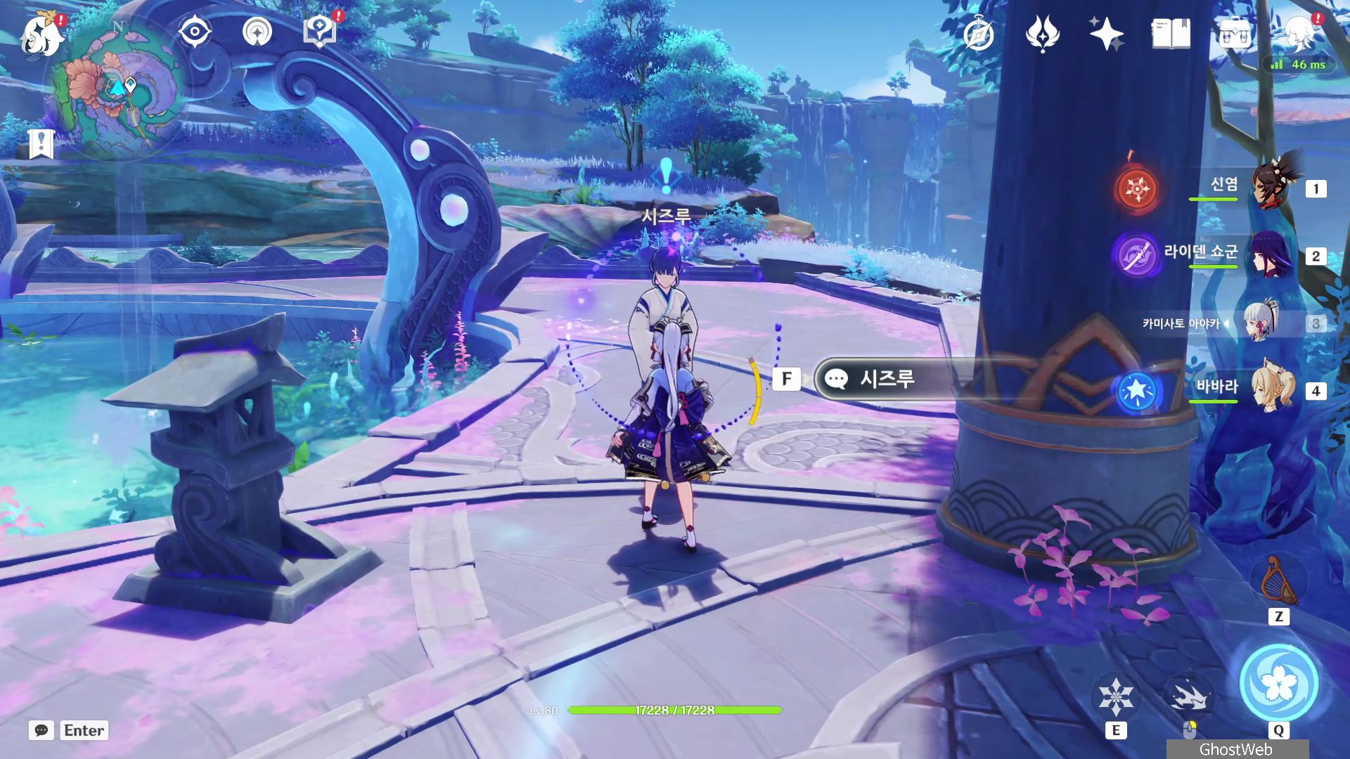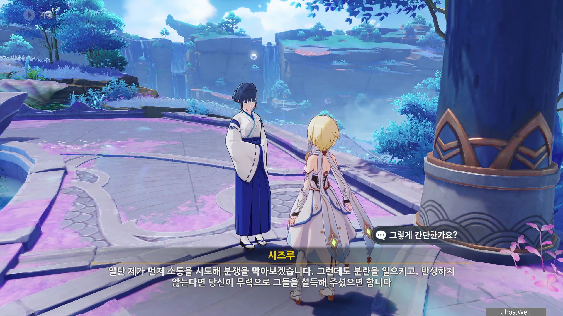 와타츠미섬 산호궁 워프 포인트에서 산호궁으로 올라가다 보면 오른쪽 편에 <시즈루>를 만날 수 있는데, 시즈루와 대화를 시작하면 이나즈마 평판 임무인 <앞마당 청소>를 진행할 수 있어요.