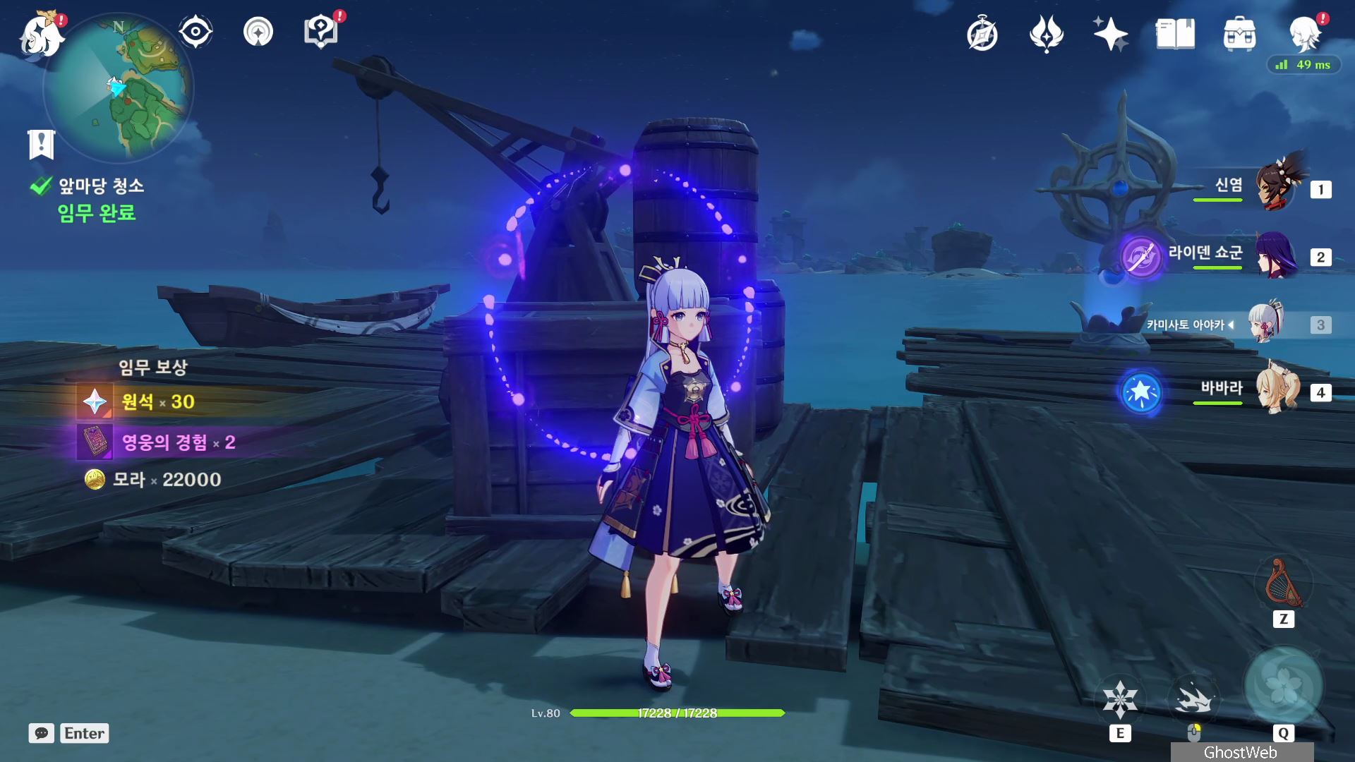 시즈루와 대화를 마지막으로 해당 임무를 완료할 수 있으며, 임무 보상으로 원석 30개, 영웅의 경험 2개, 22000 모라를 얻을 수 있어요.