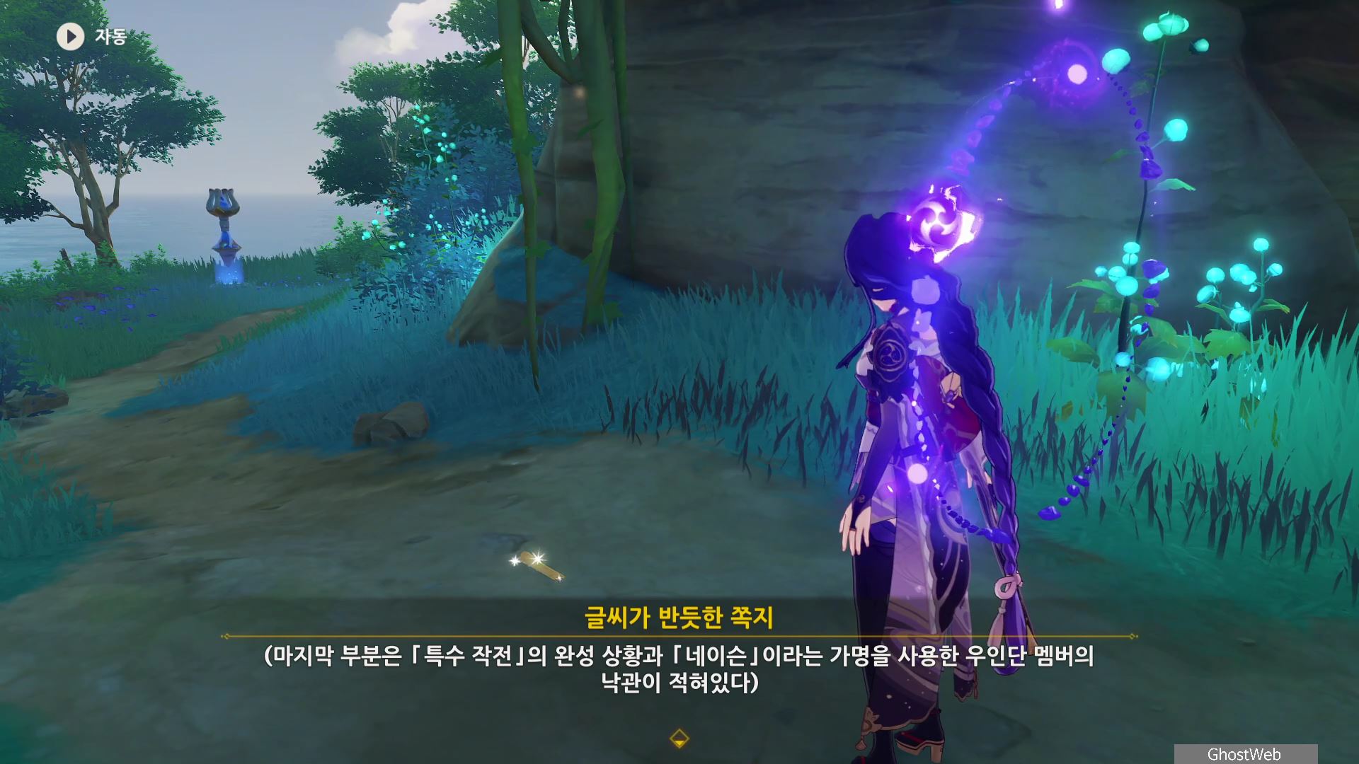 야시오리섬 뱀 뼈 광갱에 있는 난폭한 무사들을 처치한 후 바닥에 떨어진 <글씨가 반듯한 쪽지>를 읽어보면 라이덴 쇼군이 남긴 번개 원소 주술 도구 시스템과 마신의 잔재가 유출될 경우 발생할 수 있는 결과, 히기 마을 환자에 대한 관찰기록이 첨부되어 있으며, 네이슨이라는 가명을 사용한 우인단 멤버의 낙관이 적혀 있는 것을 볼 수 있어요.