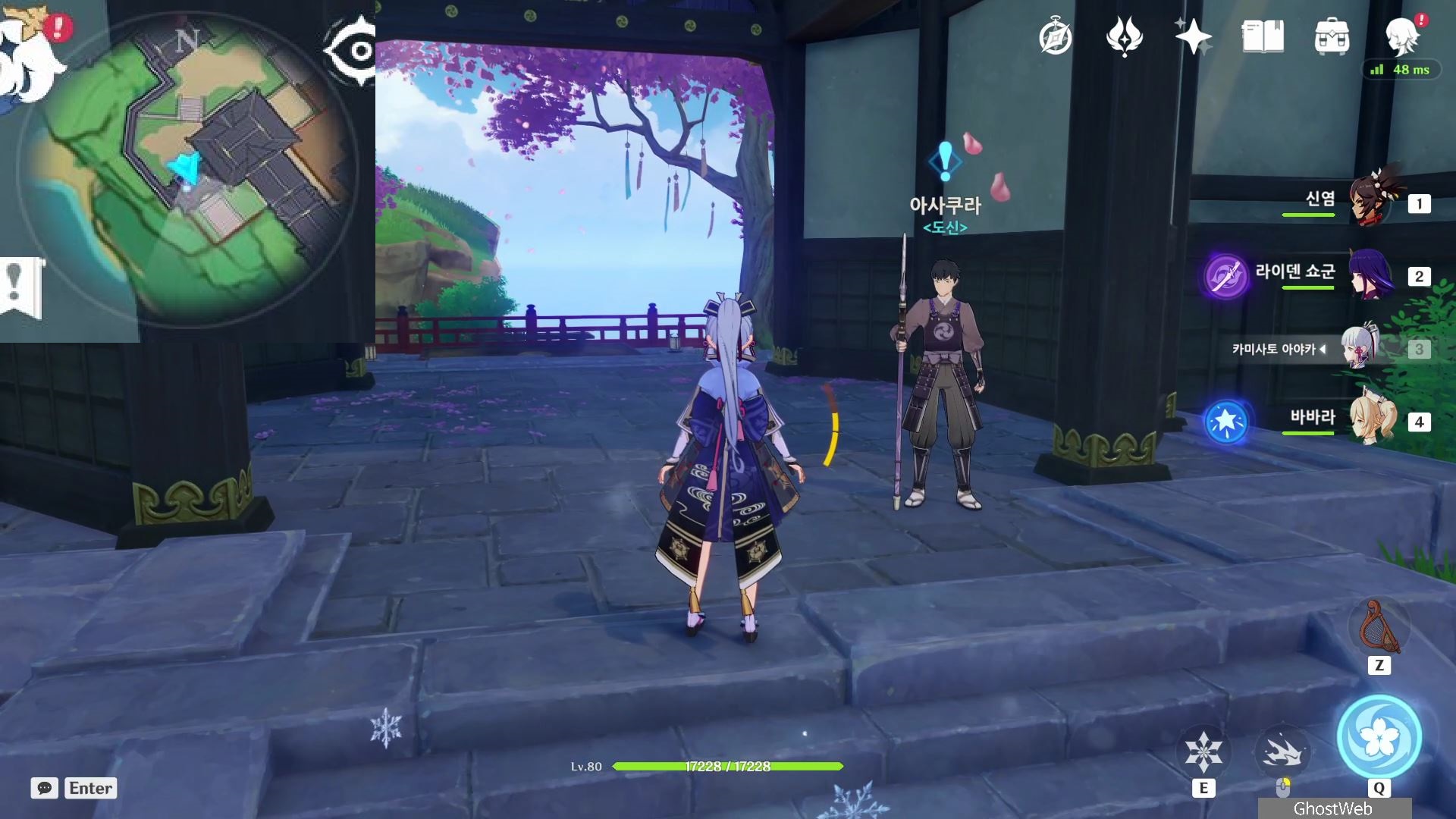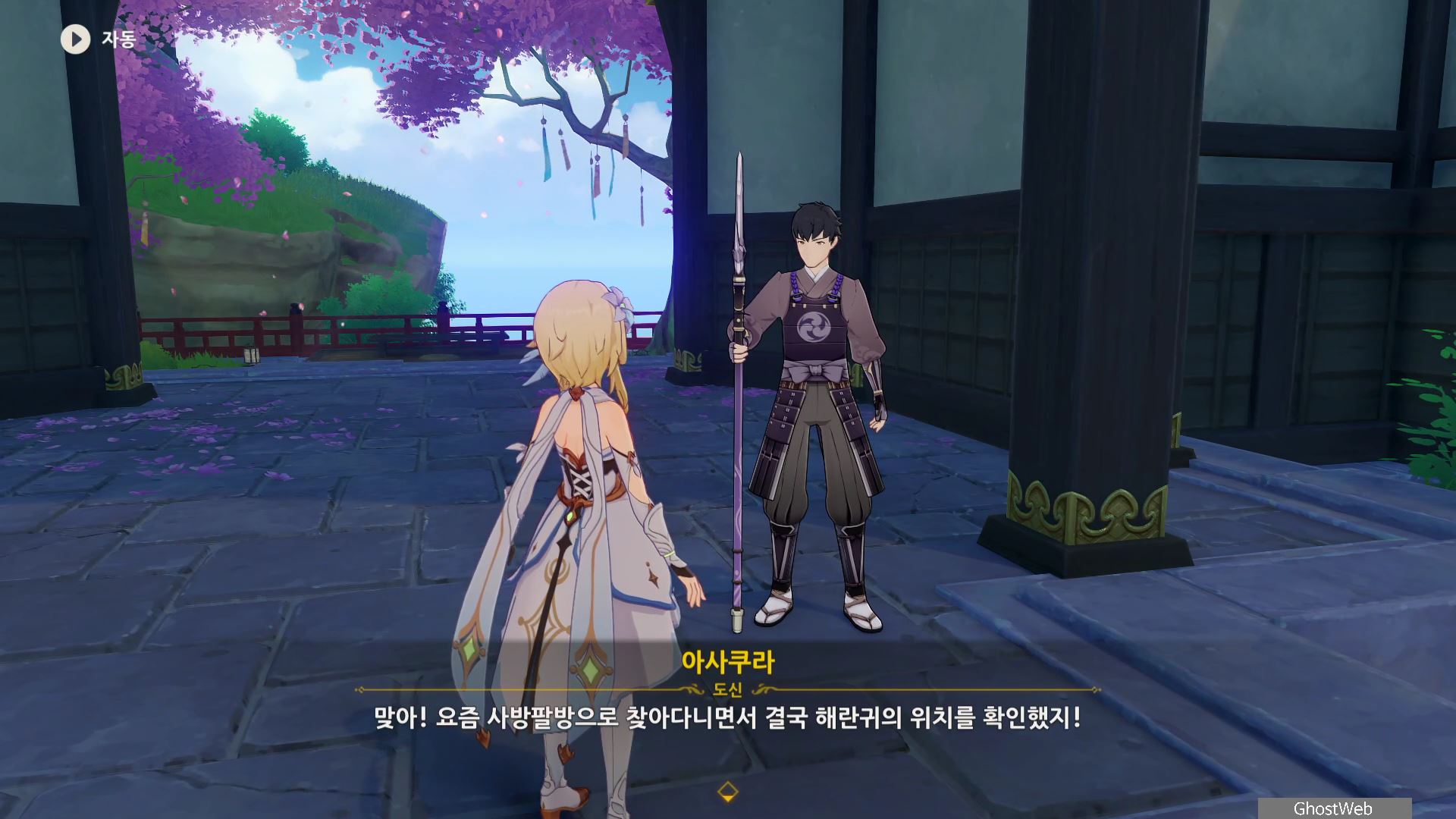 이나즈마 성 안 오른쪽 문 근처에 있는 아사쿠라와 대화를 통해 해란귀의 위치를 찾았다며, 여행자에게 이전의 복수를 위해 함께 해란귀들을 처치해달라는 부탁을 받아요.
