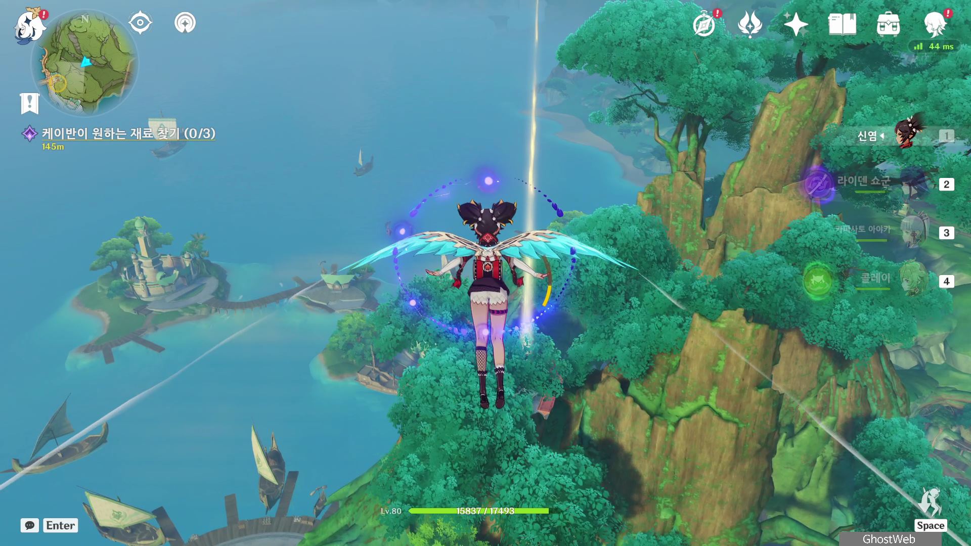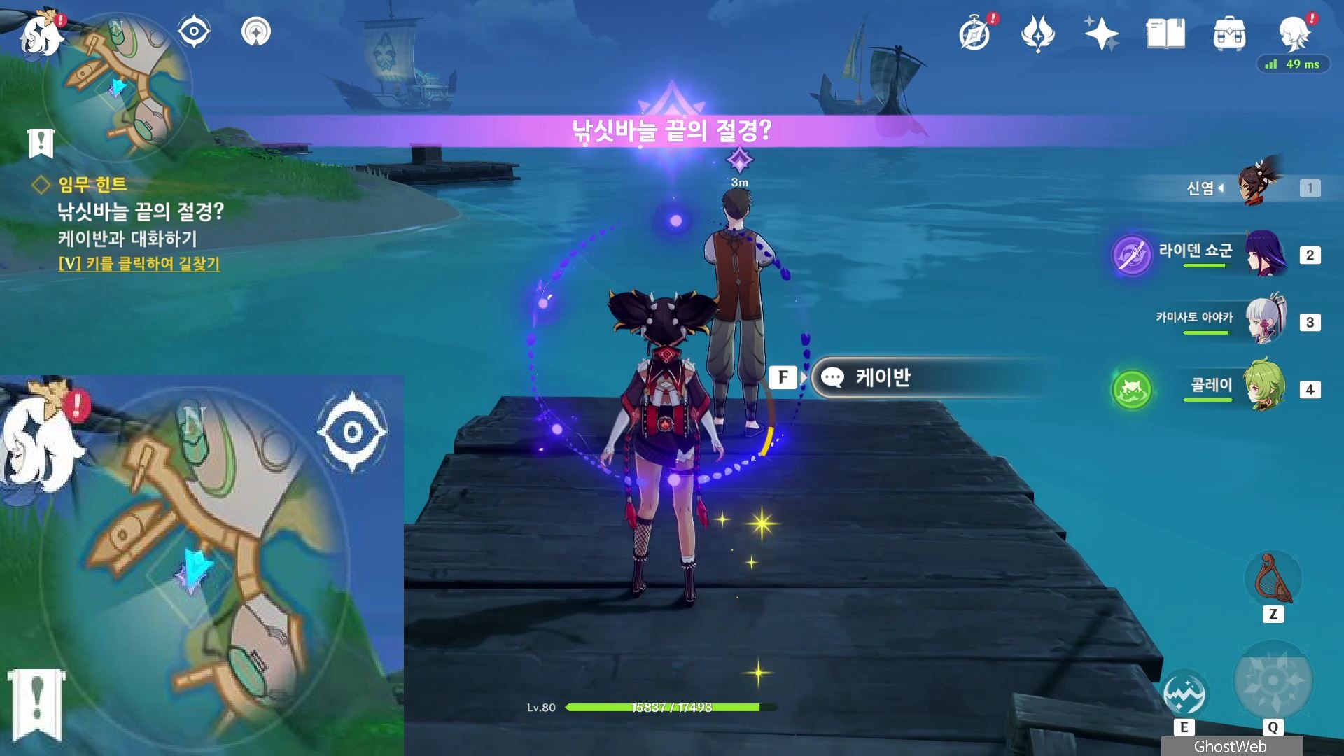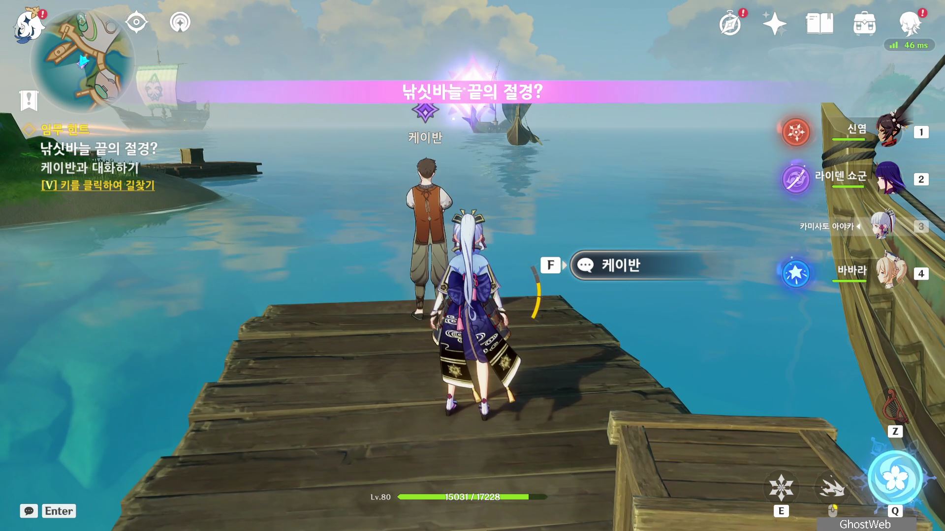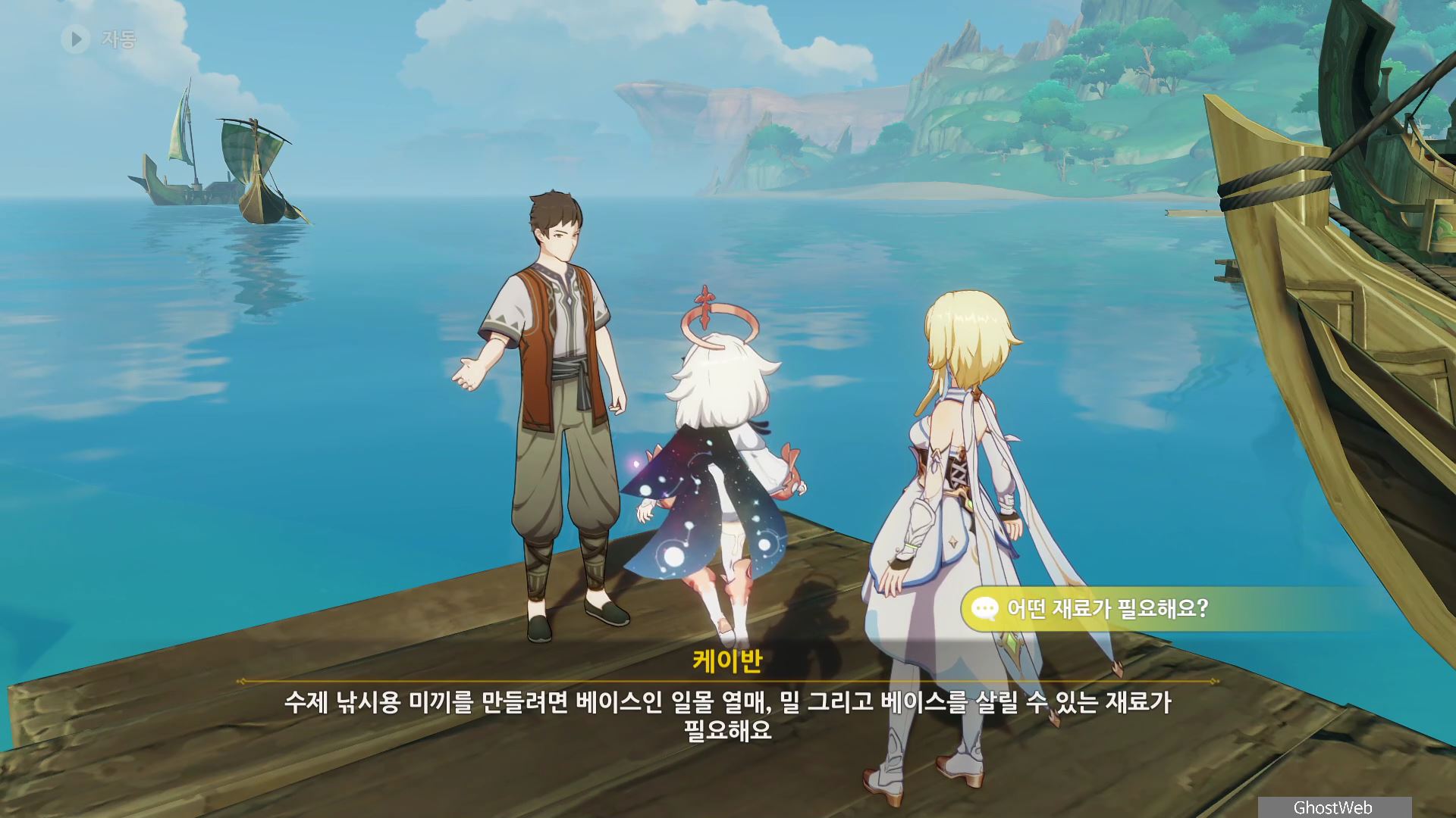낚시꾼(?)인 케이반은 여기가 좋은 낚시 포인트라면서 여행자에게 낚싯바늘 끝의 절경을 보여주겠다며, 낚시용 미끼로 만들 재료인 일몰 열매, 밀과 <신선한 새알>을 가져다 달라고 부탁을 해요.
