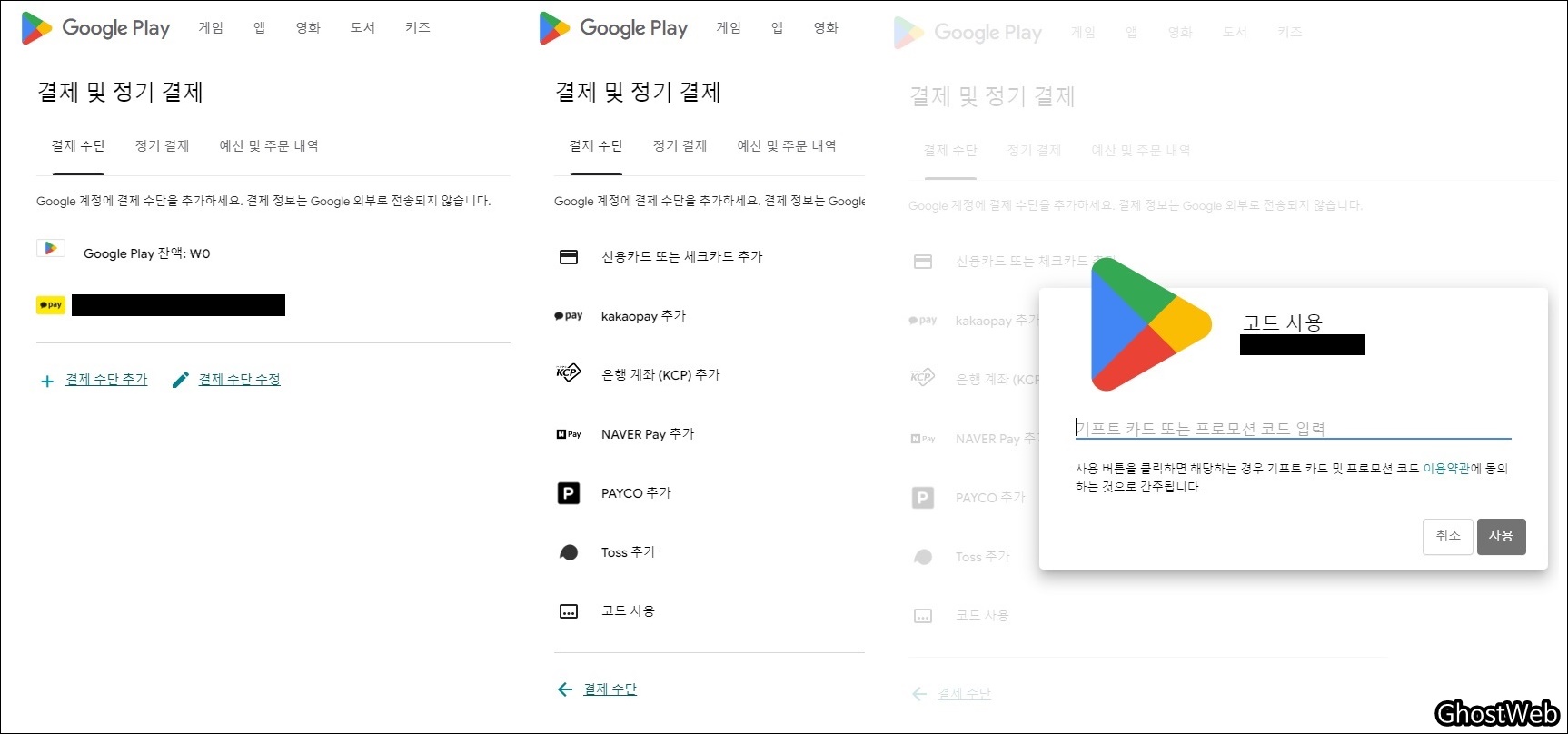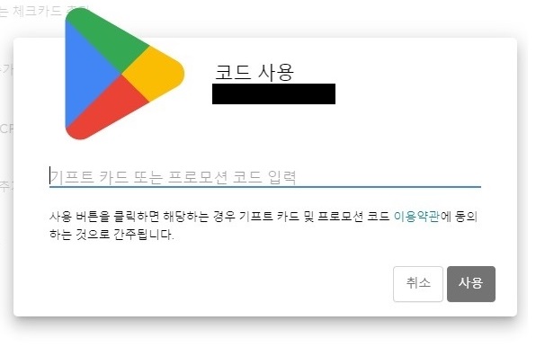 결제 및 정기 결제 페이지에서 아래 쪽에 있는 <결제 수단 추가>를 클릭하면 나오는 결제 수단 란에서 <코드 사용>을 클릭하고 나오는 창에서 구글 기프트카드의 코드를 입력하고 <사용> 버튼을 클릭하면 기프트카드의 금액만큼 충전된 것을 볼 수 있어요.