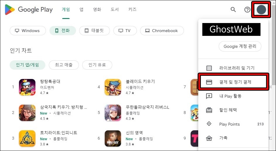 저는 크롬에 구글 계정이 로그인 되어 있어서, 로그인을 하지 않아도 되지만 로그인이 안되어 있으신 분은 로그인 후 오른쪽 상단에 있는 아이콘을 클릭하면 나오는 메뉴에서 <결제 및 정기 결제>를 클릭하세요.