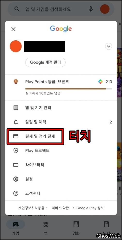 구글 플레이 앱을 실행 한 후, 오른쪽 상단에 있는 아이콘을 터치하고 나오는 메뉴에서 <결제 및 정기 결제>를 터치 하세요.