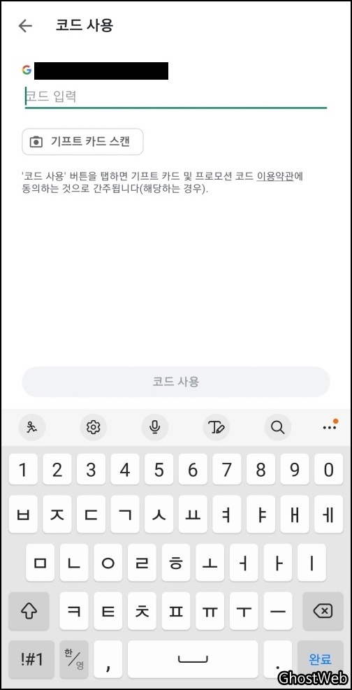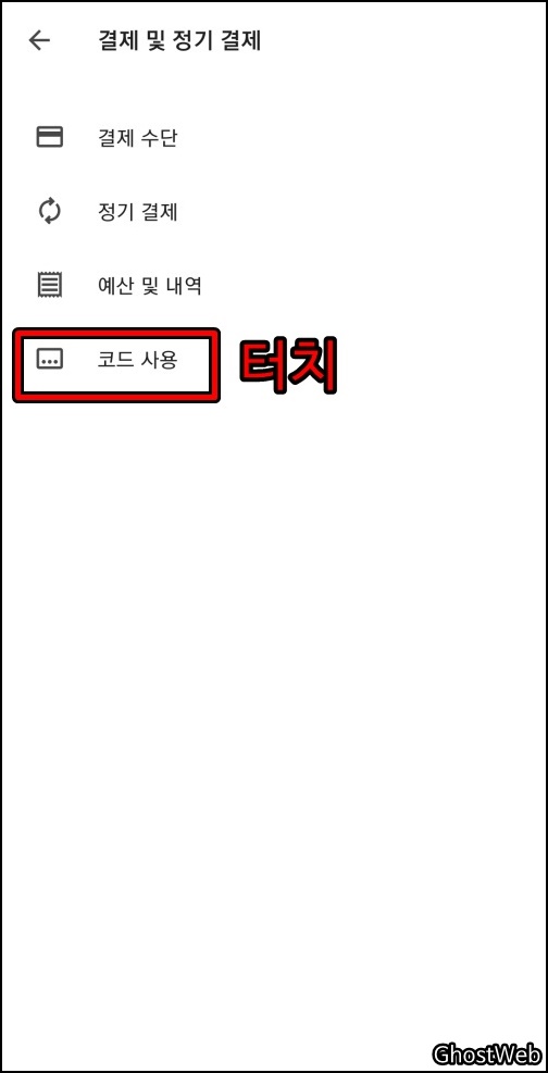 그 다음 나오는 결제 및 정기 결제 창에서 맨 아래 있는 <코드 사용>을 터치한 후, 나오는 코드 사용 창에서 <기프트 카드 코드를 입력>하거나 <기프트 카드 스캔>을 하여 코드를 입력한 후 아래의 코드 사용 버튼을 클릭하면 돼요.