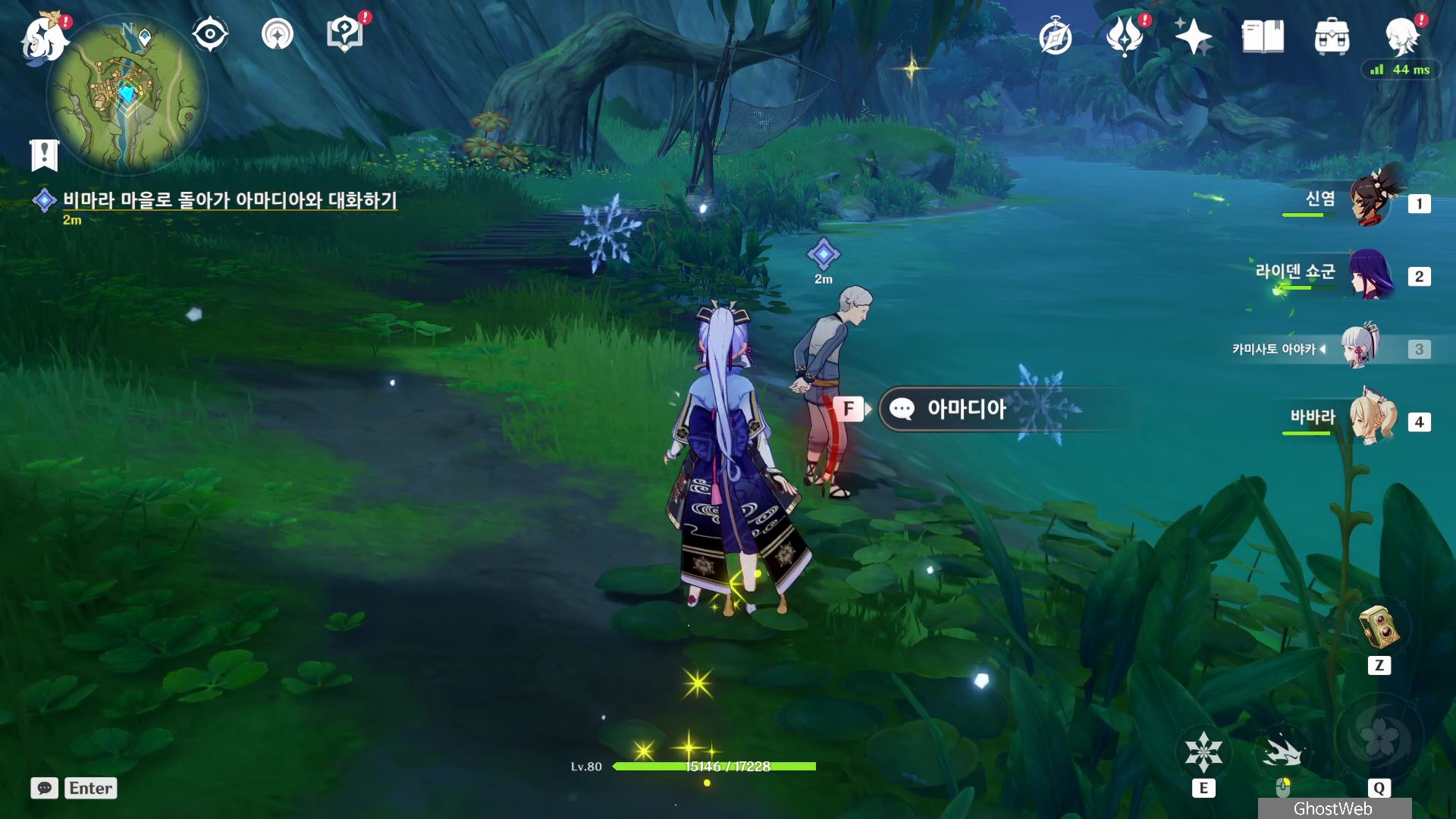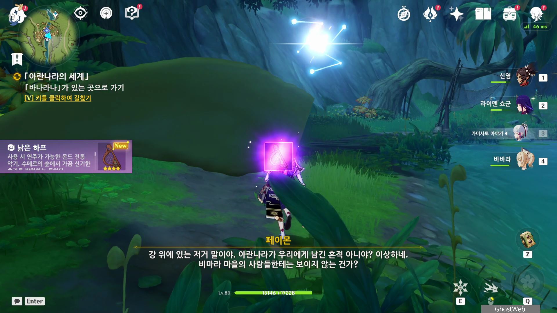 비마라 마을로 돌아가 아마디아와 대화를 하여 <낡은 하프>를 받고 인벤토리(가방)에서 하프를 장착하고, 라나를 치료하기 위한 비야의 열매를 얻기 위해 물길을 따라 바나라나 위치가 표시되는 곳으로 이동하세요.