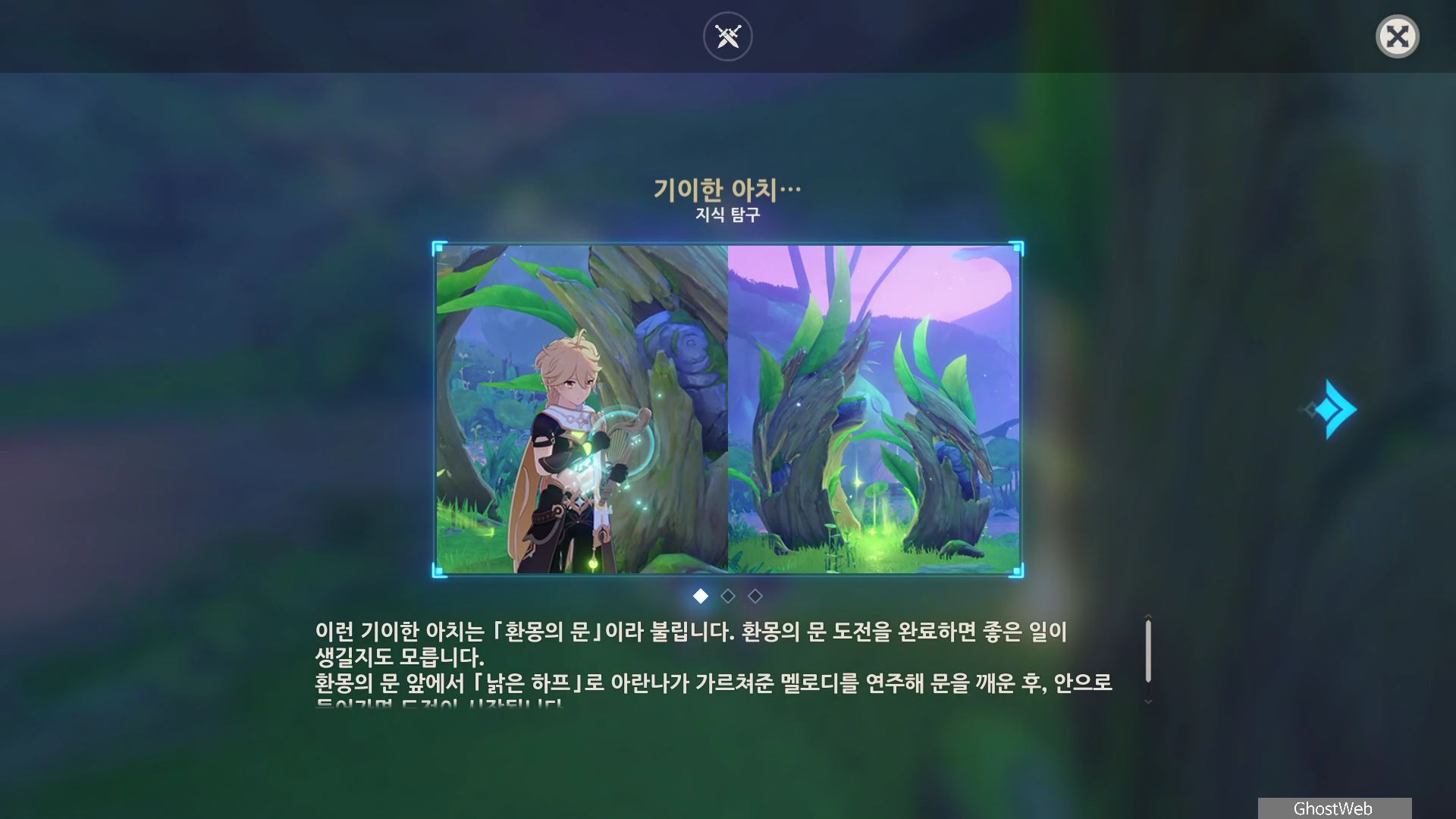 | [원신] 숲속의 노래 (숲의 책 | 제2장 - 꿈속의 모밭, 아슈바타 전당, 바소마 열매) (0) | 2022.10.19 |