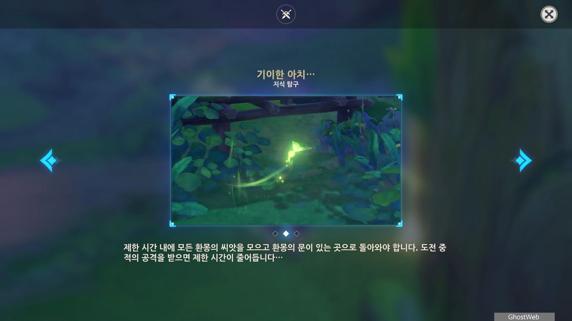 환몽의 문 시련은 제한 시간 내에 환몽의 씨앗을 모아서 다시 아치로 돌아오면 되는데, 적의 공격을 받으면 제한 시간이 줄어들며, 모든 환몽의 씨앗을 모아오면 <진귀한 보물상자>가 나타나 보상을 얻을 수 있어요.