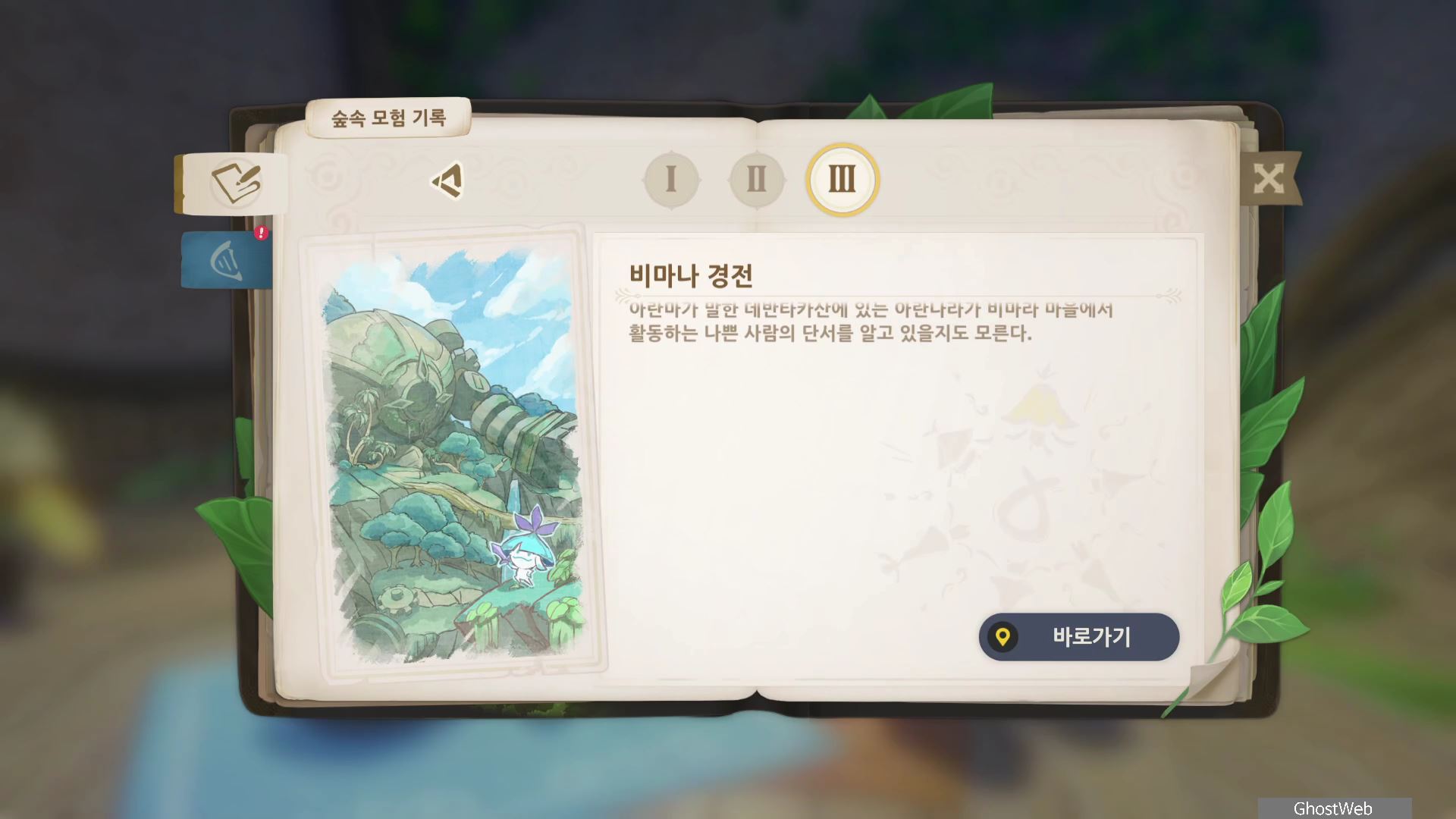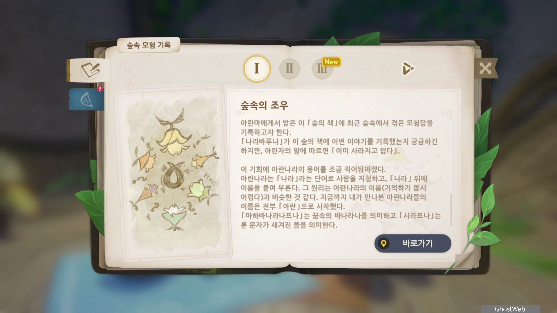 그리고 데반타카산에서 조사를 하고 있는 <아란리캔>을 봤다고 하며, 나라바루나가 남긴 <숲의 책>을 얻을 수 있는데, 이 책이 가이드 북(미션 북, 단축키 V 또는 인벤토리에 열어 볼 수 있음)으로 관련 임무에 대한 정보를 얻을 수 있어요.