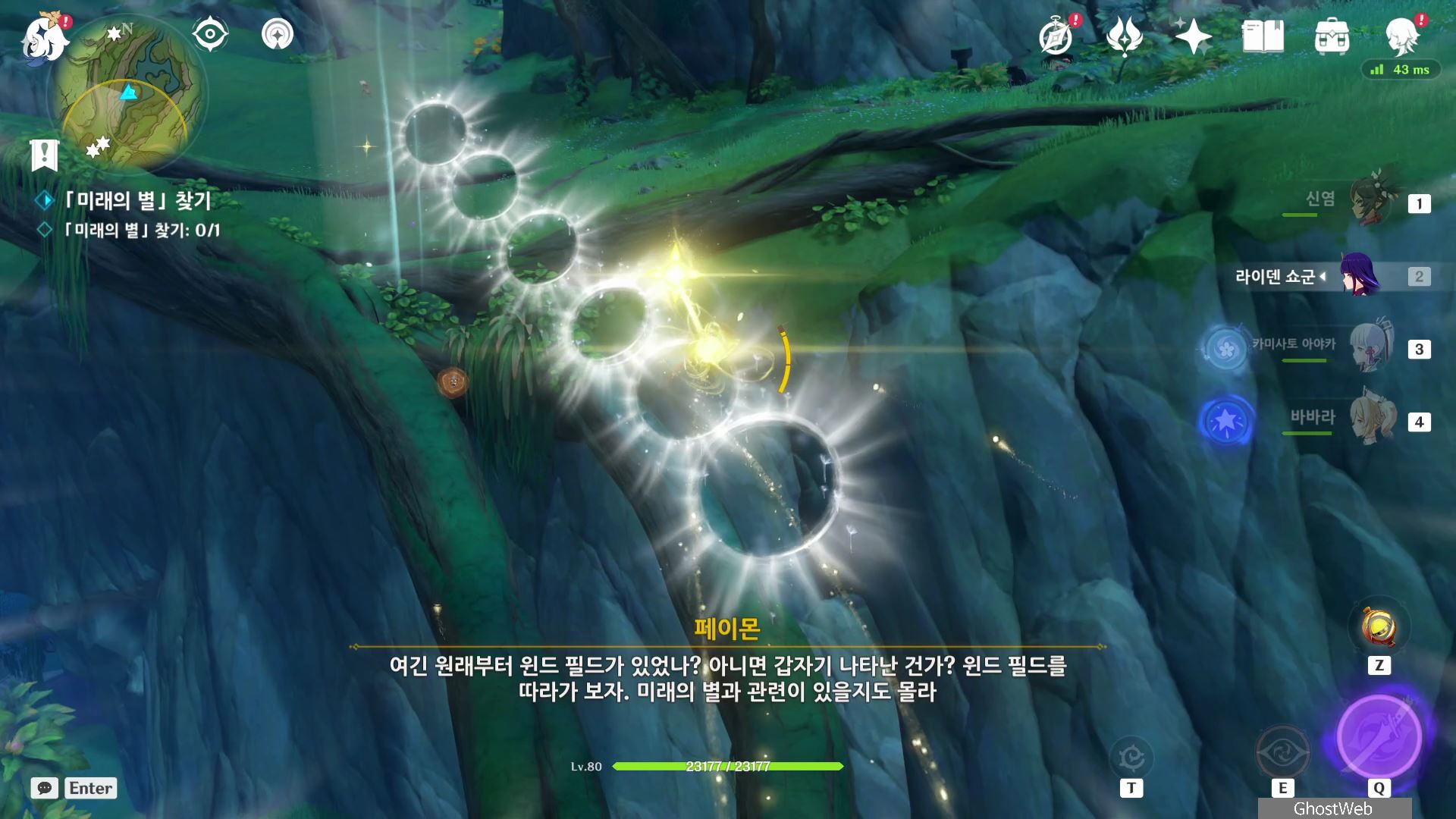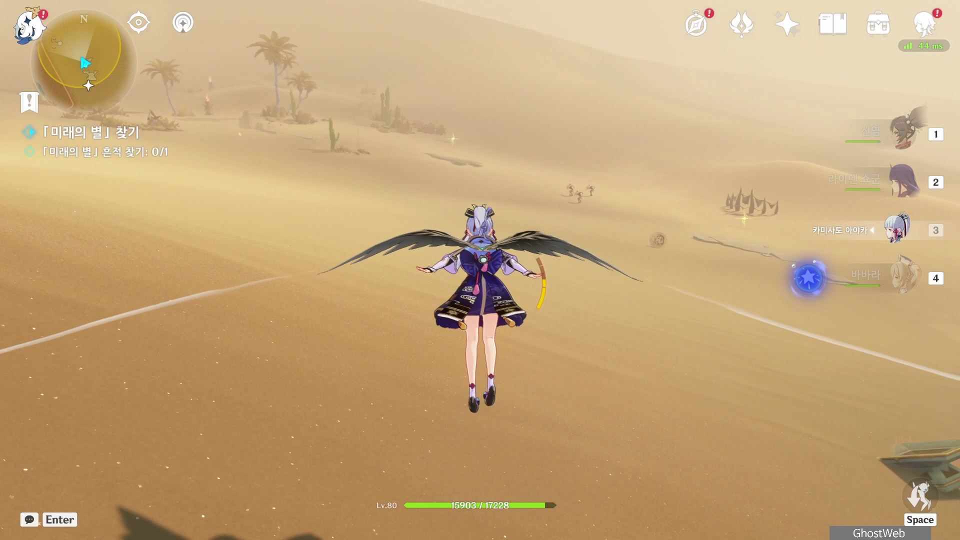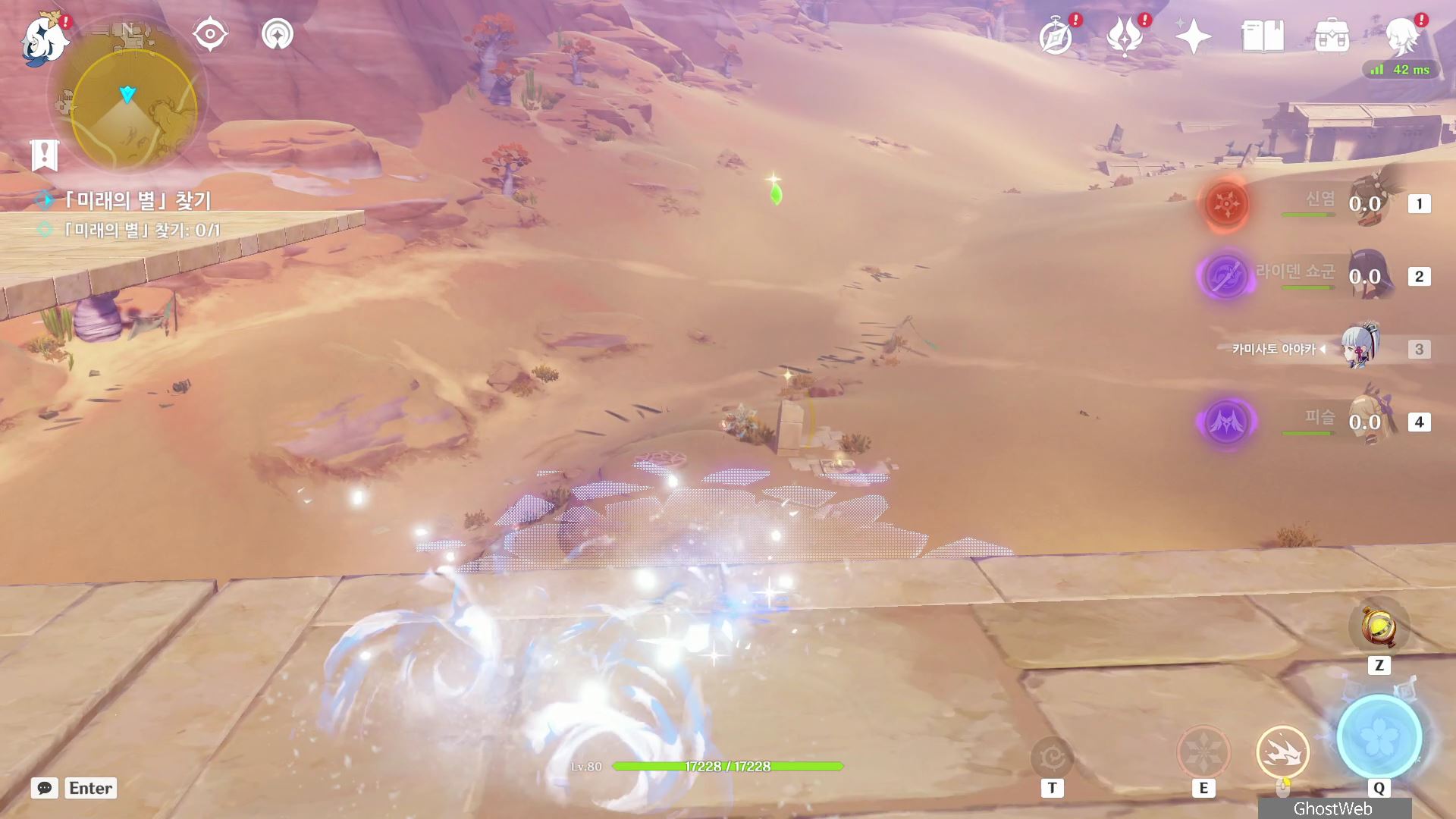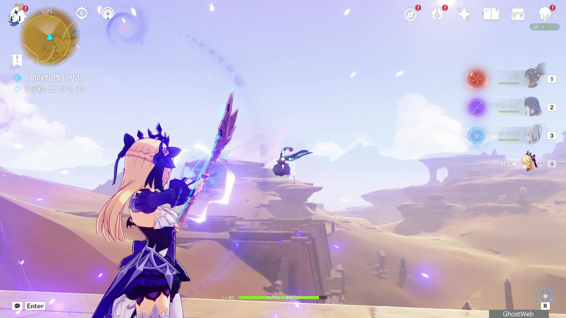 그 다음 미니맵에 이벤트 영역이 표시되는데, 윈 기준 9시 방향에 있는 부셔진 유적지 같은 곳 근처에 가면 이벤트 포인트다가가면 나타나는 적들을 처치하고 근처에 나타난 윈드 필드를 타고 유적지 기둥 위에 있는 미래의 별을 얻으면 돼요.