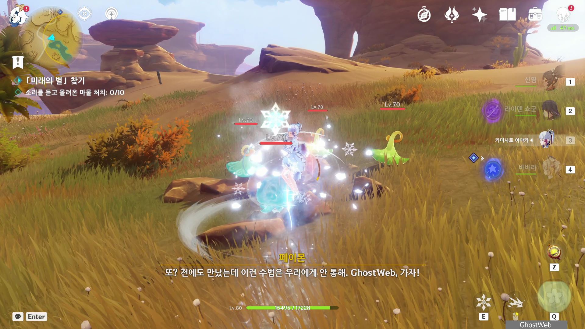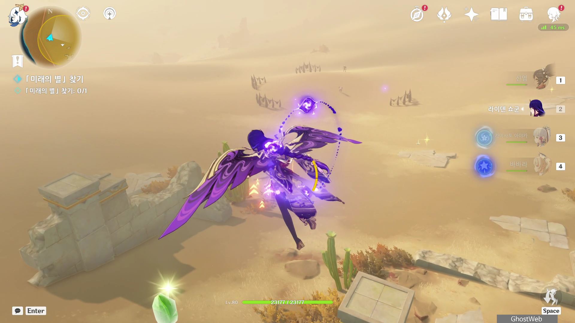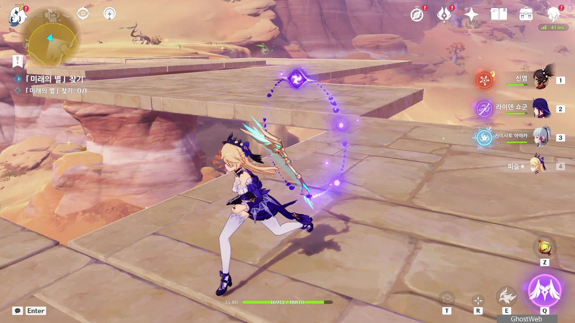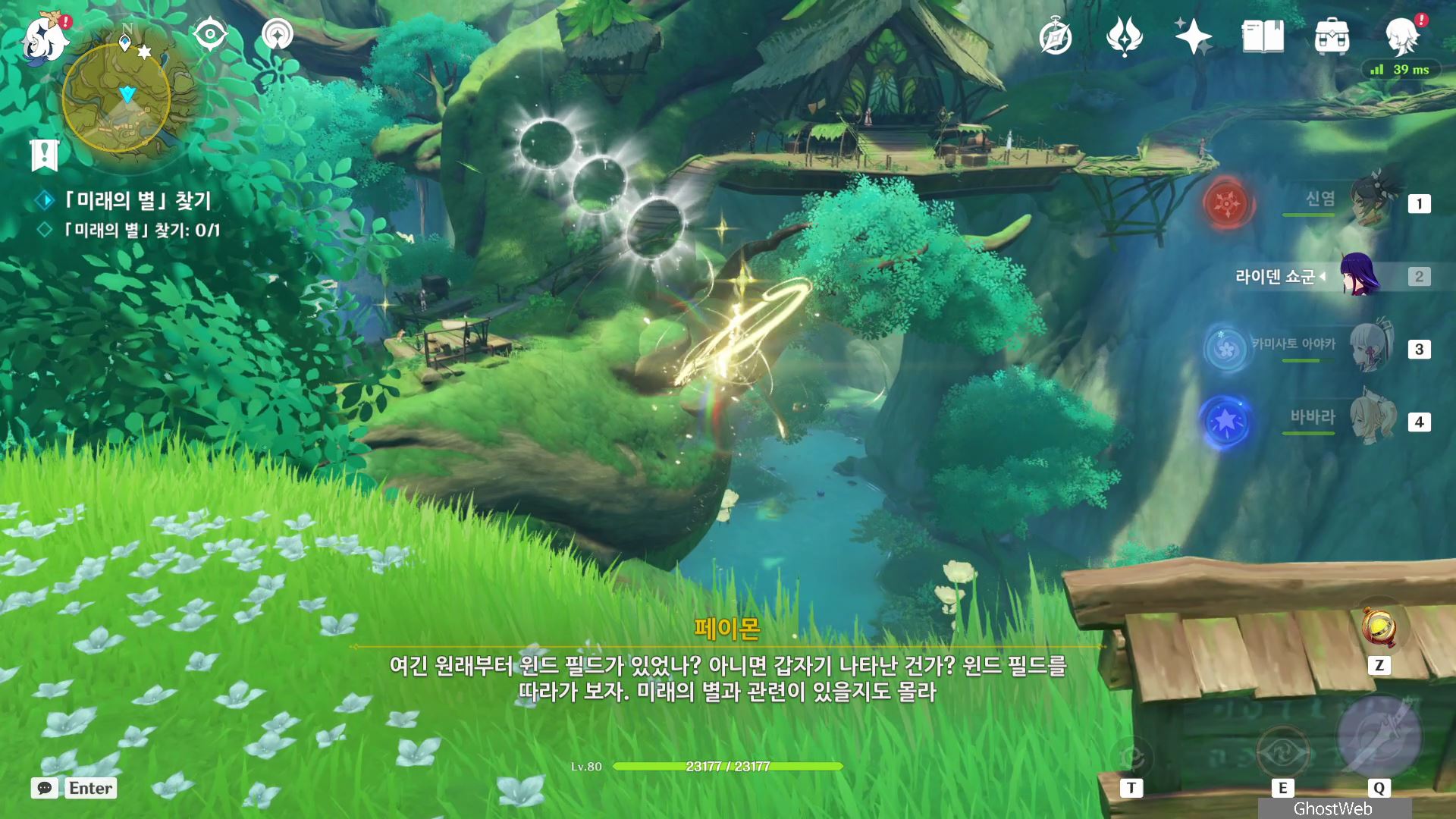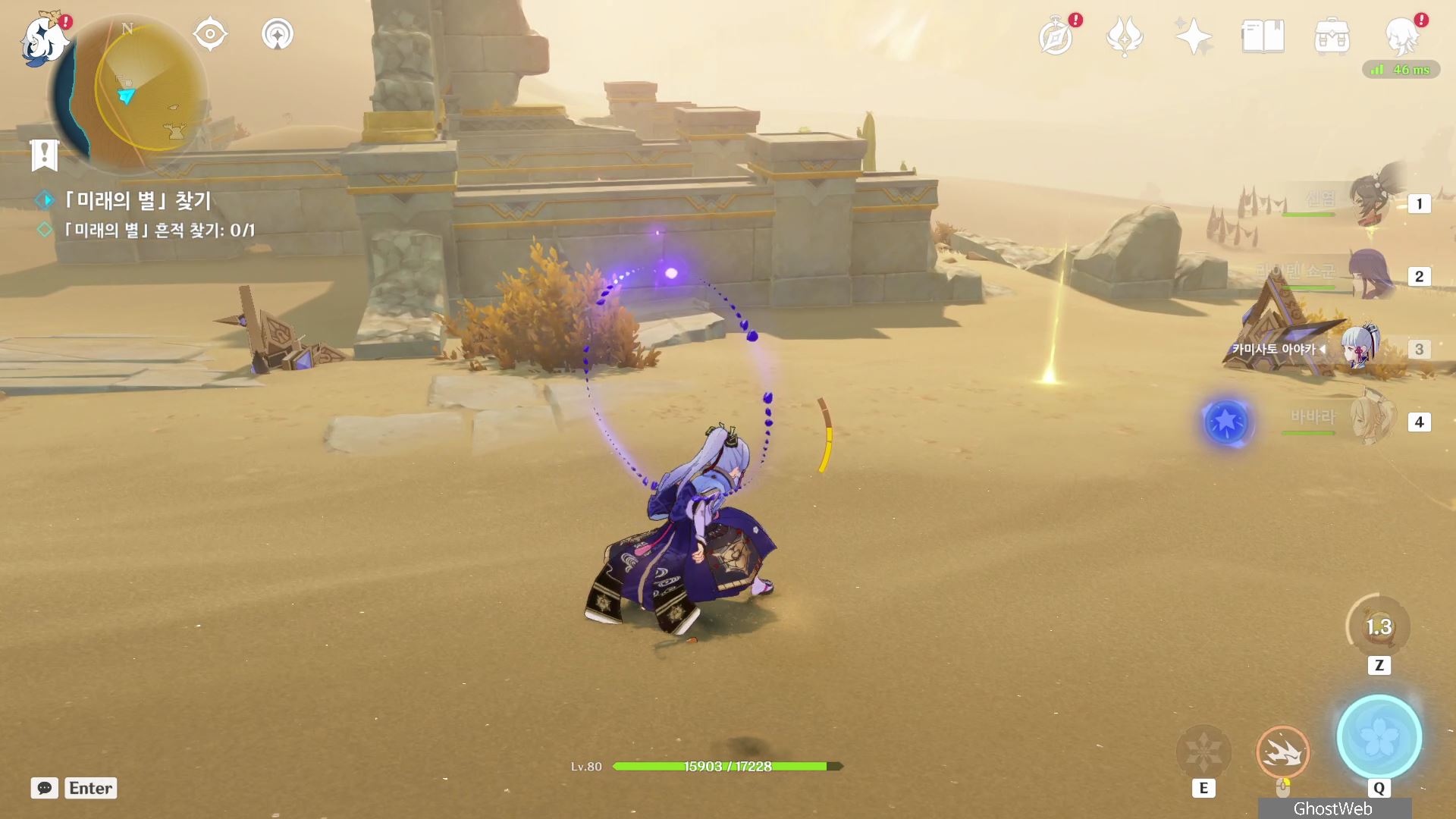 그 다음 미니맵에 이벤트 영역이 표시되는데, 윈 기준 9시 방향에 있는 부셔진 유적지 같은 곳 근처에 가면 이벤트 포인트다가가면 나타나는 적들을 처치하고 근처에 나타난 윈드 필드를 타고 유적지 기둥 위에 있는 미래의 별을 얻으면 돼요.