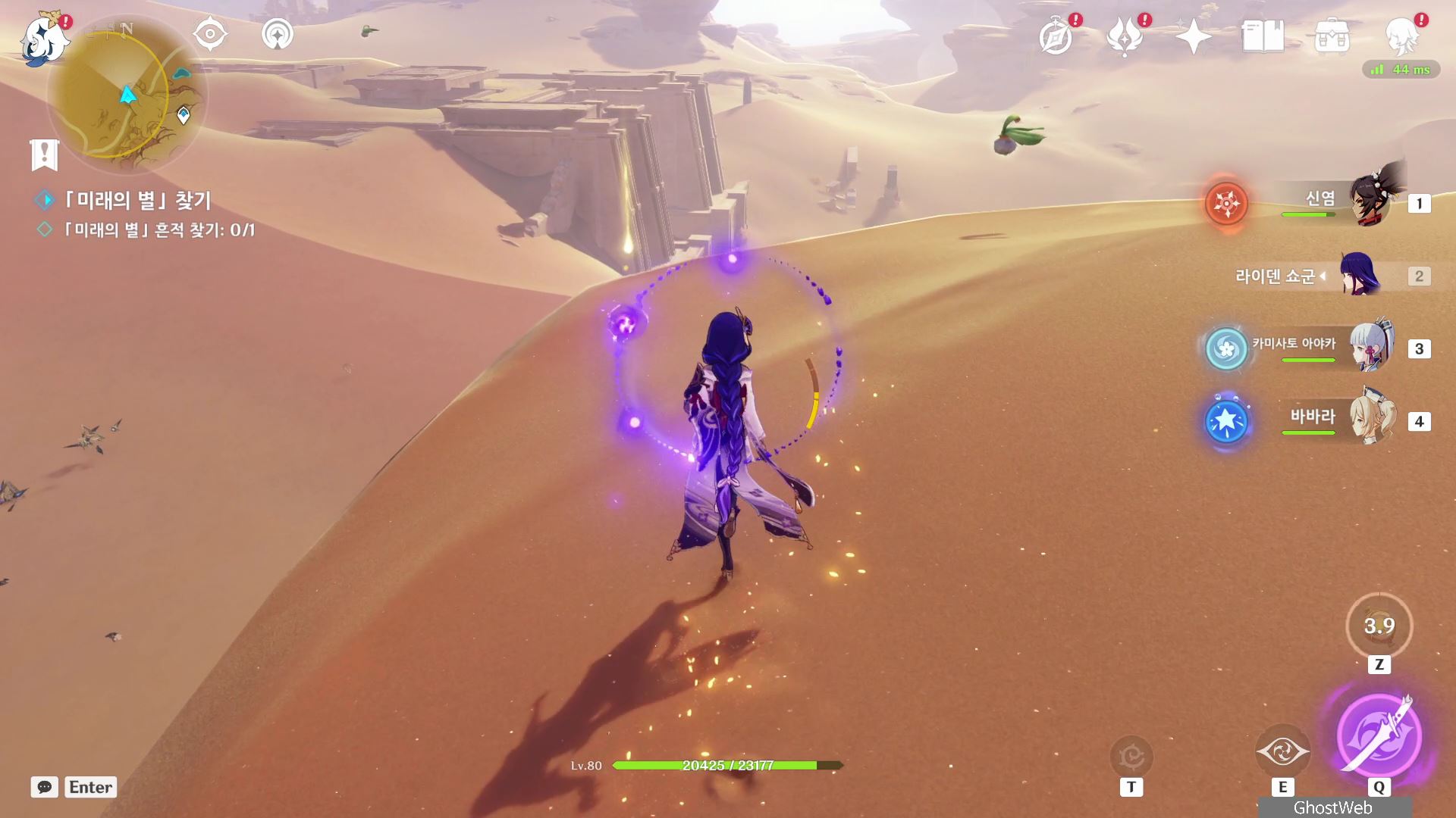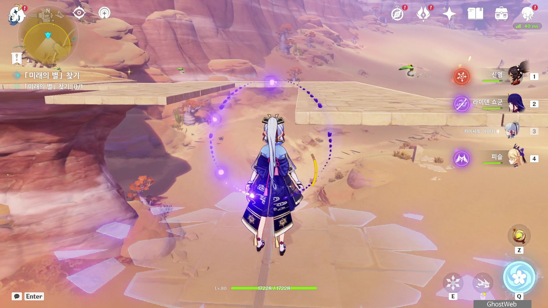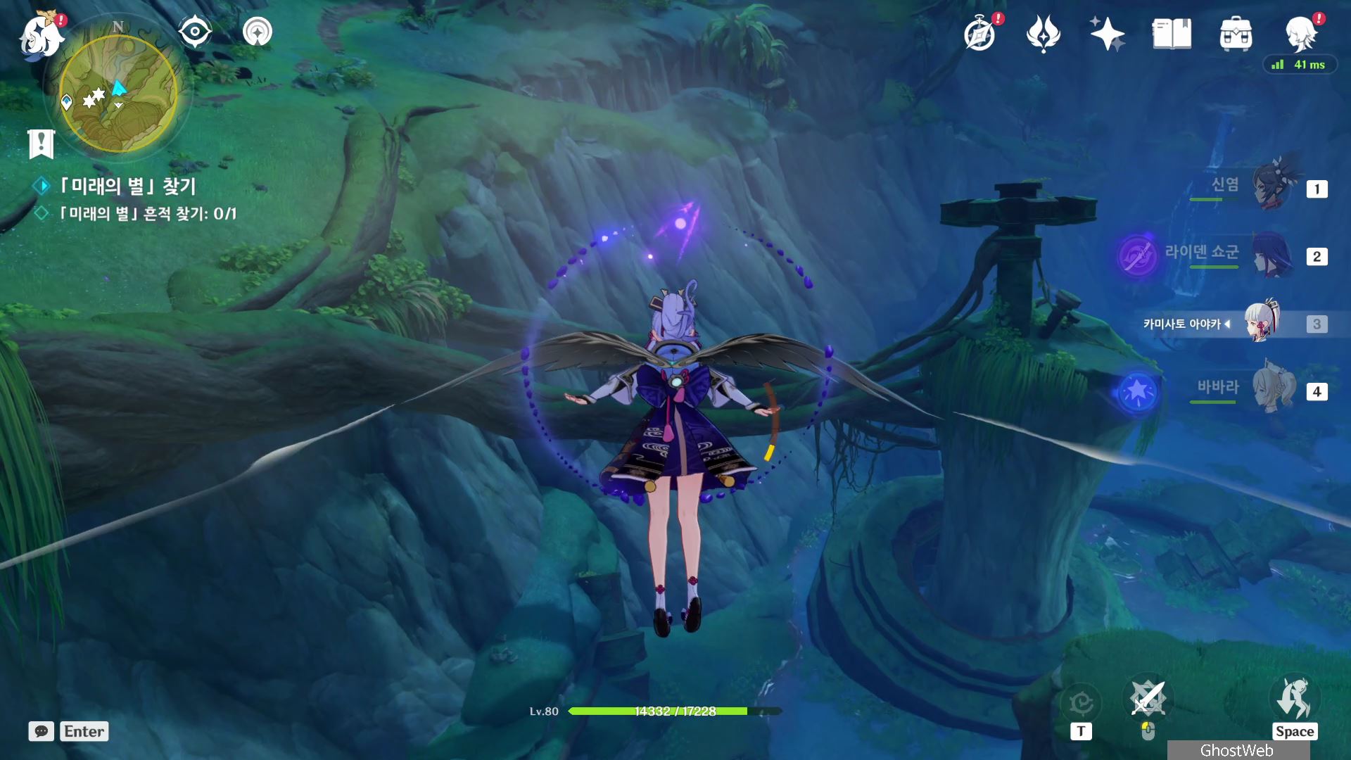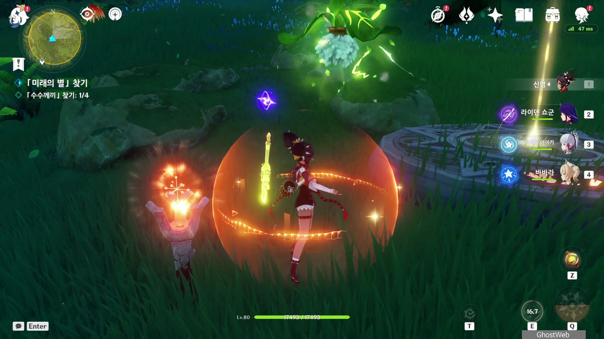 그 다음 미니맵에 이벤트 영역이 표시되는데, 윈 기준 9시 방향에 있는 부셔진 유적지 같은 곳 근처에 가면 이벤트 포인트다가가면 나타나는 적들을 처치하고 근처에 나타난 윈드 필드를 타고 유적지 기둥 위에 있는 미래의 별을 얻으면 돼요.