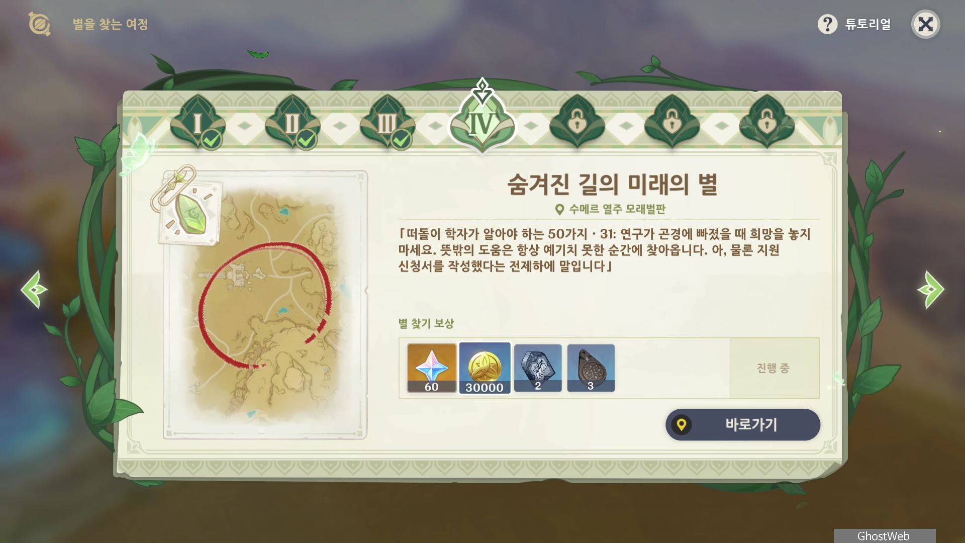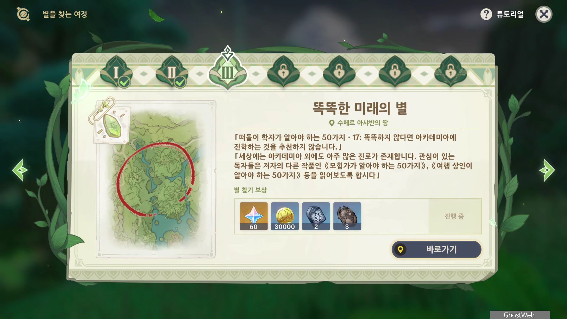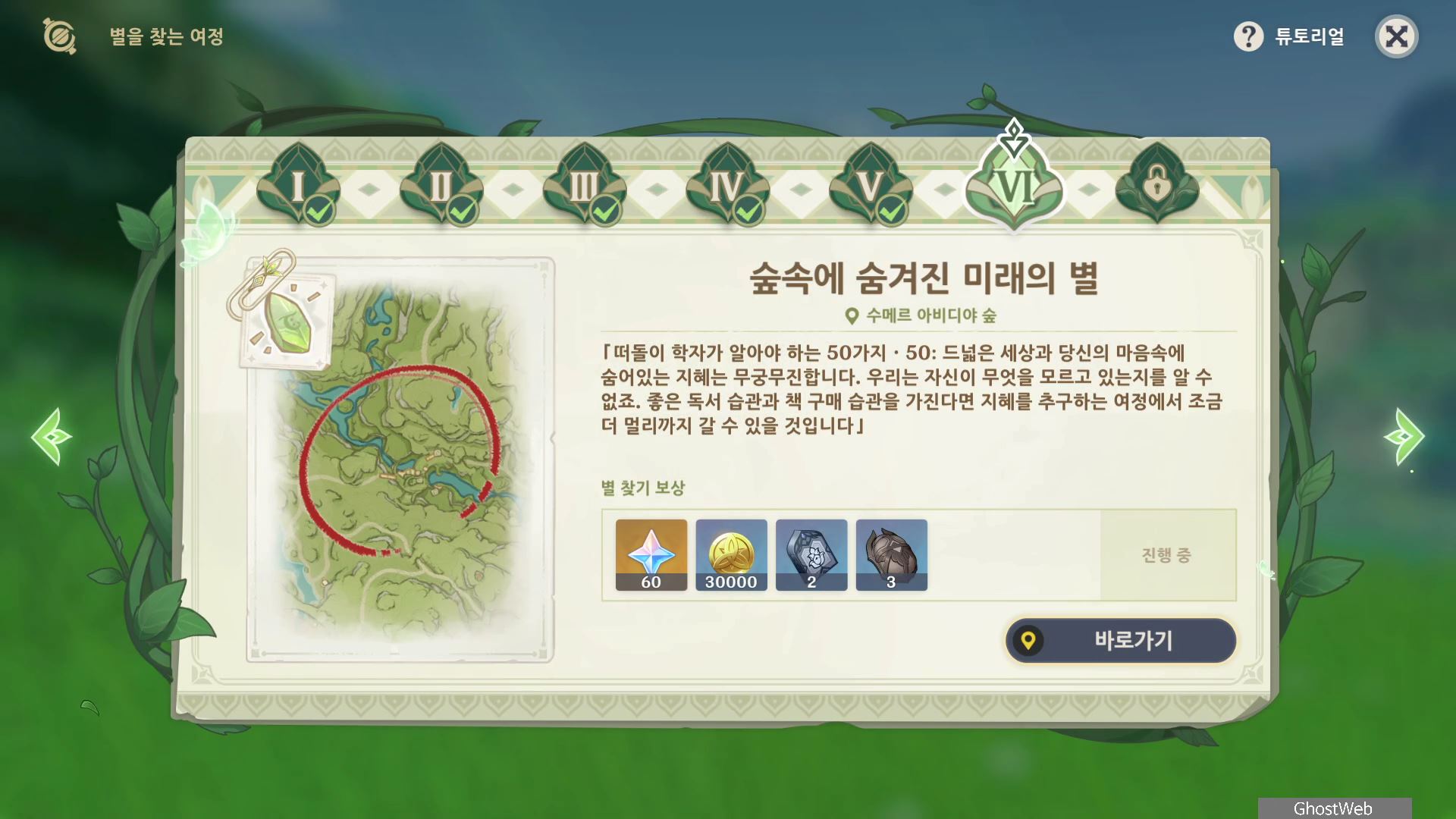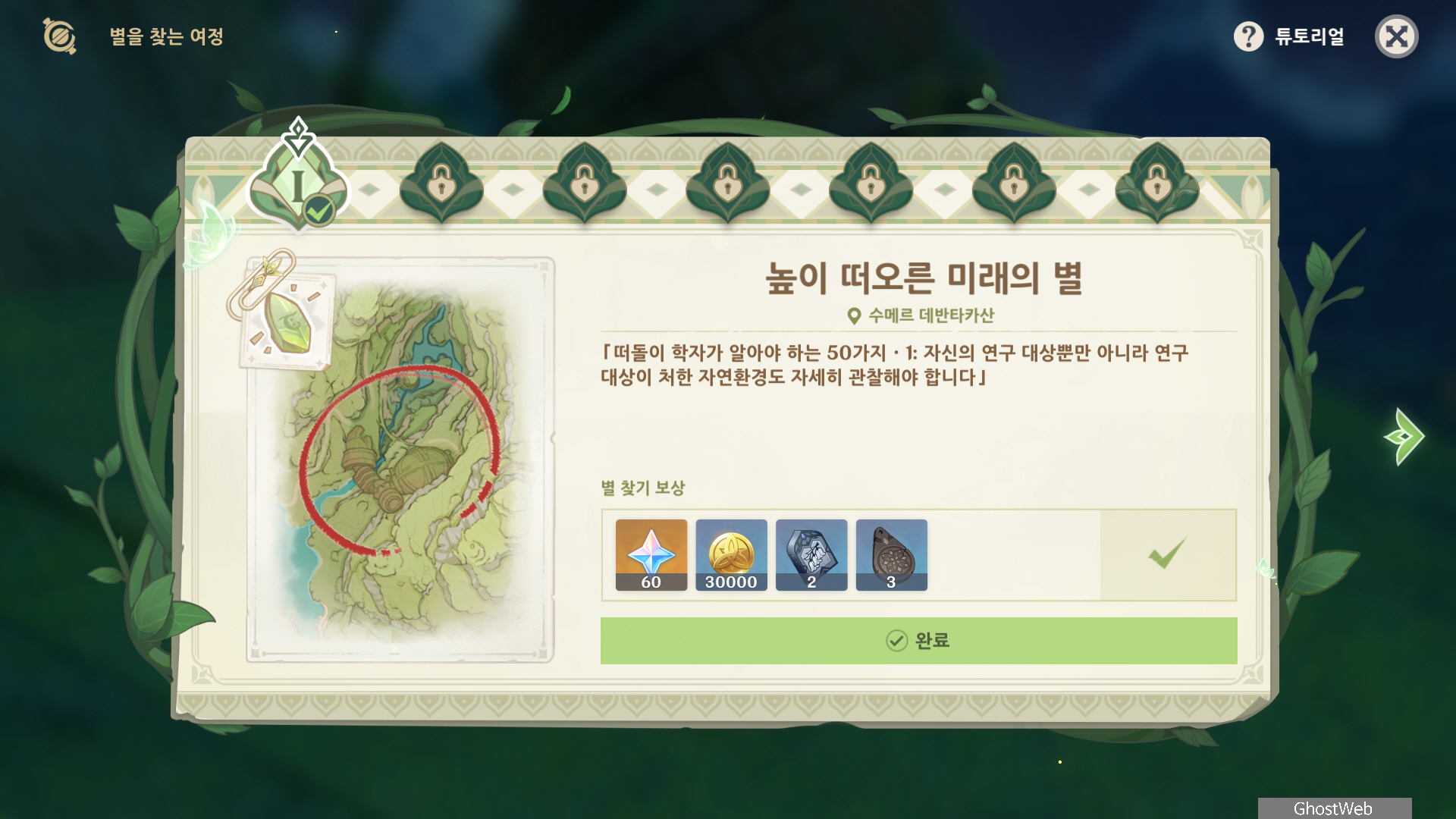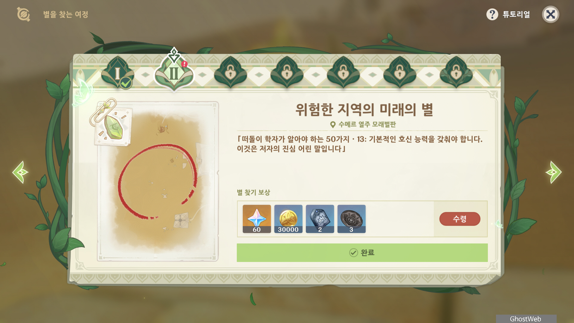 보상 : 원석 60개, 30000 모라, 창의의 인도, 오아시스 화원의 은혜