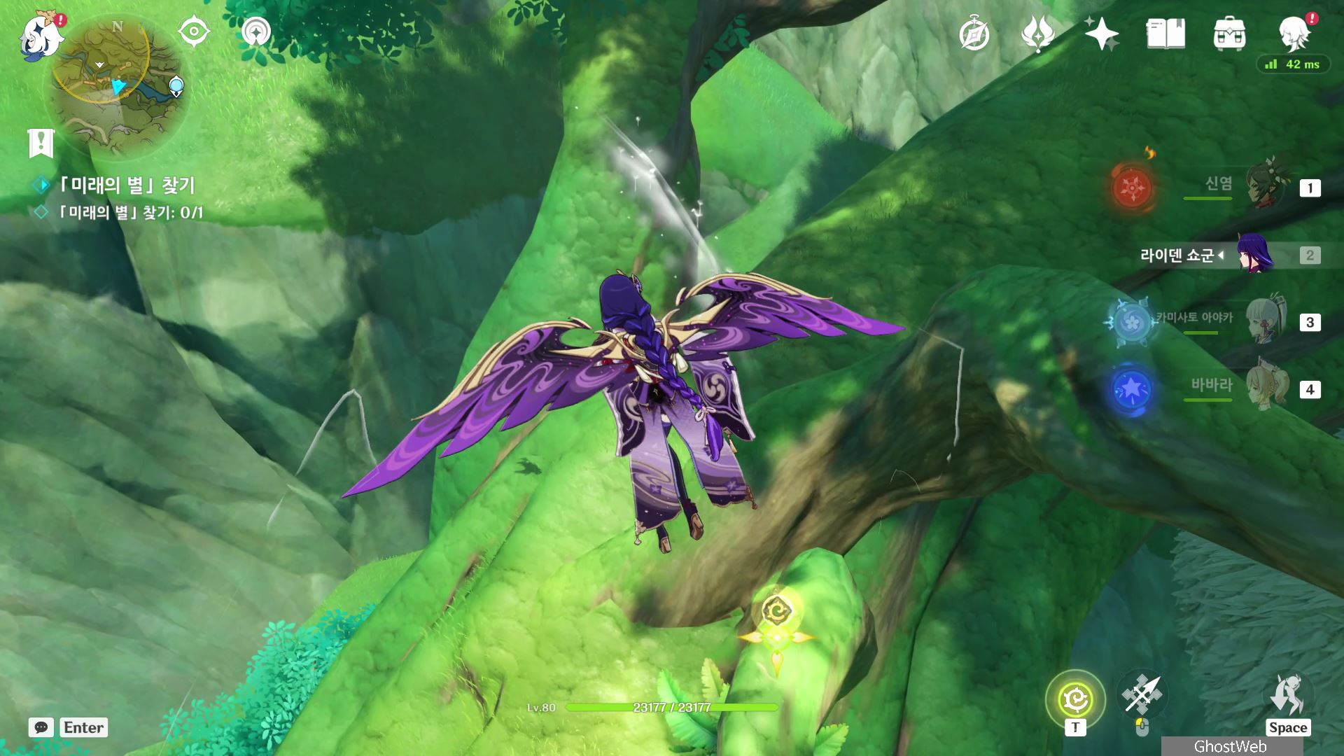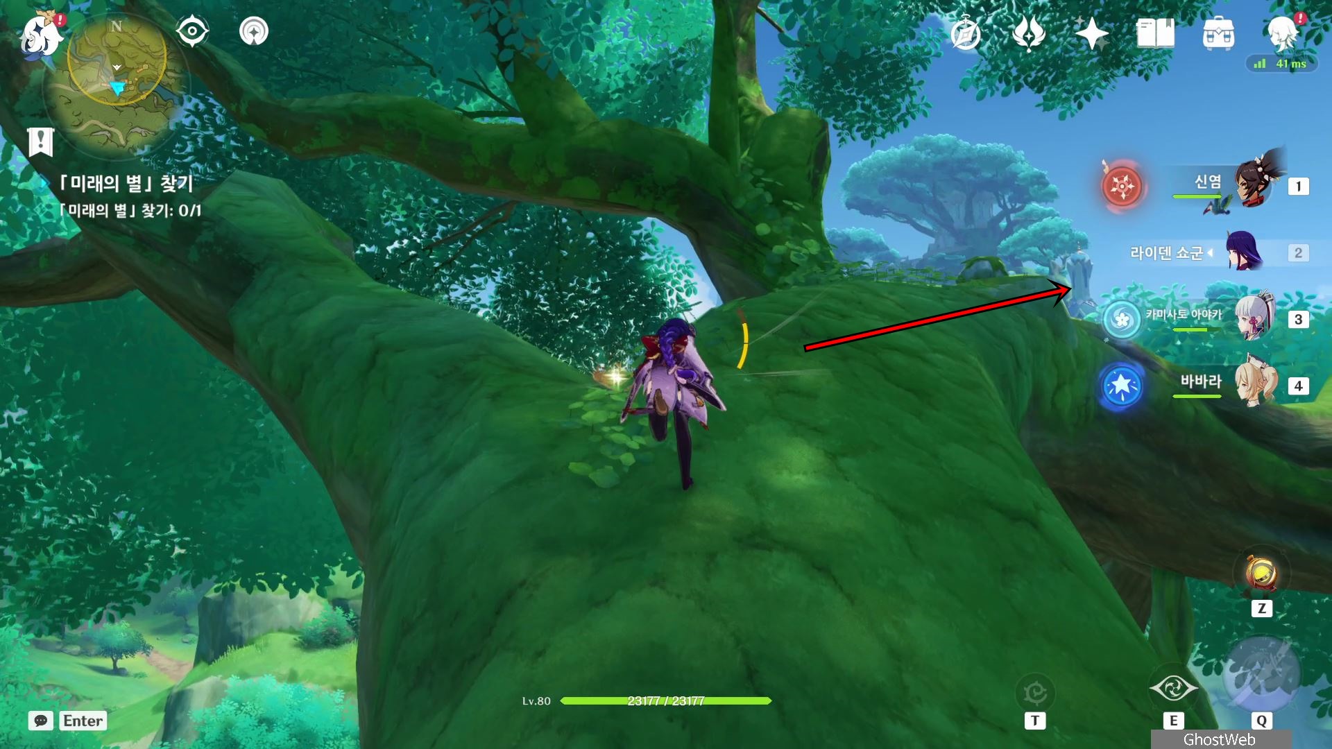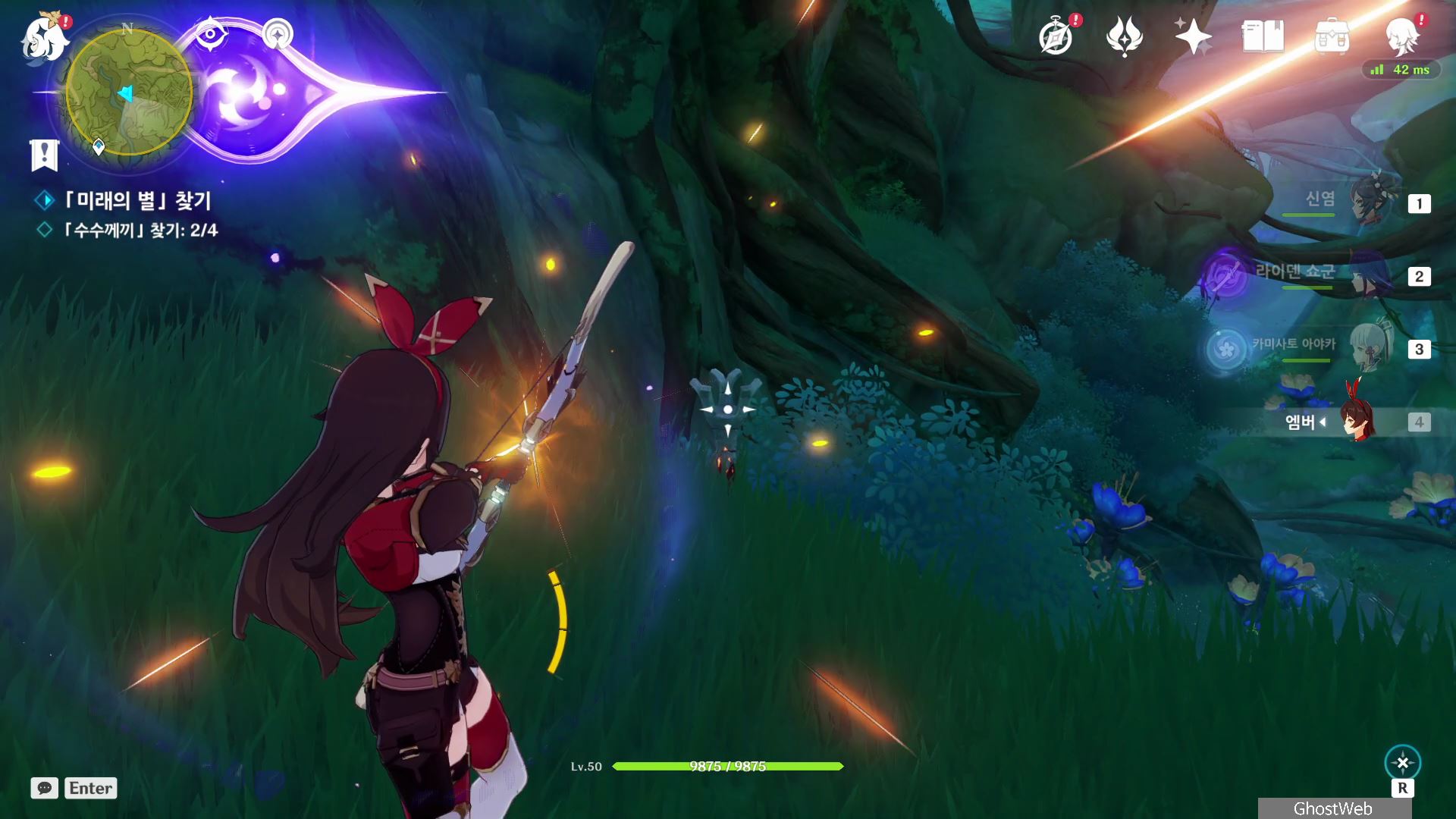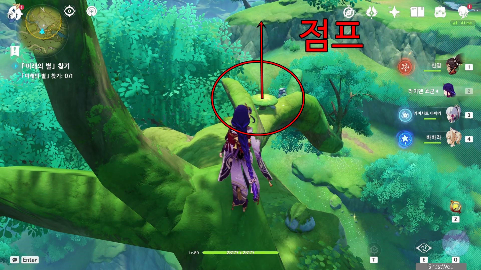 비행을 하다 가면 절벽에 황금색으로 빛나는 포인트가 시작점인데, 앞서 3번째에서 보았던 날아다니는 씨앗이 공중을 비행하고 있는데, 해당 씨앗을 번개 원소 캐릭터(리사, 피슬, 라이덴 쇼군 등 번개 원소 캐릭터를 이용)로 원소 공격을 가하면 안보이던 있던 길이 나타나요.