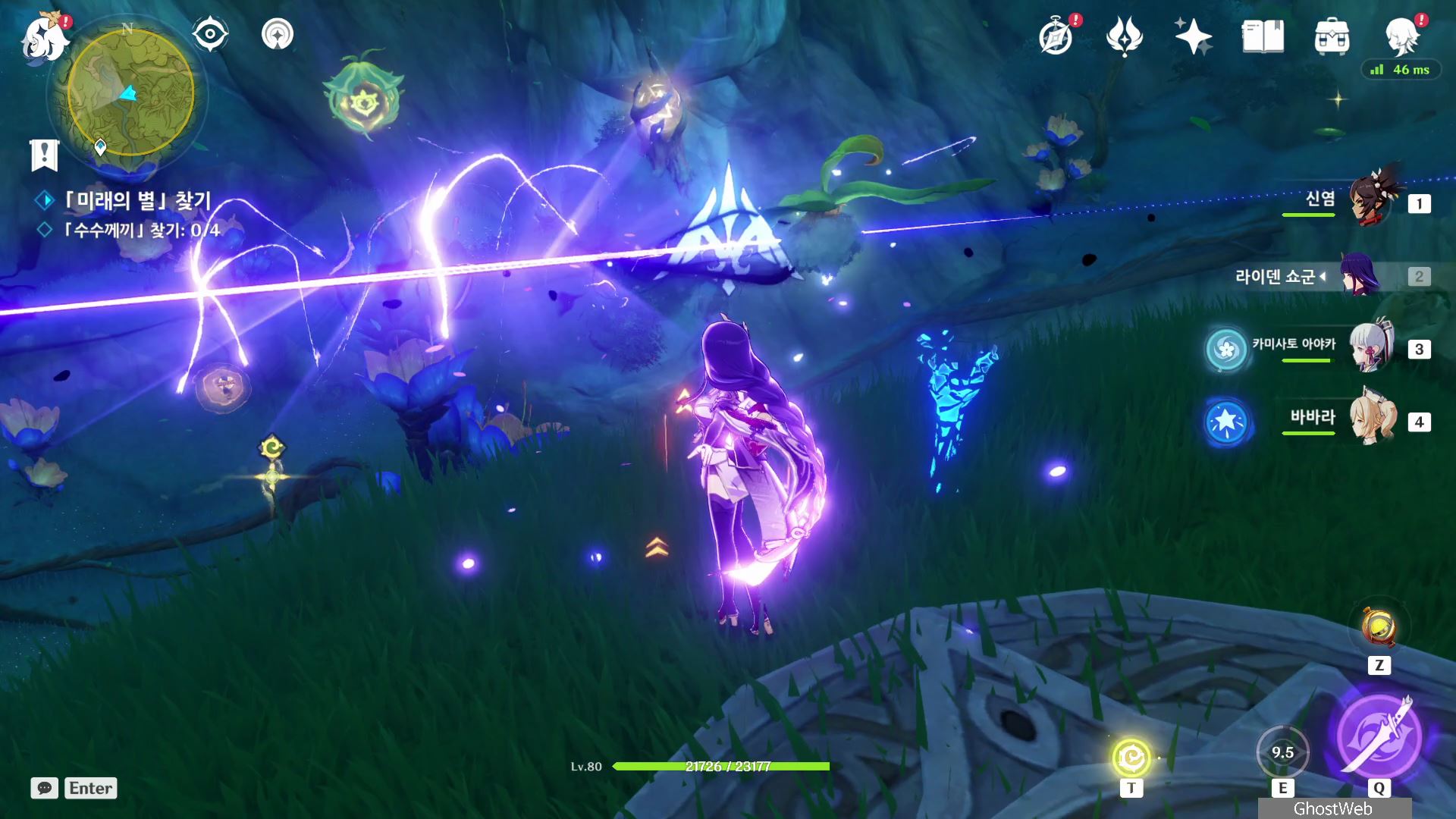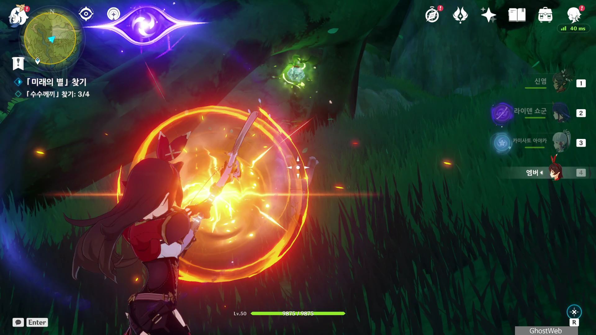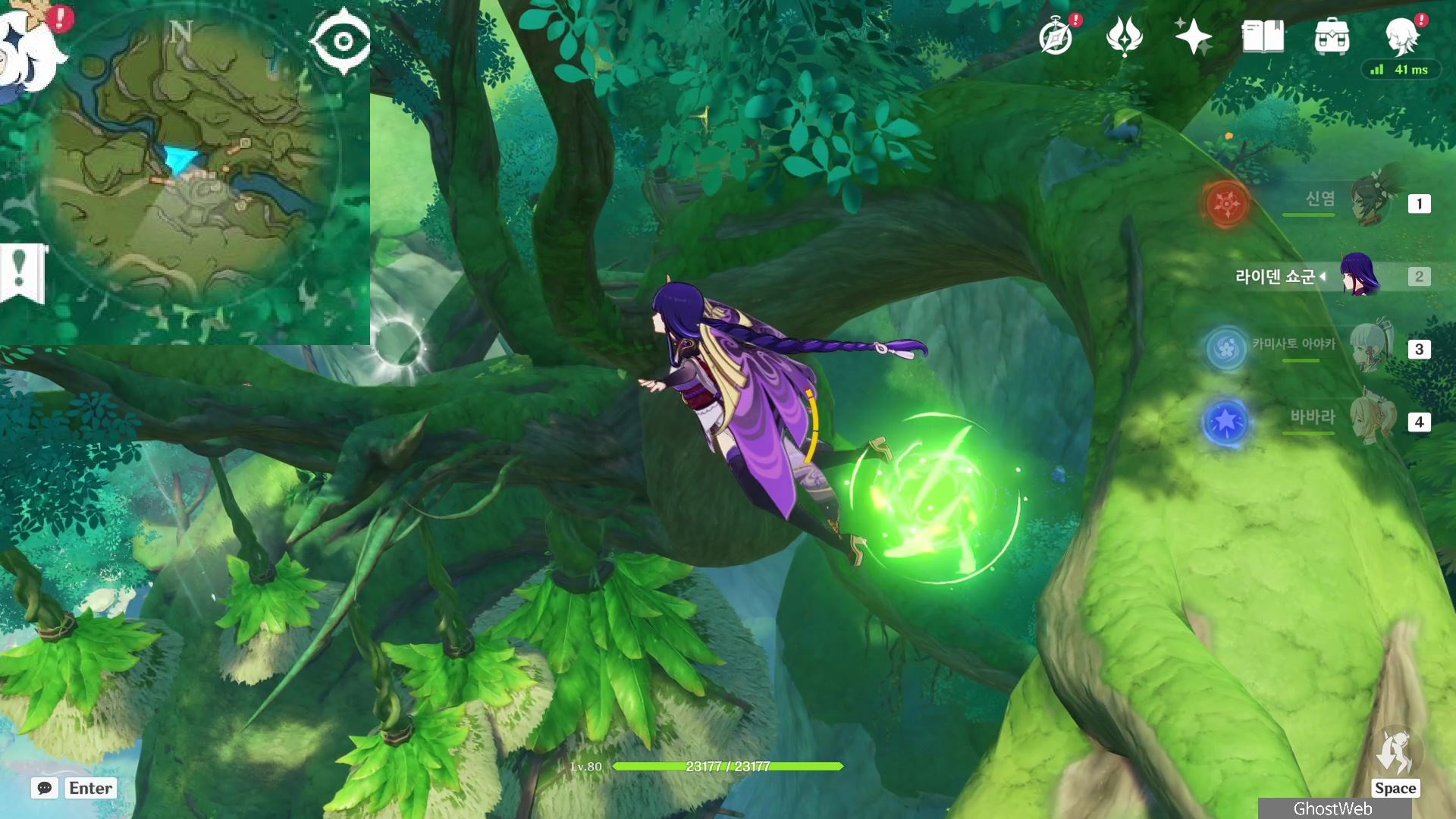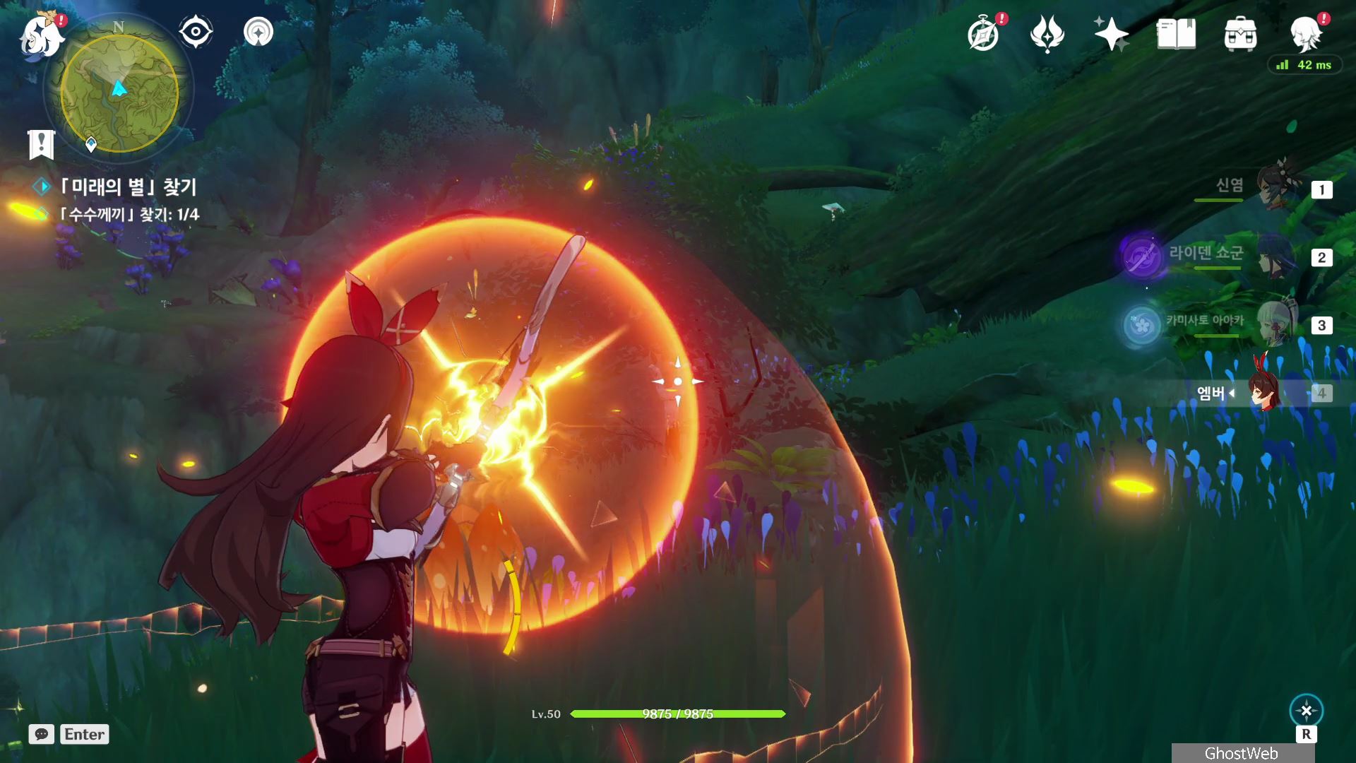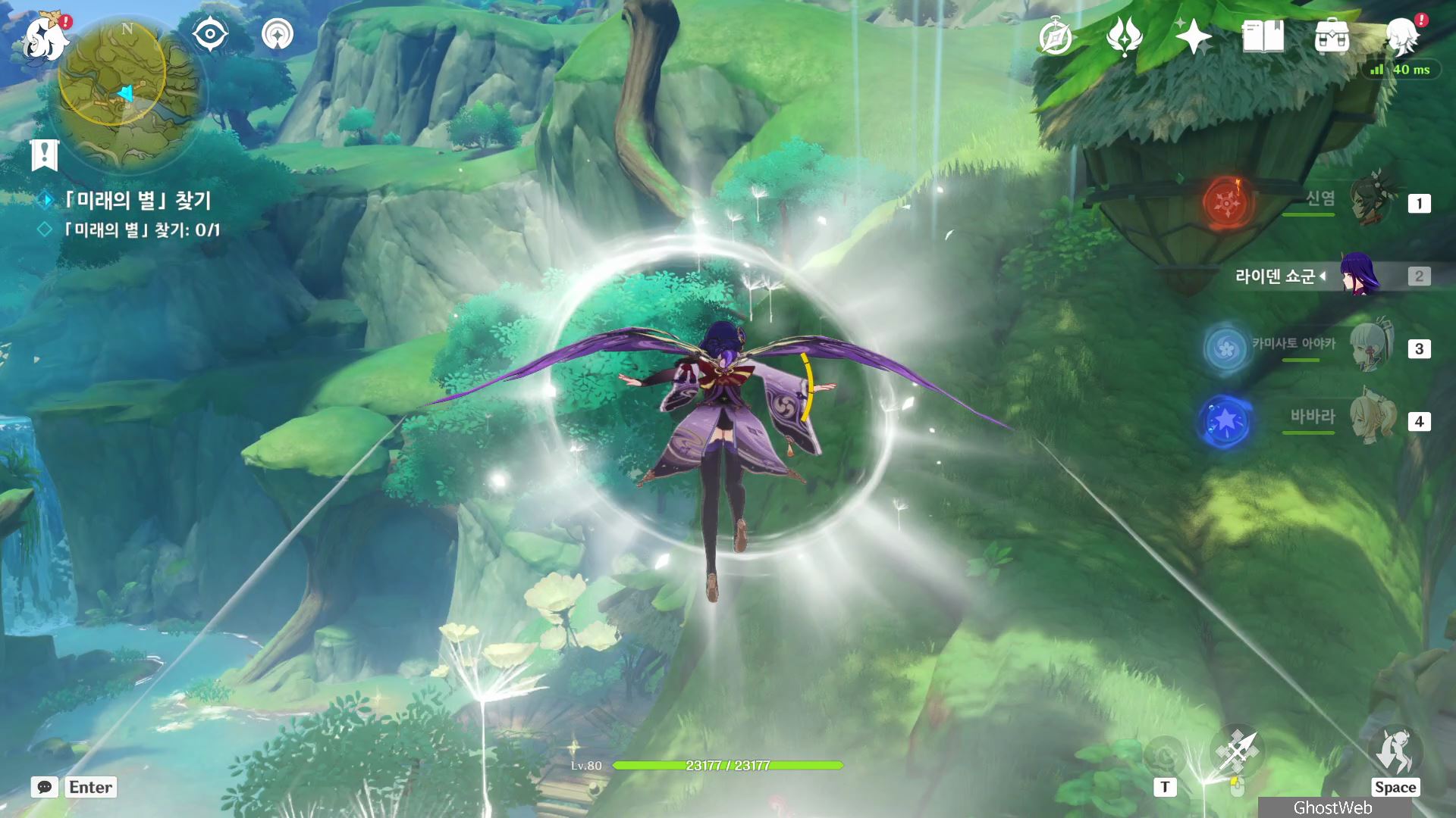 비행을 하다 가면 절벽에 황금색으로 빛나는 포인트가 시작점인데, 앞서 3번째에서 보았던 날아다니는 씨앗이 공중을 비행하고 있는데, 해당 씨앗을 번개 원소 캐릭터(리사, 피슬, 라이덴 쇼군 등 번개 원소 캐릭터를 이용)로 원소 공격을 가하면 안보이던 있던 길이 나타나요.