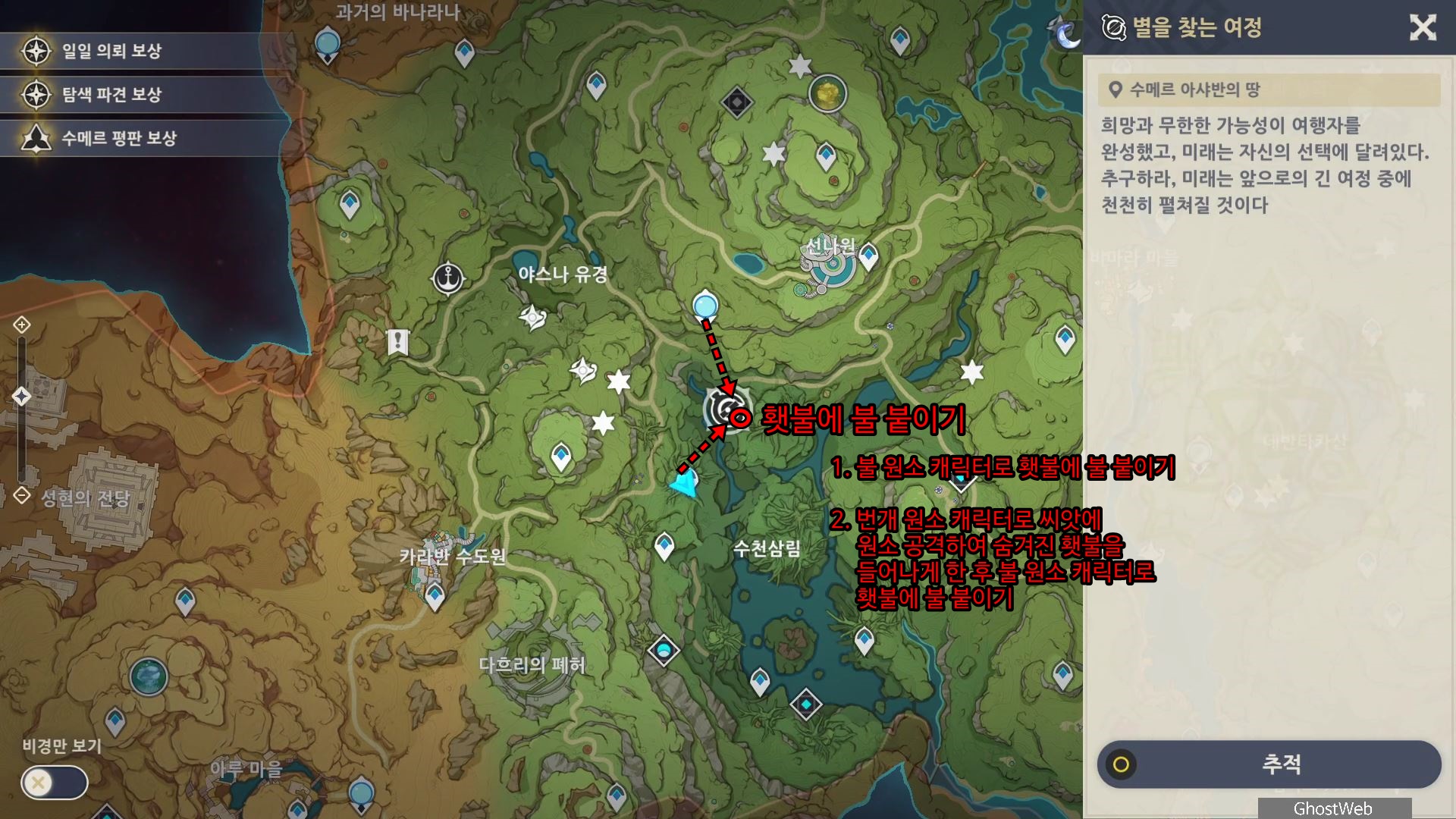 이동 후, 공중을 날라다니는 씨앗이 있는데, 이 씨앗이 숨겨진 횃불 2개에 다가가면 파랗게 보이면서 씨앗이 횃불 근처에 왔을 때 번개 원소 캐릭터로 씨앗을 원소 공격하면 횃불이 눈에 보이며 이를 불 원소 캐릭터로 원소 공격(엠버 등)하여 횃불에 불을 붙이세요. (총 4개)