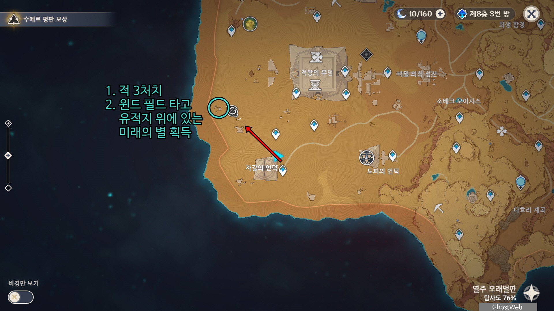 수메르 사막 지역에서 아루 마을 기준 6시 아래에 있는 <수메르 하 바람 침식지 워프 포인트로>로 이동한 다음 지도에 표시되는 곳으로 이동/비행하세요. (바누의 지혜를 사용하여 포인트 찾기)