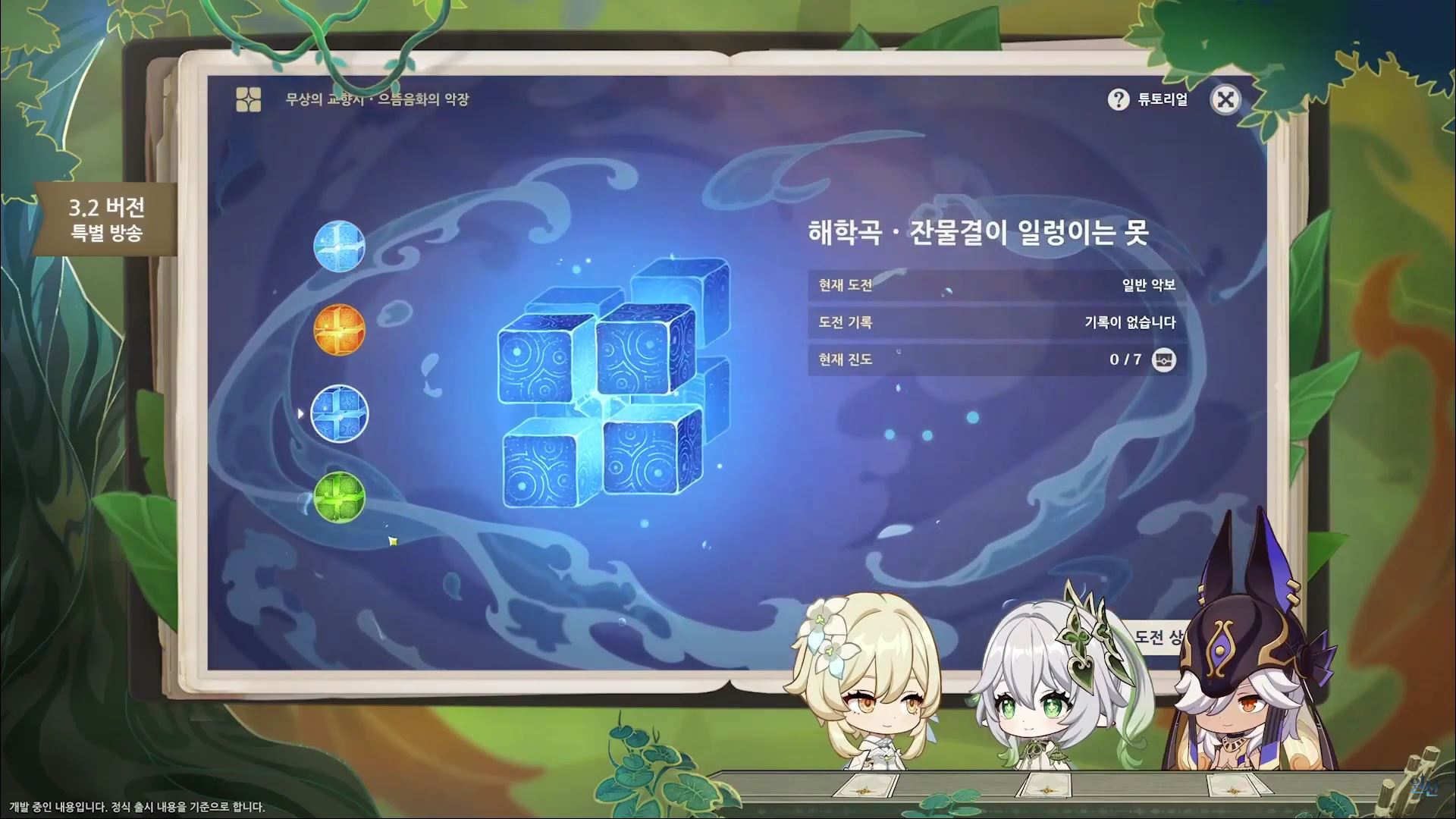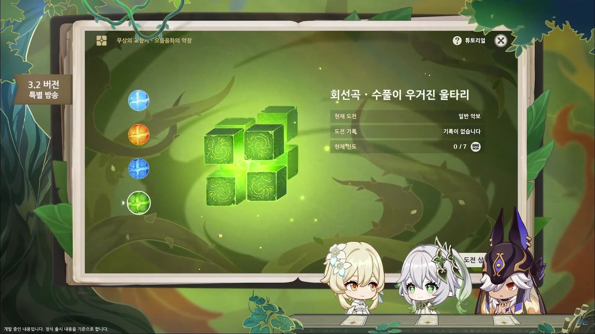 - 보상 : 도리 초대, 지식의 왕관, 원석, 특성 육성 소재, 캐릭터 돌파 소재, 모라, 캐릭터 경험 소재, 정제용 마법 광물
