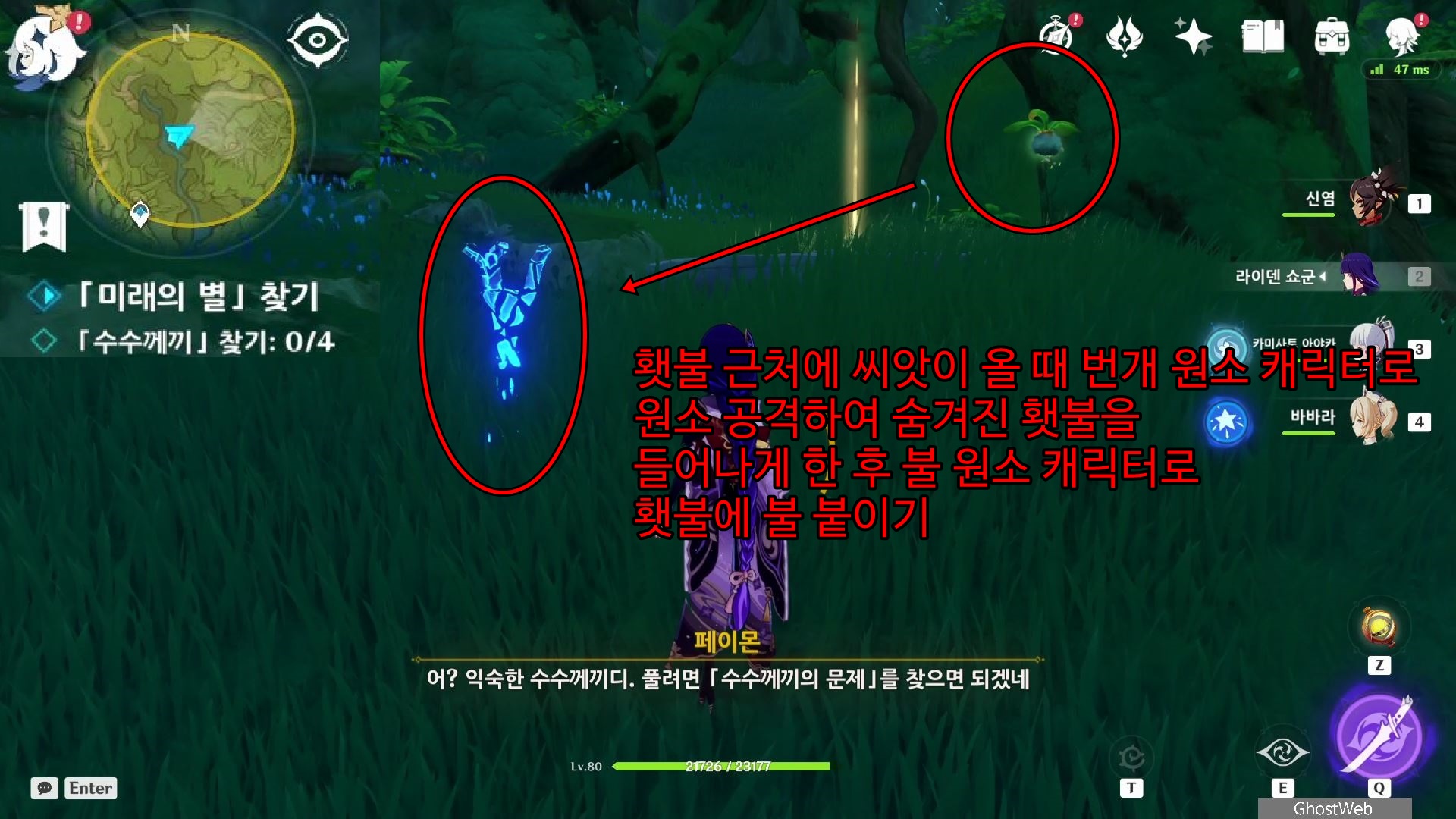 이동 후, 공중을 날라다니는 씨앗이 있는데, 이 씨앗이 숨겨진 횃불 2개에 다가가면 파랗게 보이면서 씨앗이 횃불 근처에 왔을 때 번개 원소 캐릭터로 씨앗을 원소 공격하면 횃불이 눈에 보이며 이를 불 원소 캐릭터로 원소 공격(엠버 등)하여 횃불에 불을 붙이세요. (총 4개)