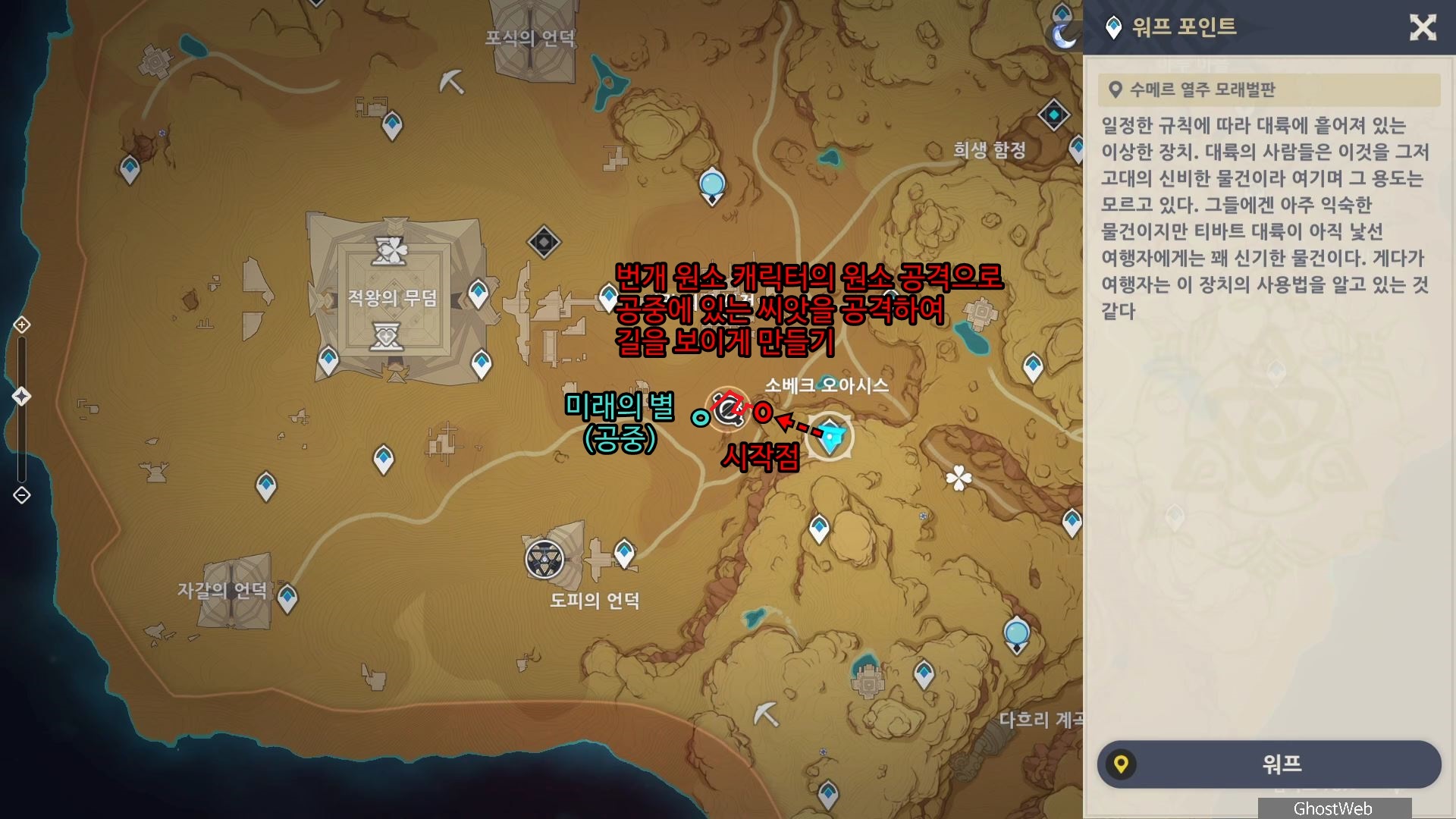 수메르 사막 지역에서 아루마을 기준 대략 서남쪽(7~8시 방향)에 있는 <소베크 오아이스 워프 포인트>로 이동한 다음 지도에 표시되는 곳으로 비행하세요.