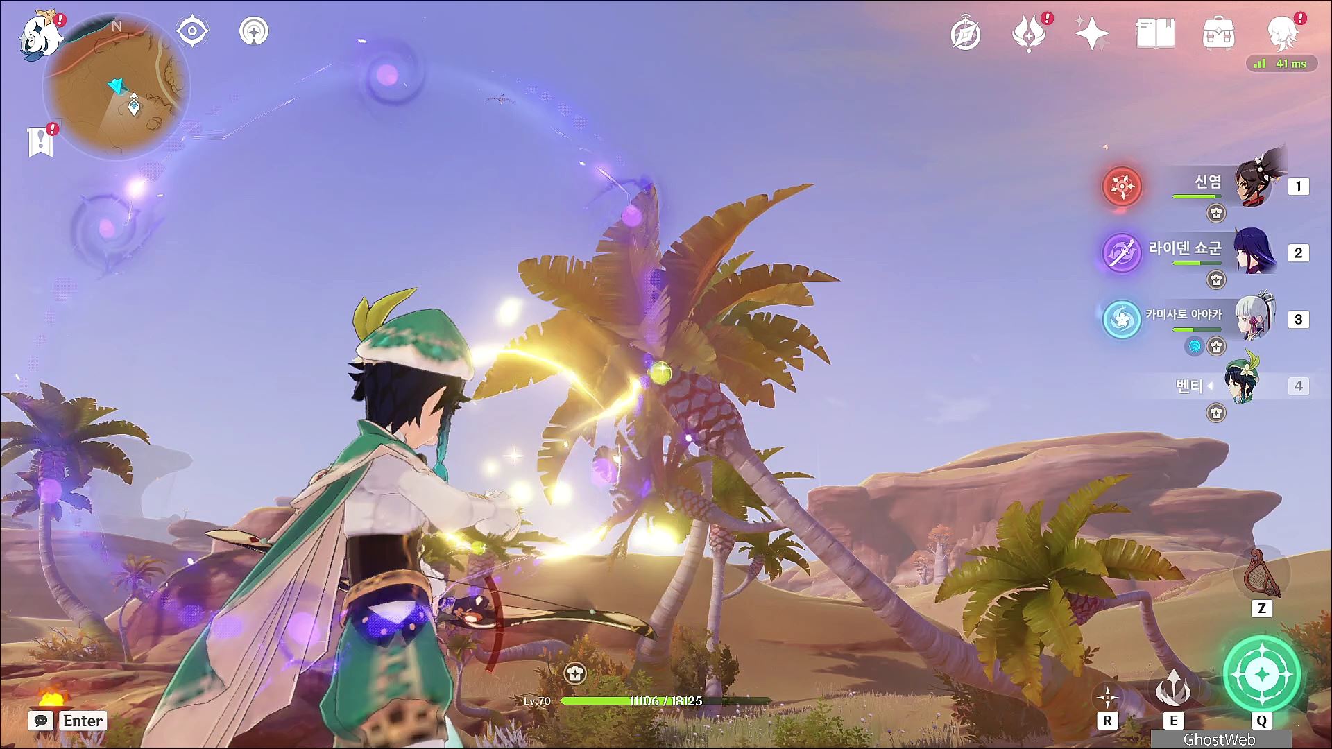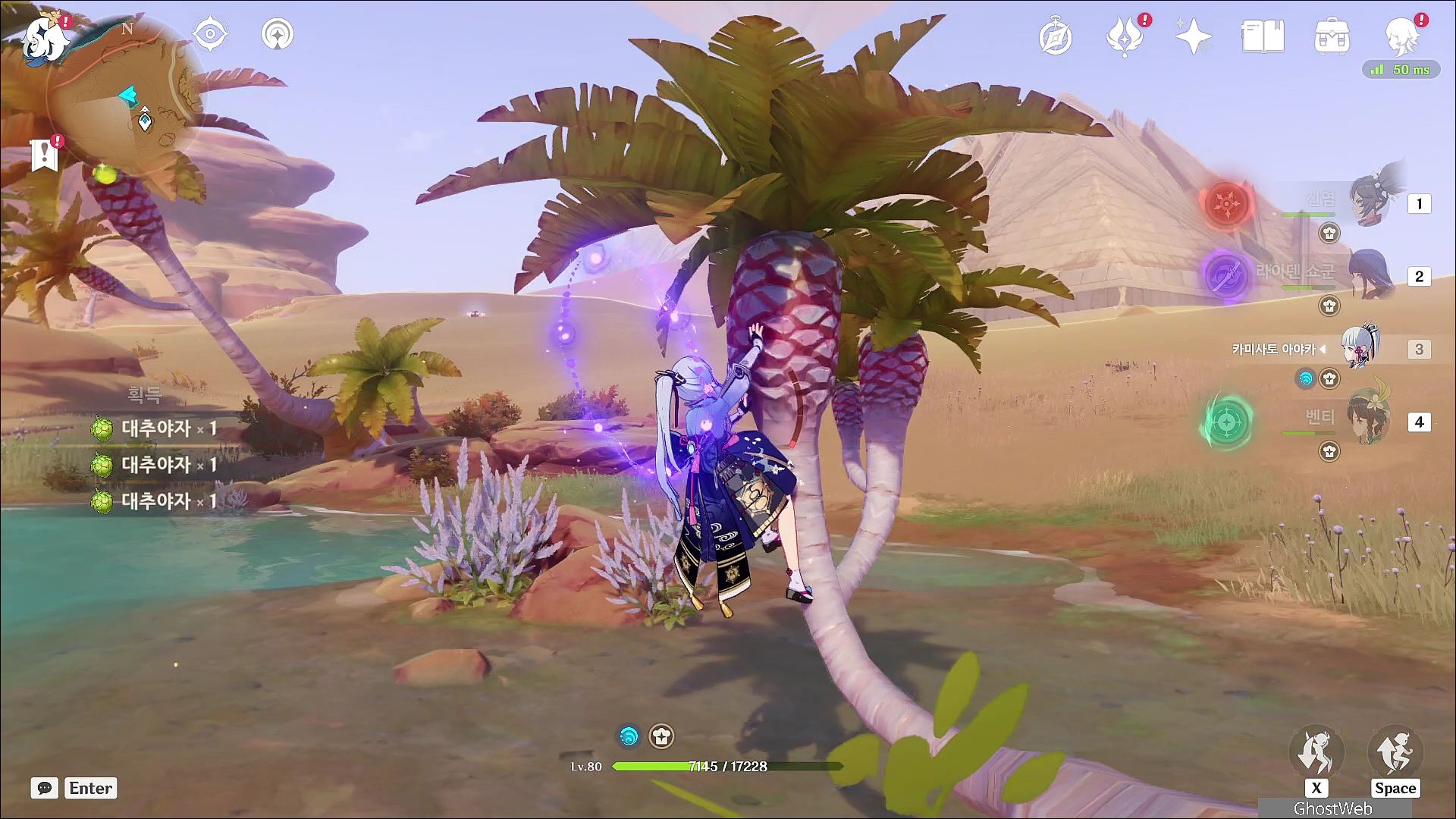 나무 꼭대기에 달려 있는 대추야자는 활 캐릭터의 조준 사격으로 대추야자를 맞추면 나무에서 떨어져 편하게 파밍할 수 있어요. (수메르 사막 오아시스 채집)