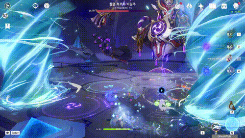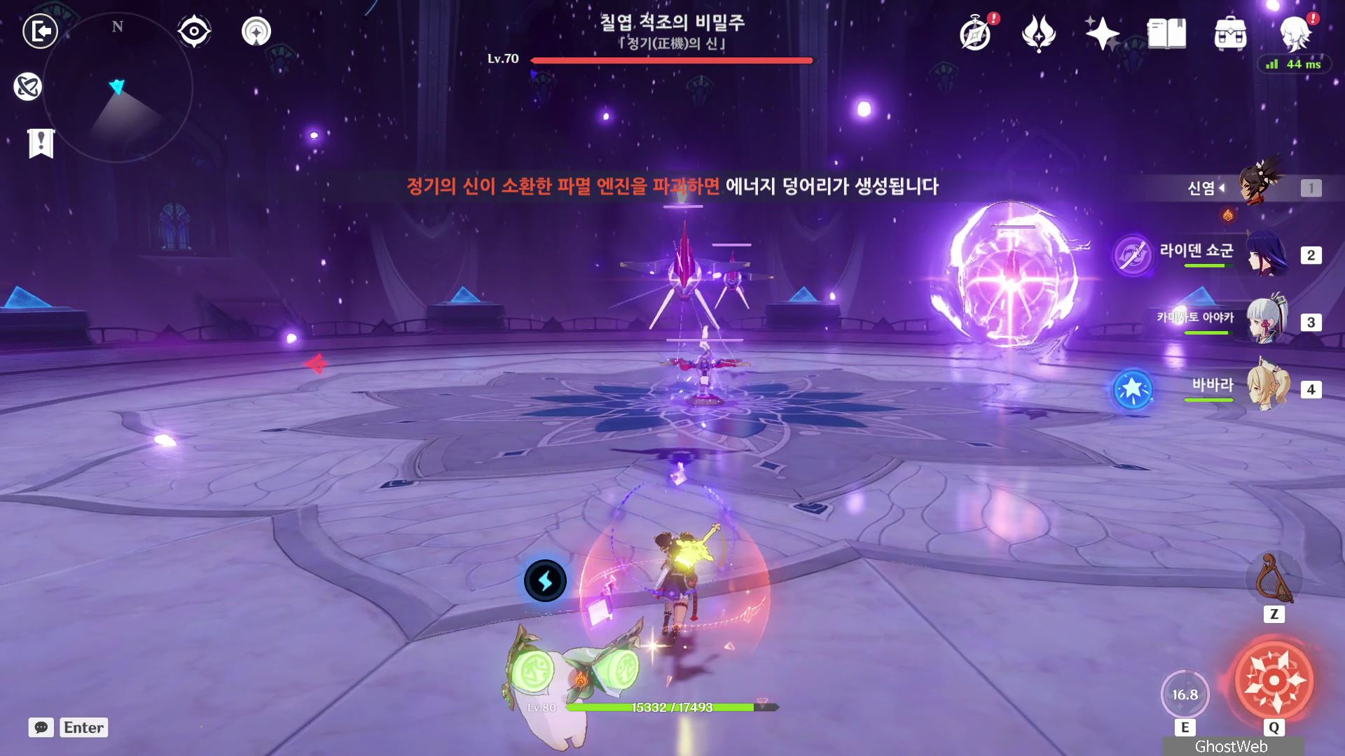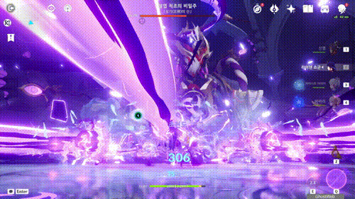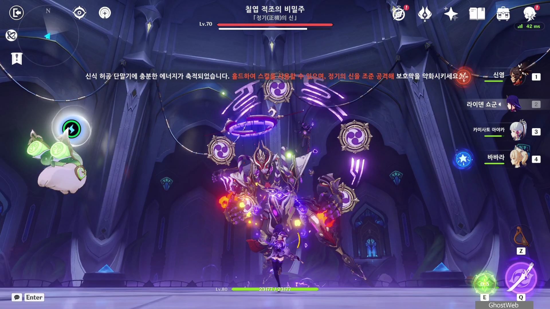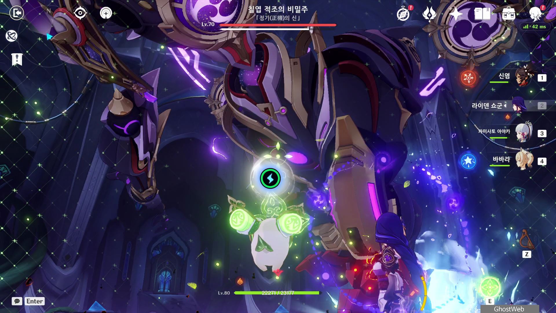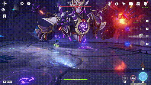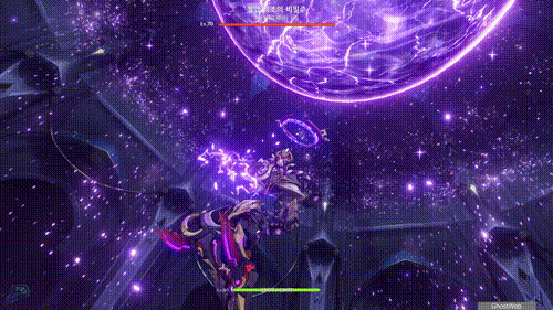 T 키를 눌러 지점간 이동이 가능하며, 허공 단말기에 에너지가 충전되면 E키를 홀드하여 스카라무슈 조준하여 공격을 날려 스카라무슈의 보호막을 제거하세요.