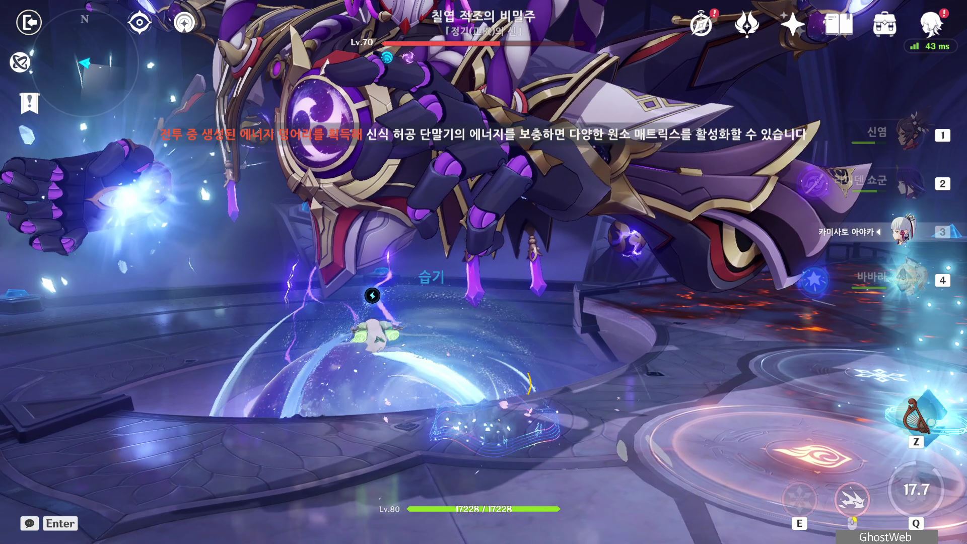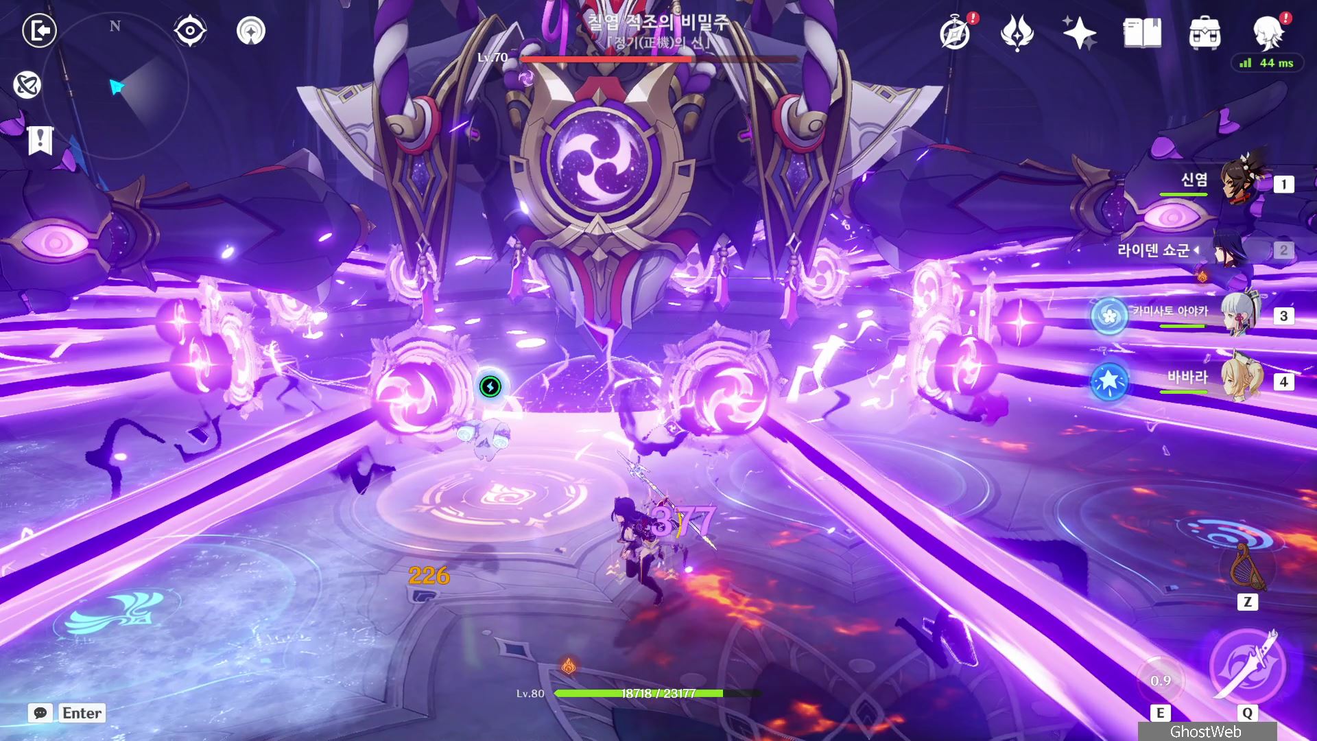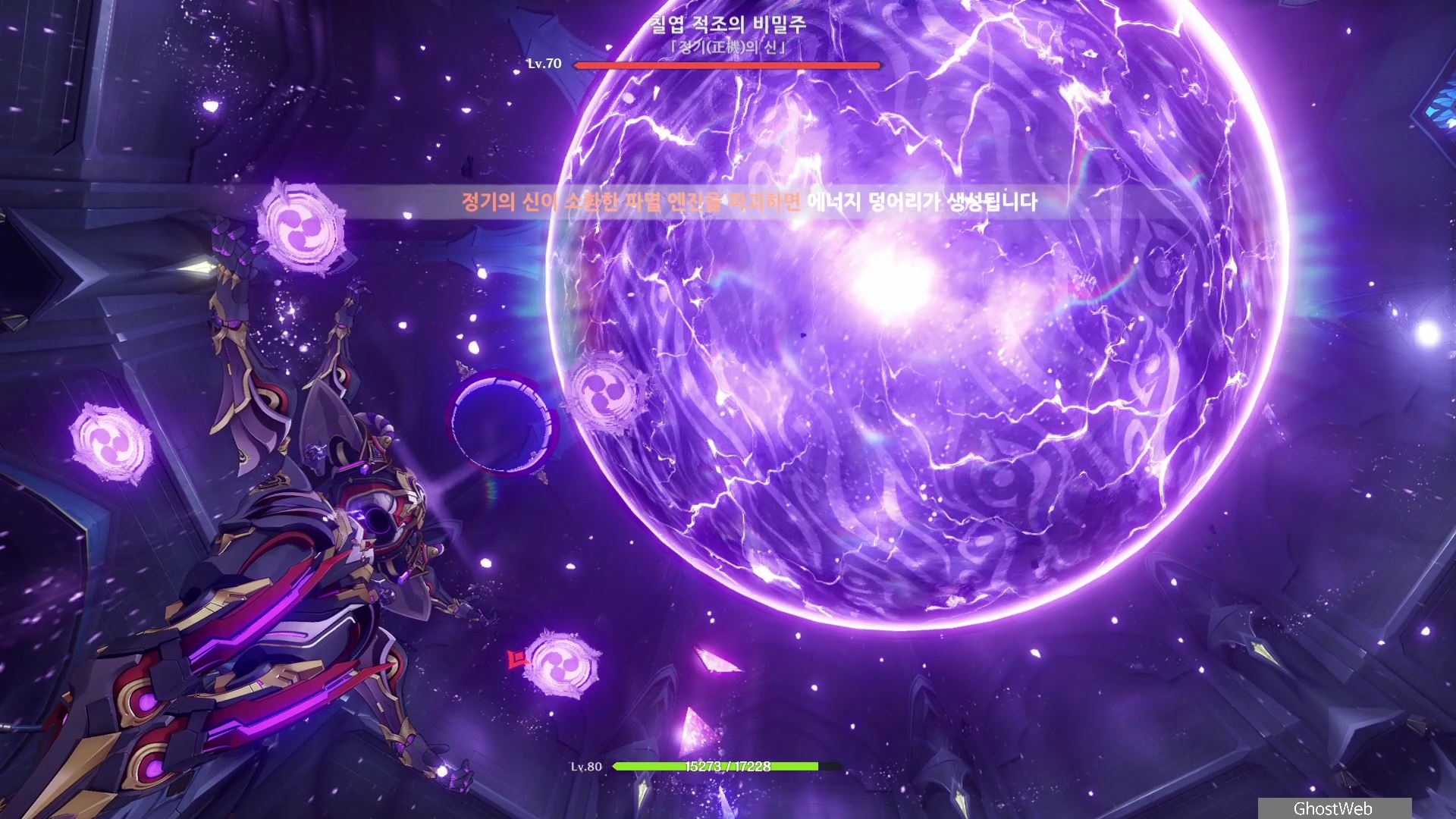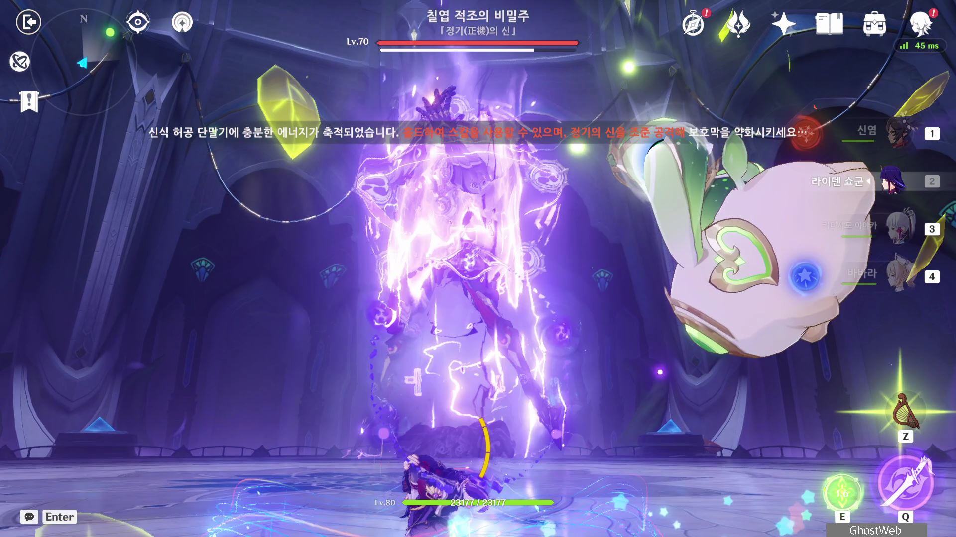 T 키를 눌러 지점간 이동이 가능하며, 허공 단말기에 에너지가 충전되면 E키를 홀드하여 스카라무슈 조준하여 공격을 날려 스카라무슈의 보호막을 제거하세요.