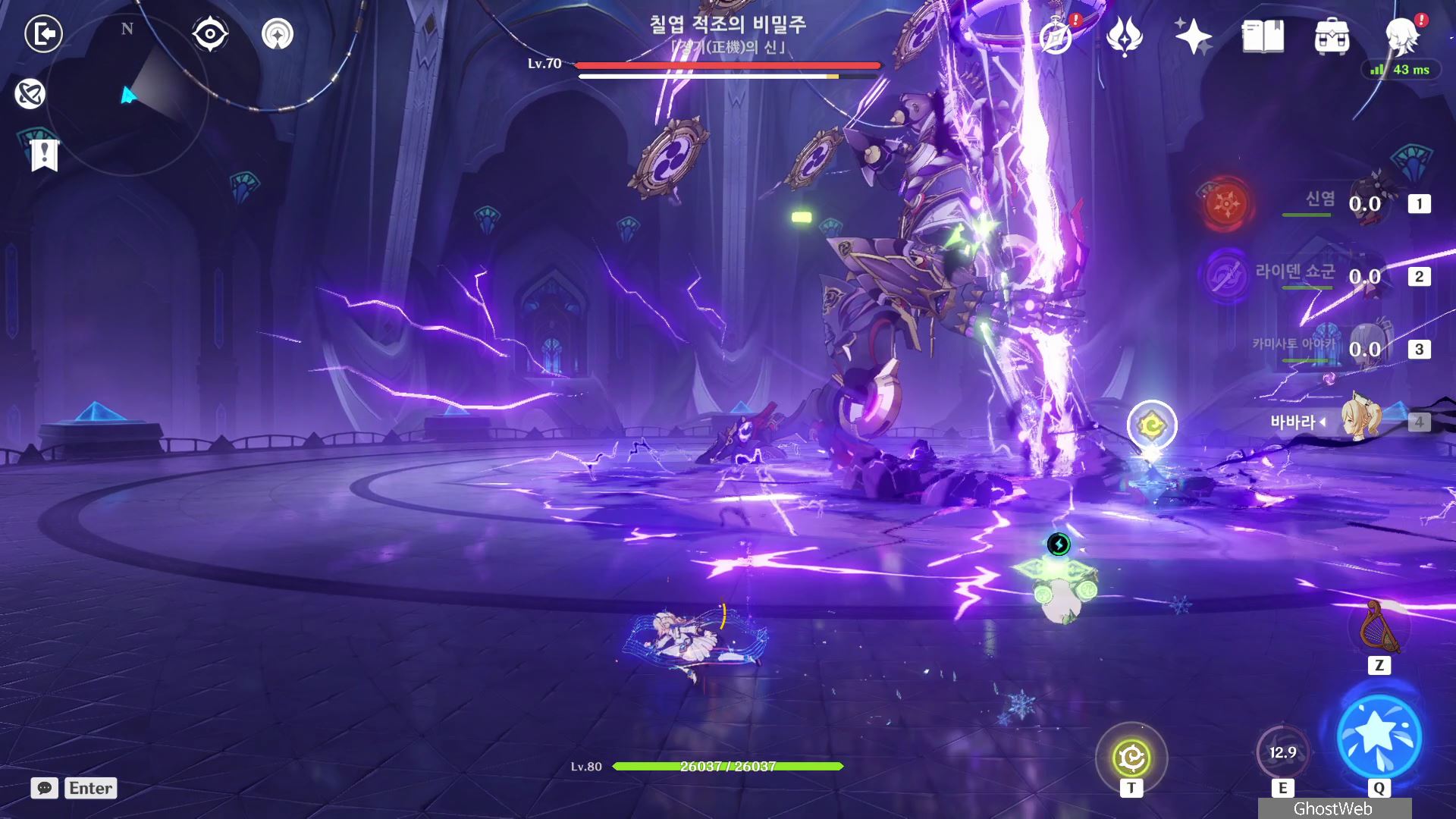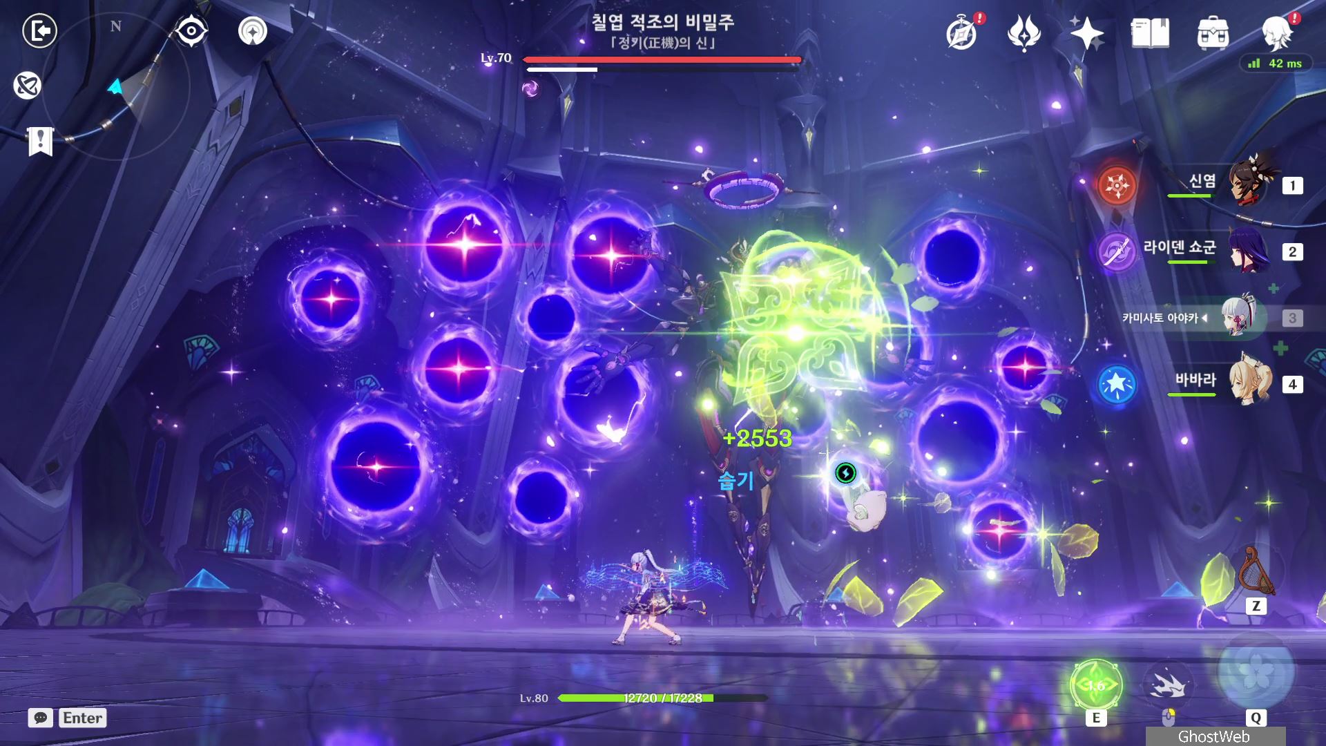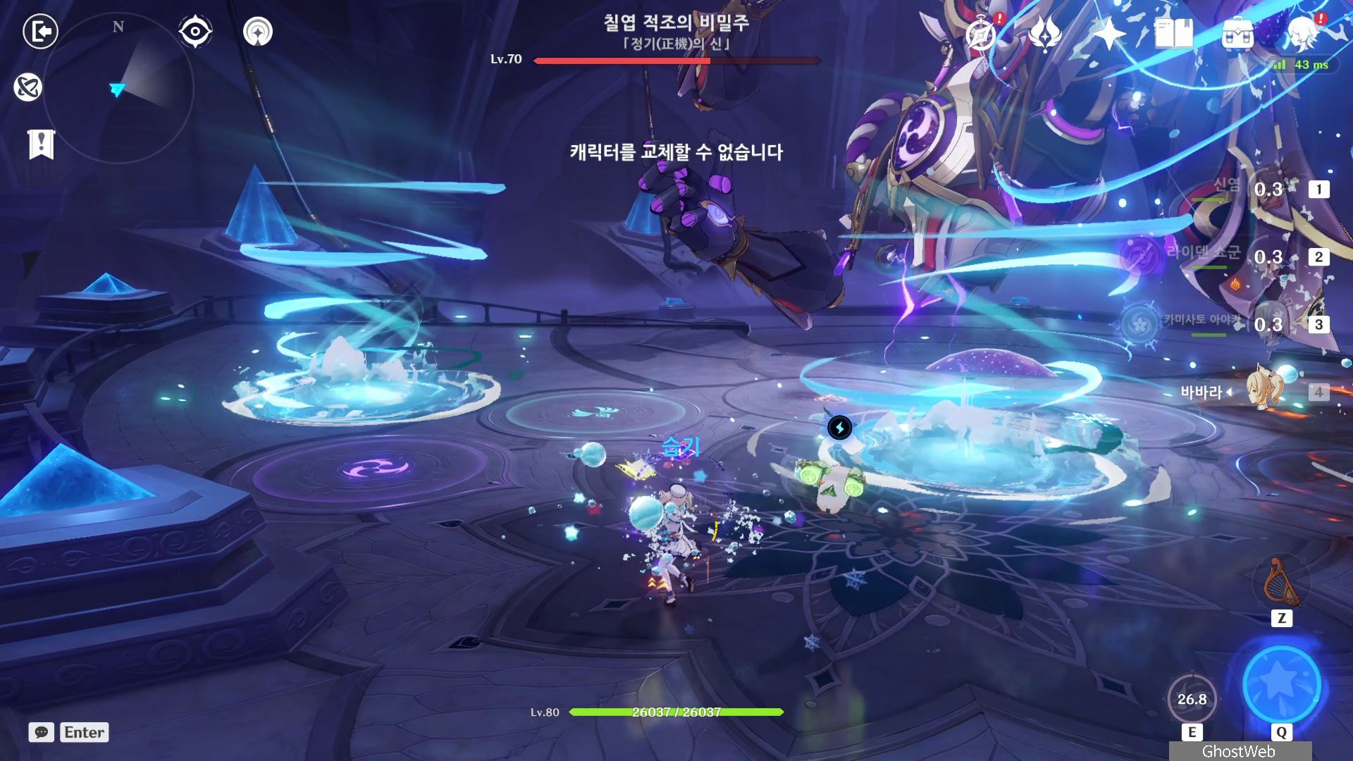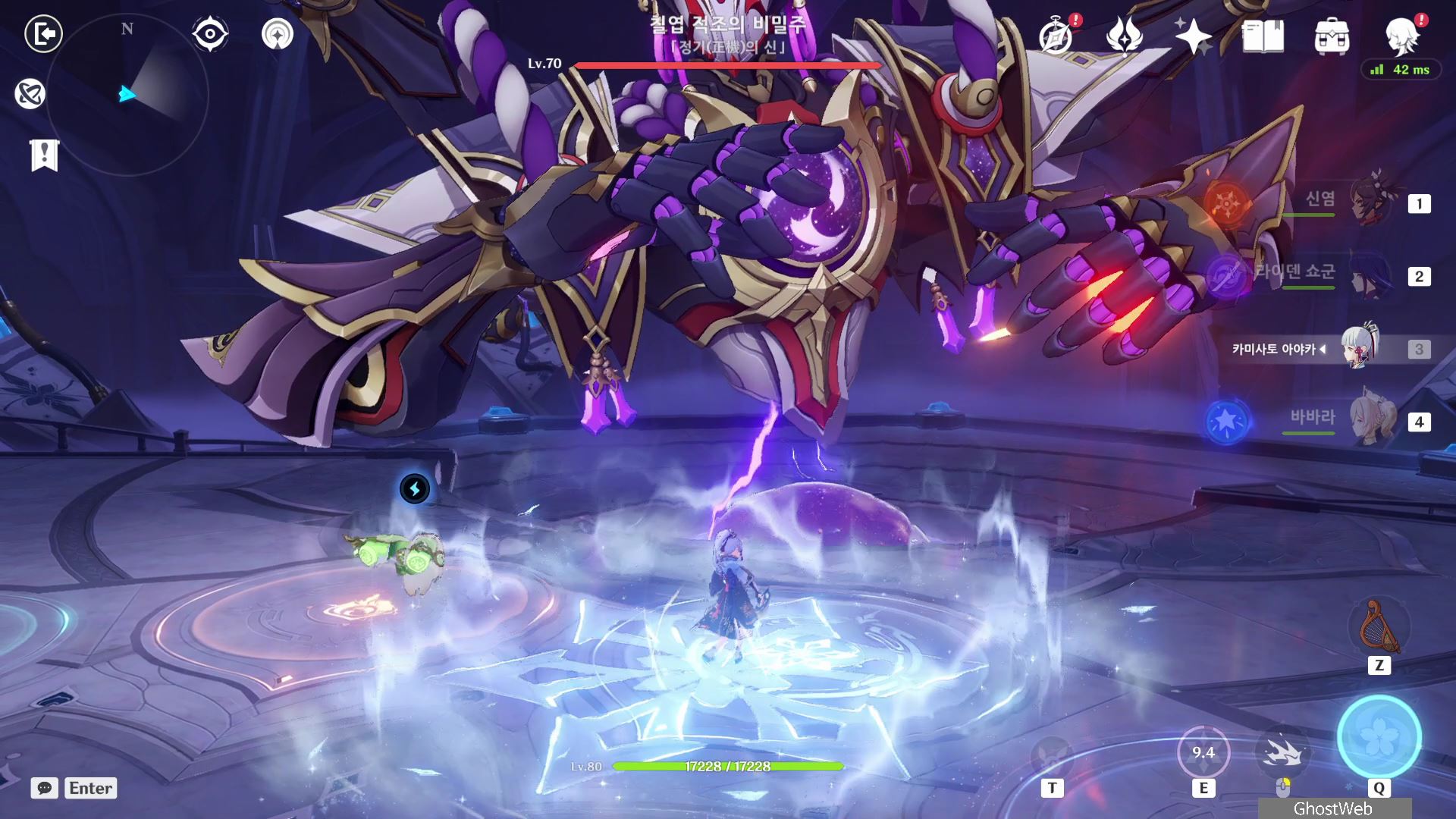 T 키를 눌러 지점간 이동이 가능하며, 허공 단말기에 에너지가 충전되면 E키를 홀드하여 스카라무슈 조준하여 공격을 날려 스카라무슈의 보호막을 제거하세요.