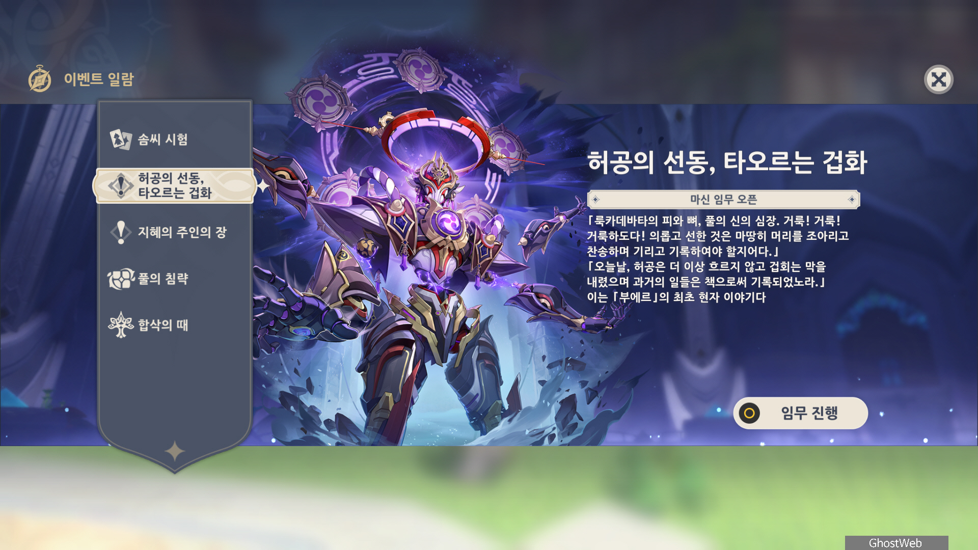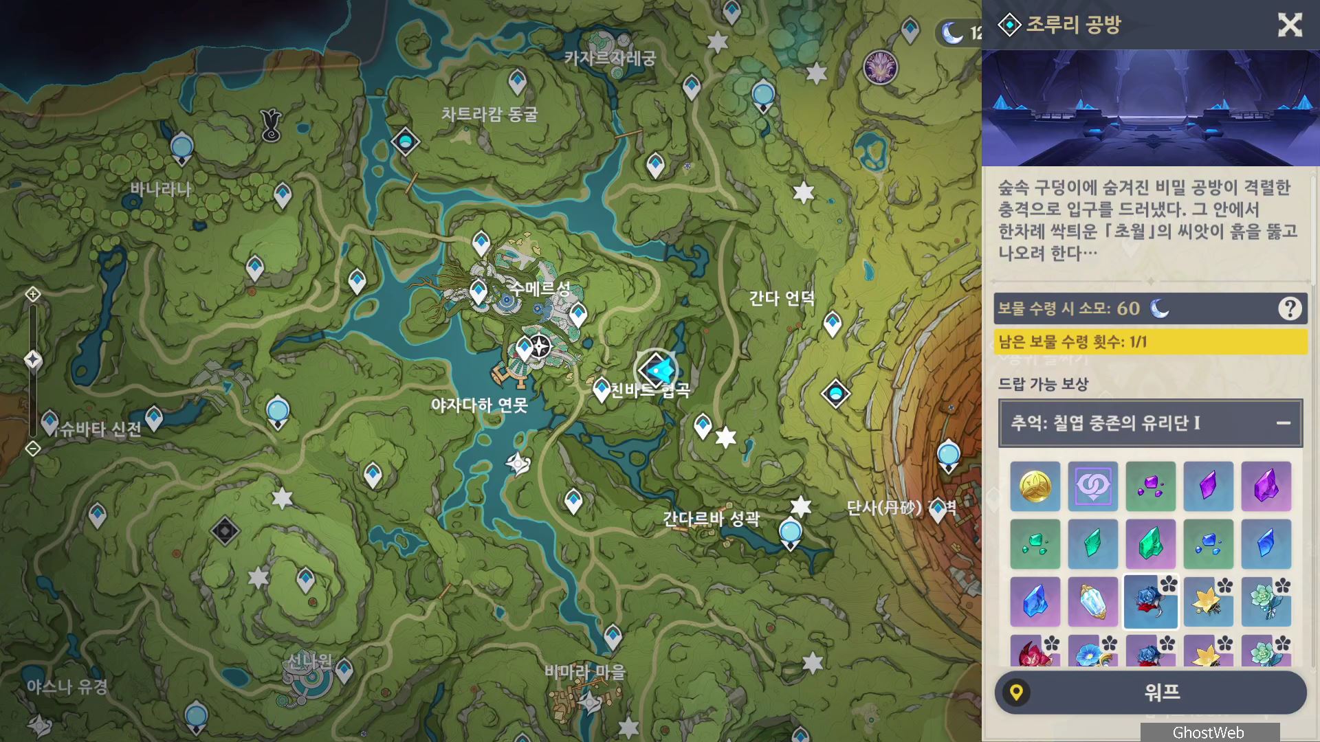 이번에는 나히다의 육성 소재를 얻을 수 있는 <조루리 공방 - 스카라무슈 / 칠엽 적조의 비밀주> 비경에 대해서 정리해보도록 할게요.